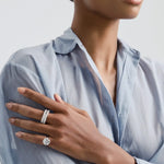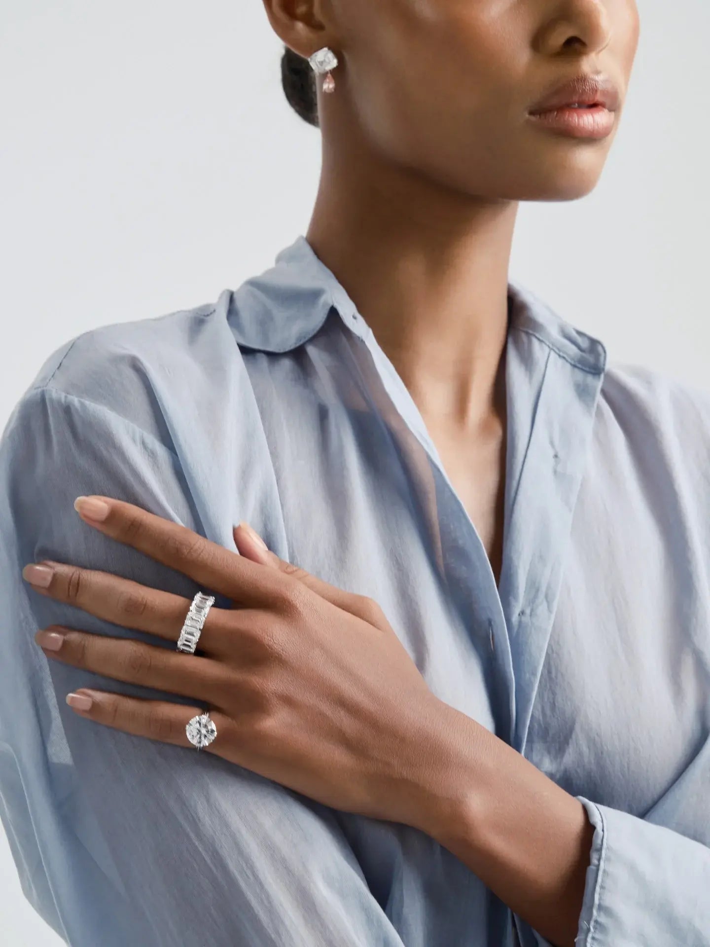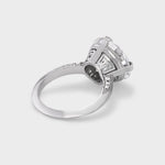 A 5 carat brilliant-cut round lab-grown diamond set in platinum, accented with 0.42ctw pavé stones along the basket and band. The setting features an engraved Greek key motif—an architectural detail that adds structure, symbolism, and depth to the piece. Best when worn on the pinky or middle finger. The vibe is won it at an auction.