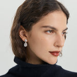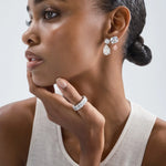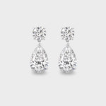 Welcome to my gala: 16 carats total featuring two classic cuts: each ear holds 2 carat brilliant round stones at the lobe, with a 6 carat pear-shaped drop hanging down. Set in 14k white gold with minimal prongs to emphasize scale and sparkle. Available to purchase as a single earring, or as a traditional pair.