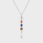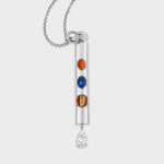 Sterling silver scroll holder and chain, inlaid with jasper, tiger eye, and lapis lazuli. A 6-carat lab-grown, pear-shaped diamond drop swings below. The hinged top opens to hold whatever you consider sacred: a mezuza scroll, a note from your kid, a joint.