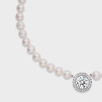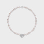 A 14" strand of cultured pearls, anchored by a round 4-carat diamond set in a brushed 14k white gold Greek-motif bezel. Slightly longer than a choker, it sits neatly along the collarbone.