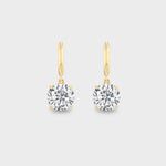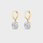 6 carats total of brilliant round-cut lab-grown diamonds, set in 14k yellow gold. Suspended from 14k gold huggie hoops, each 3 carat stone is held in a minimal prong setting that highlights the scale and sparkle. Available to purchase as a single earring, or as a traditional pair.