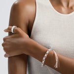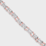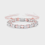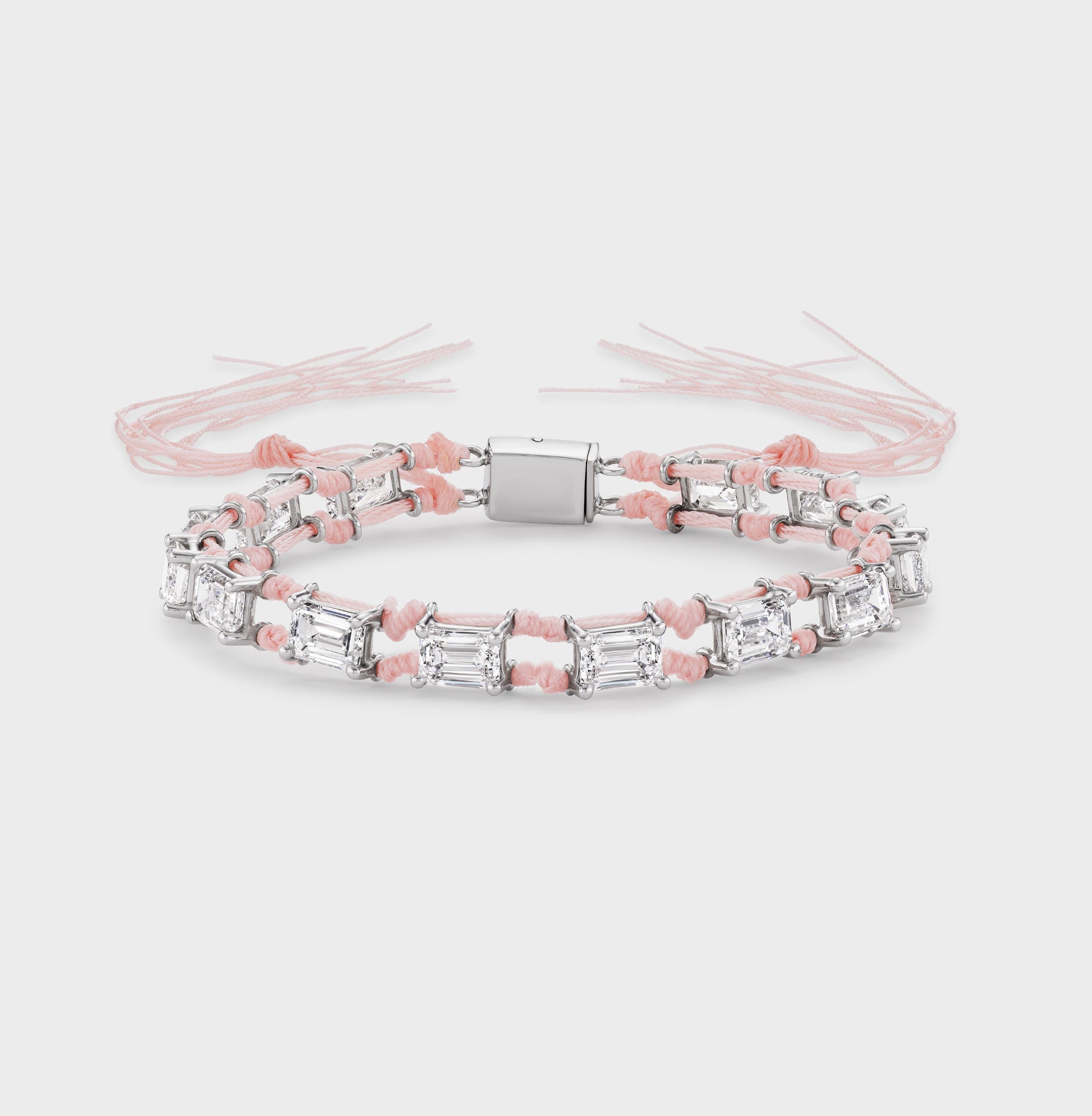 A 14 carat line of emerald-cut diamonds, woven into a set of soft rose-colored nylon cord and anchored by 14k white gold settings. Available in two lengths, to be worn as a bracelet or anklet, with or without string hanging down. Racquet string is the new tennis as far as bracelets go. Wear it with the Greek key and a black silk gown to pick up soda from the store down the road.