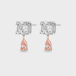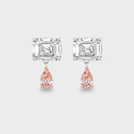 A 4 carat antique emerald-cut lab-grown diamond accompanied by a 1.53 carat pink pear-shaped drop, suspended from a mixed-metal setting of 14k white and rose gold. Available to purchase as a single earring, or as a pair. Not to be confused with pear.
