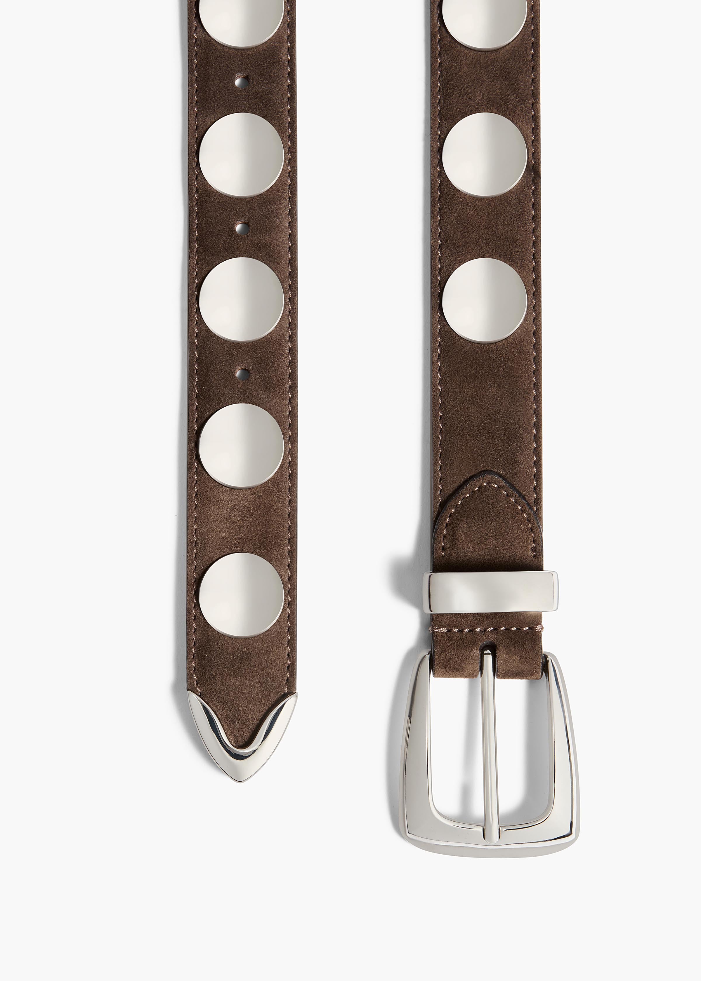 A refined, versatile belt made memorable by jewelry-like hardware—domed studs and a boldly formed buckle, loop, and tip—in palladium-plated brass.