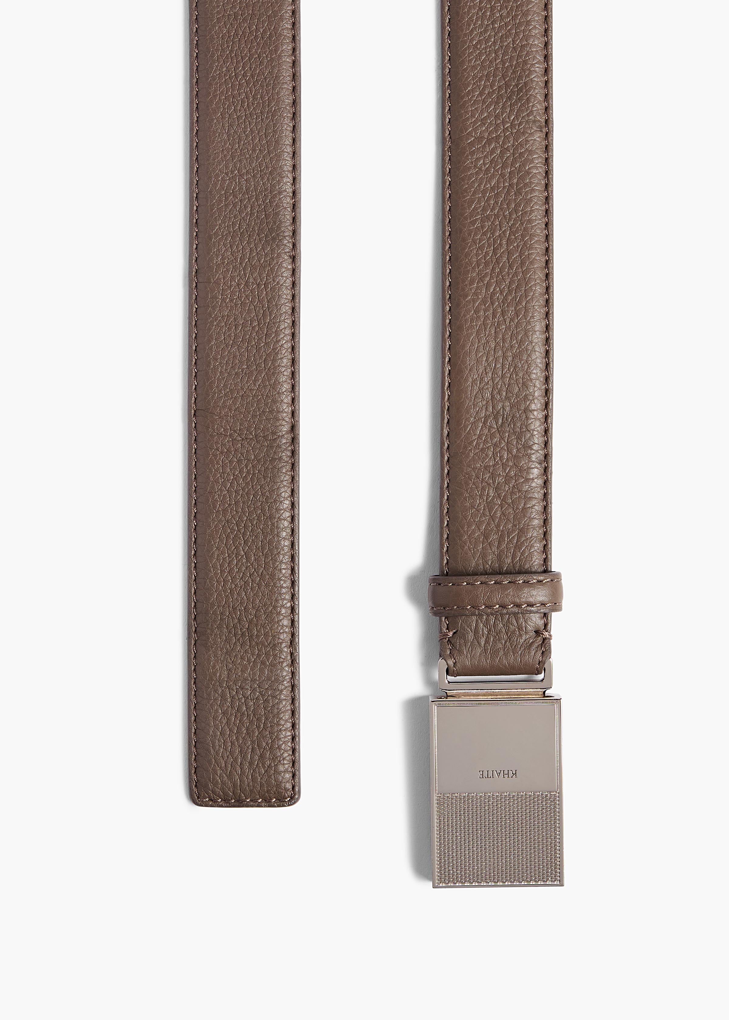 A clean-lined belt crafted in Italy of pebbled calfskin, with an engraved and textured buckle of palladium-plated brass.