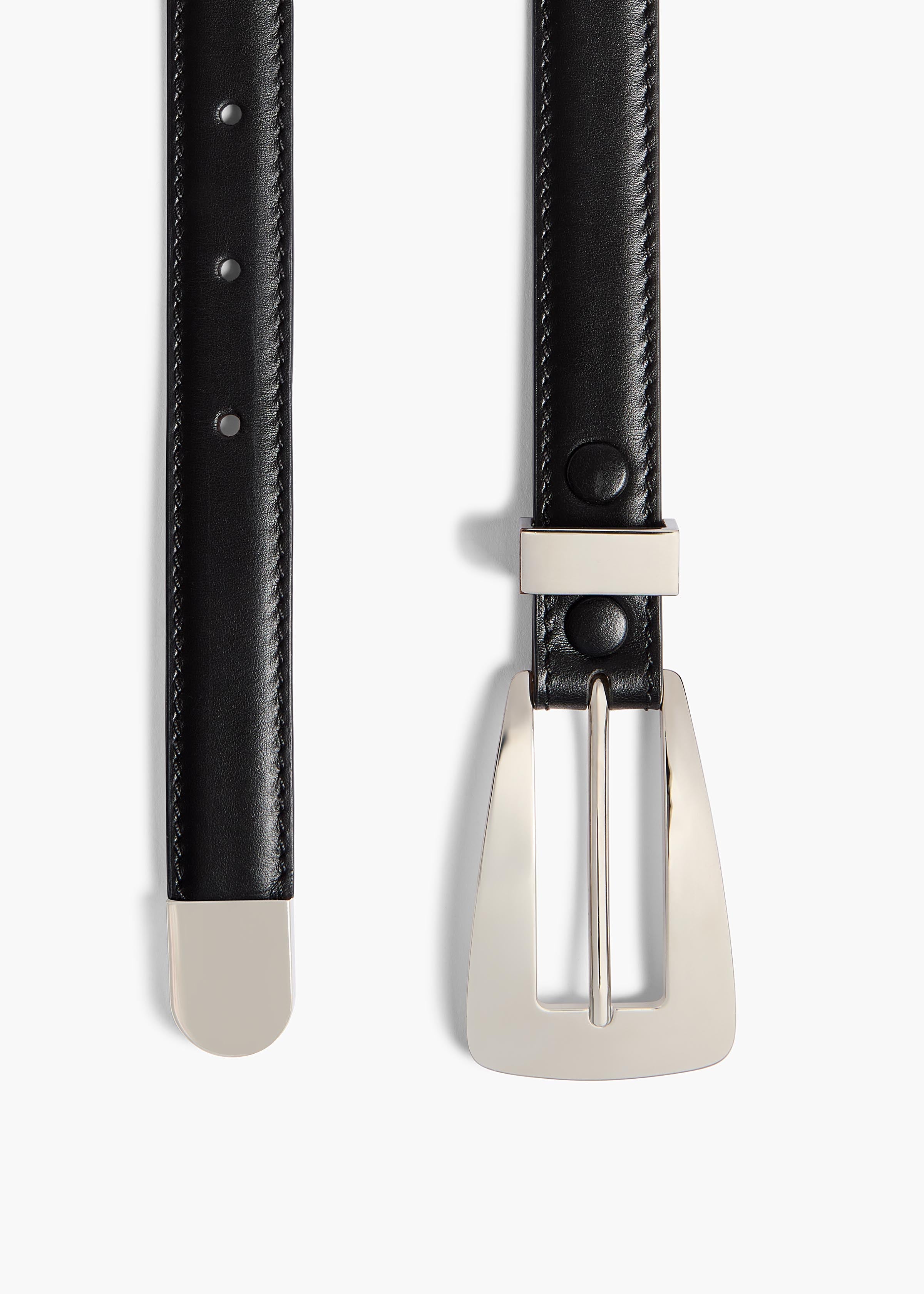 A sleek calfskin belt with an elongated trapezoidal buckle on a more compact scale. The polished, jewelry-grade hardware—buckle, loop, and curved tip—is made of palladium-plated brass.
