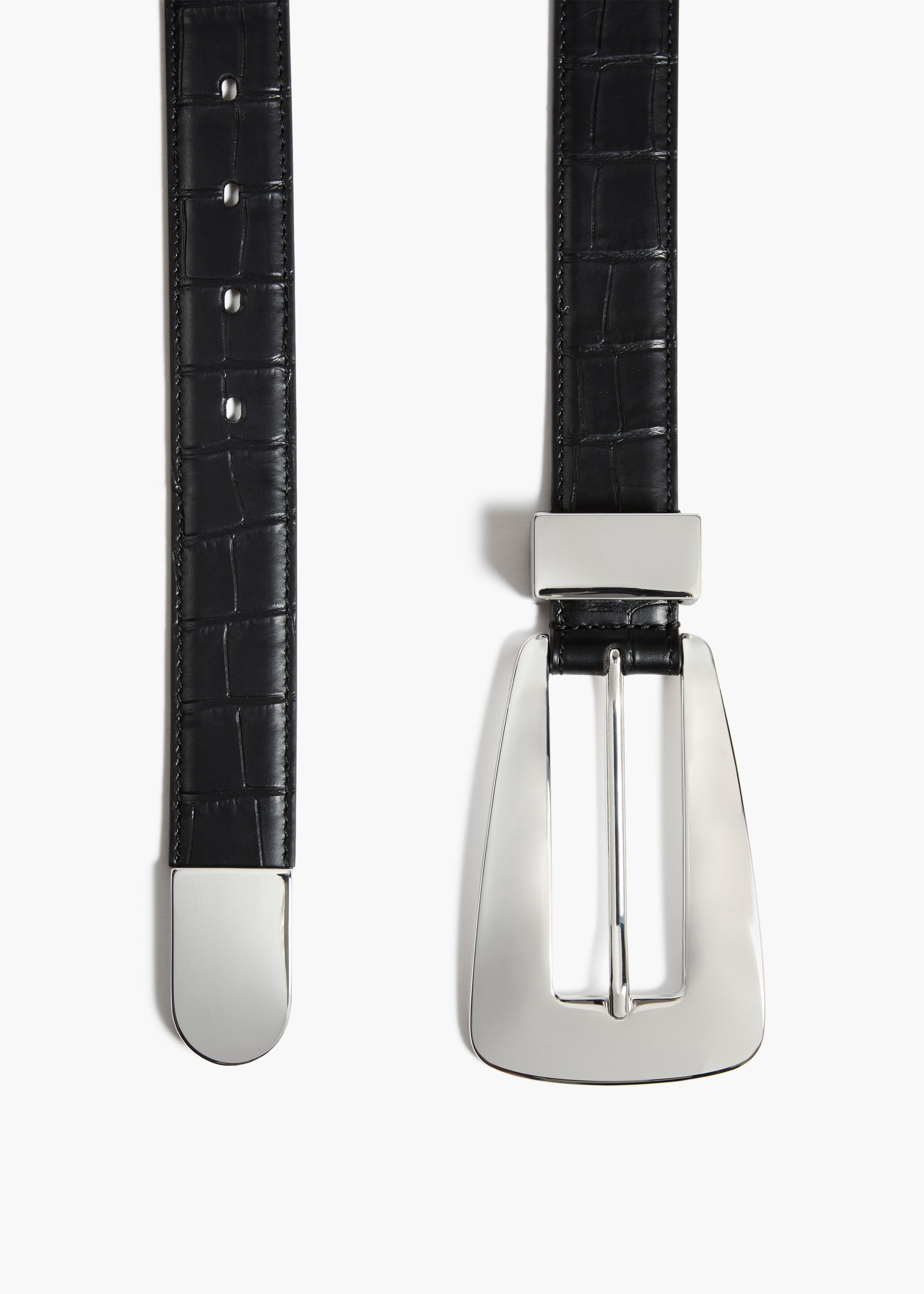 An embossed calfskin belt with an elongated trapezoidal buckle. The polished hardware‚ buckle, loop, and curved tip is crafted of palladium-plated brass.