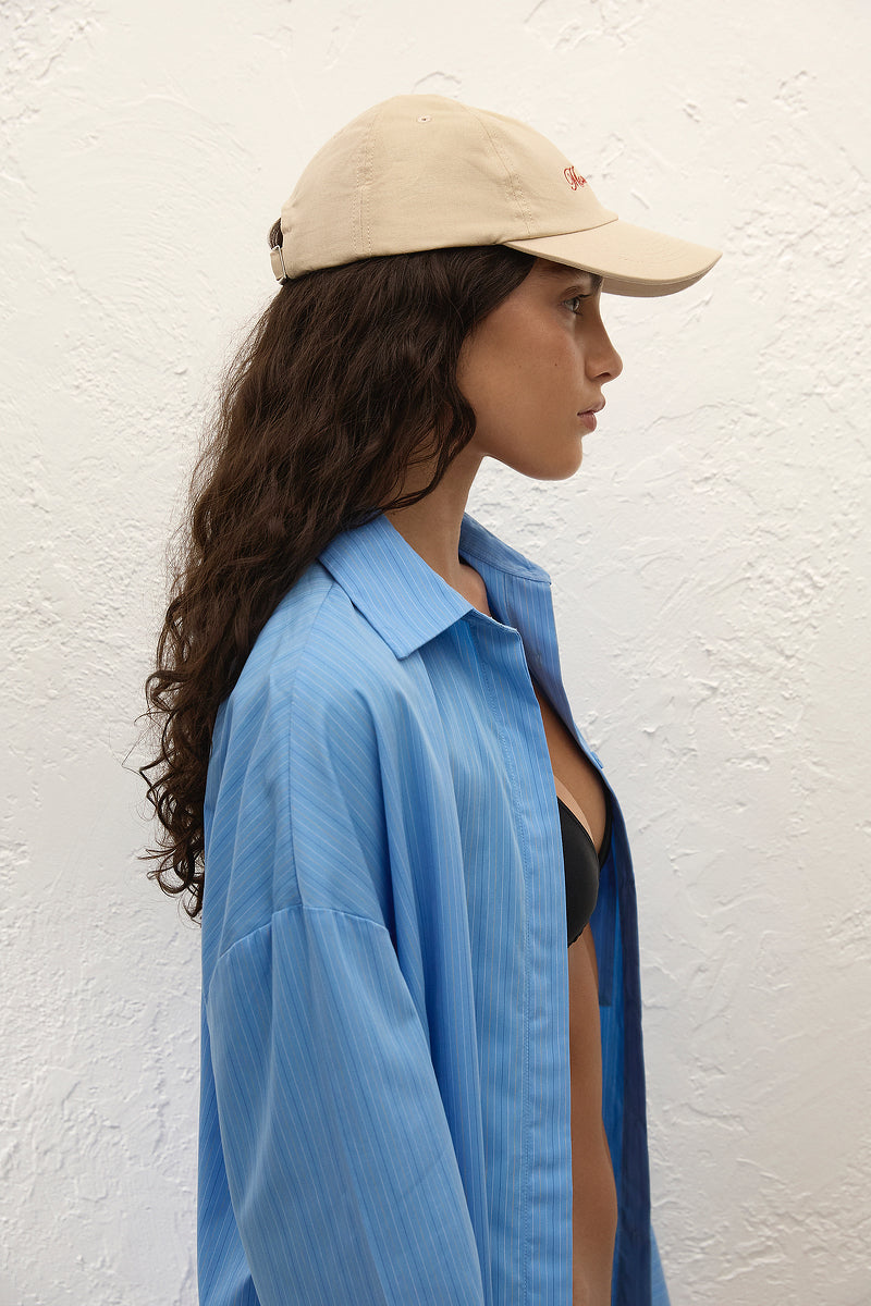 A classic beach cap, designed from 100% cotton in a creamy pannacotta shade. Embroidered across the front in a dusty tomato red is a nod to Mexico City, a beloved travel location.