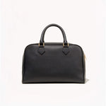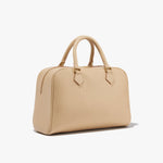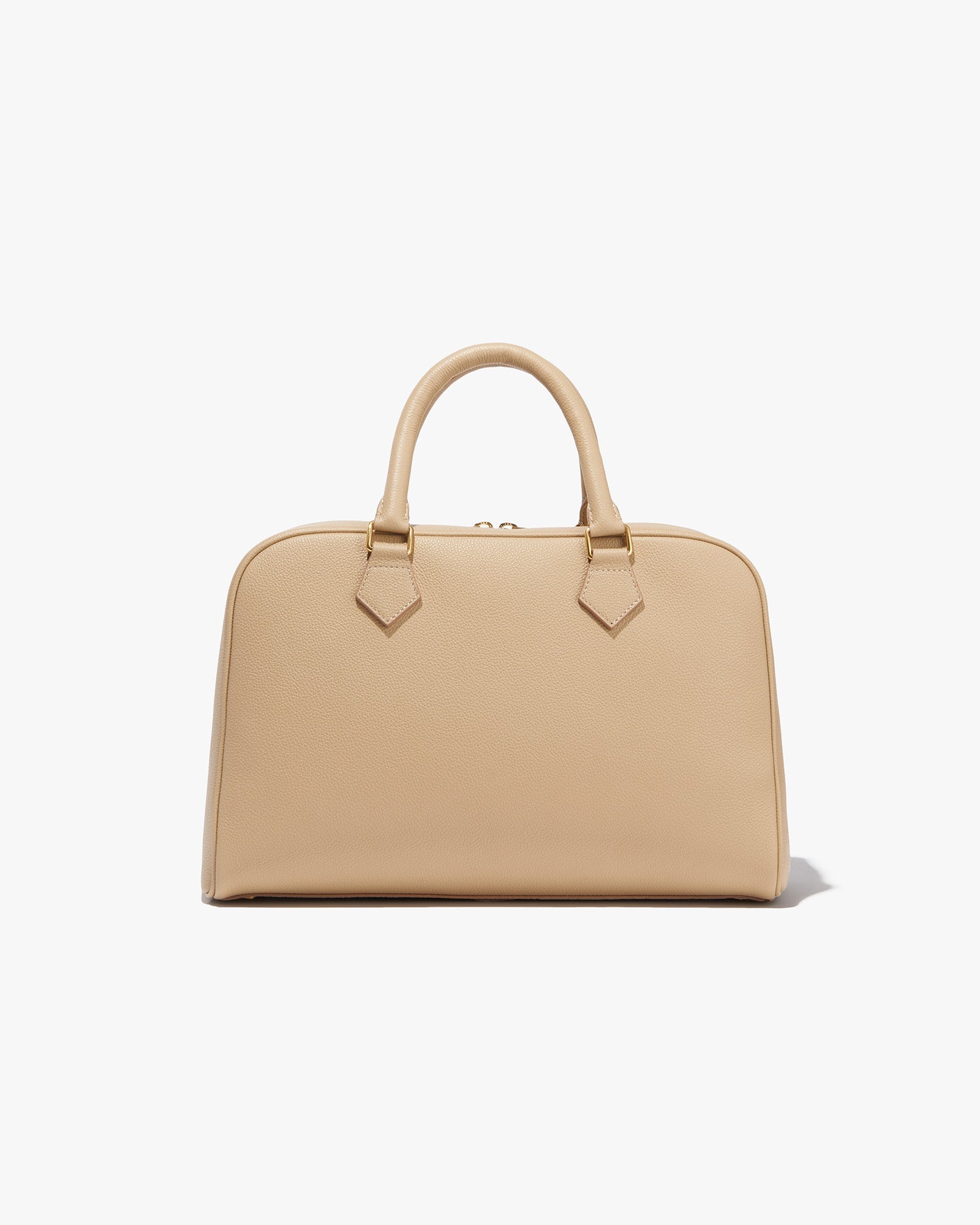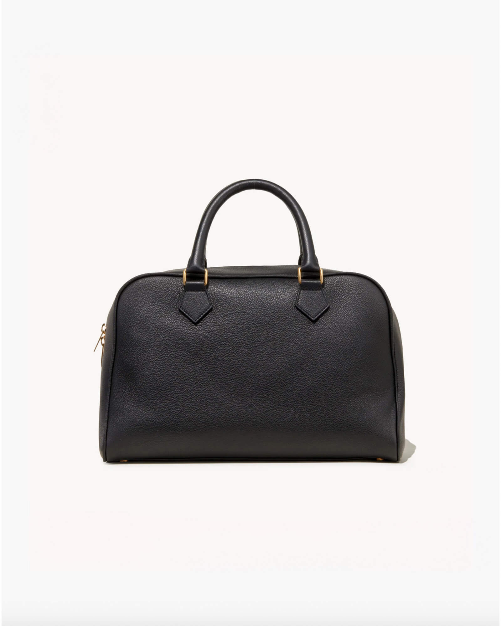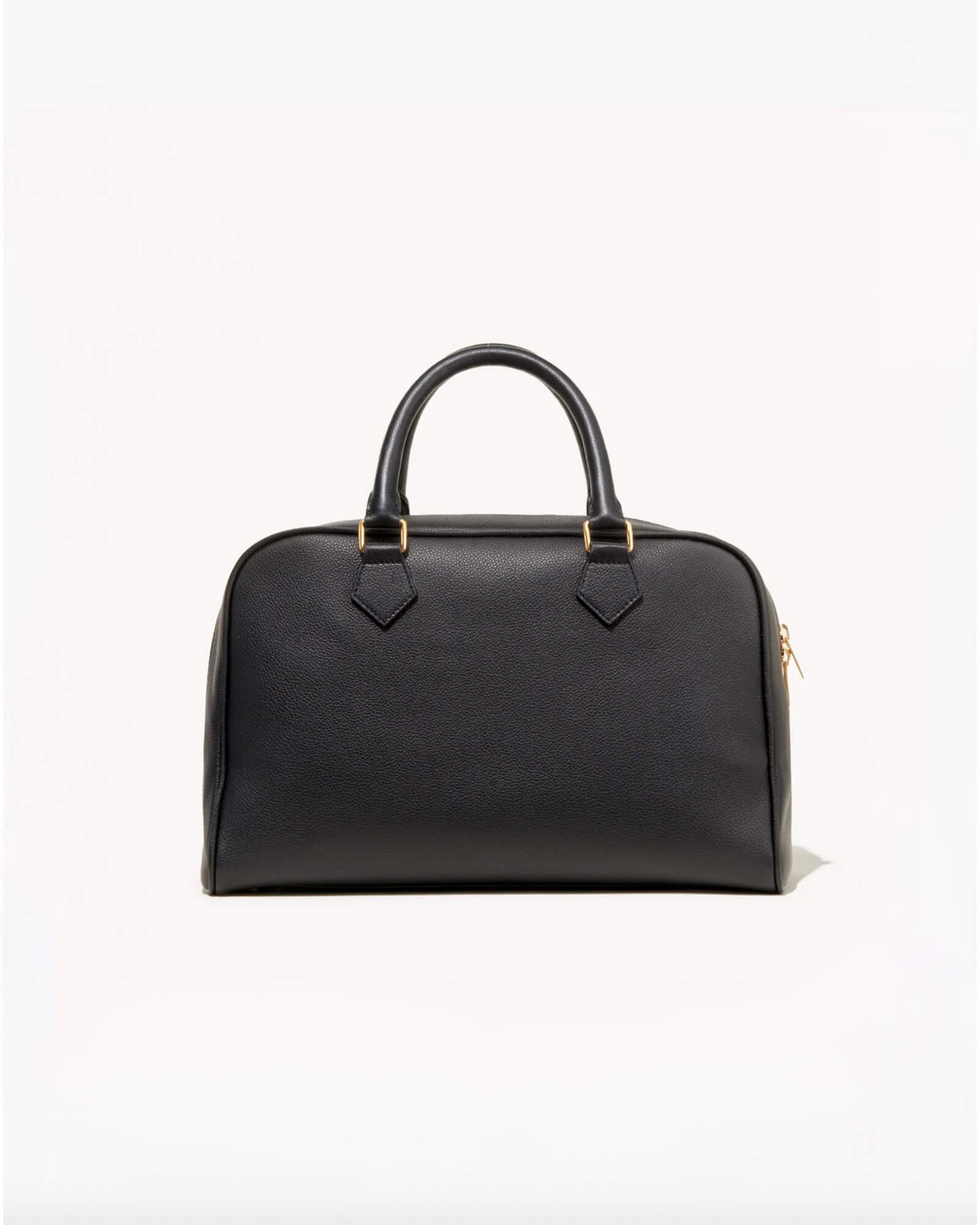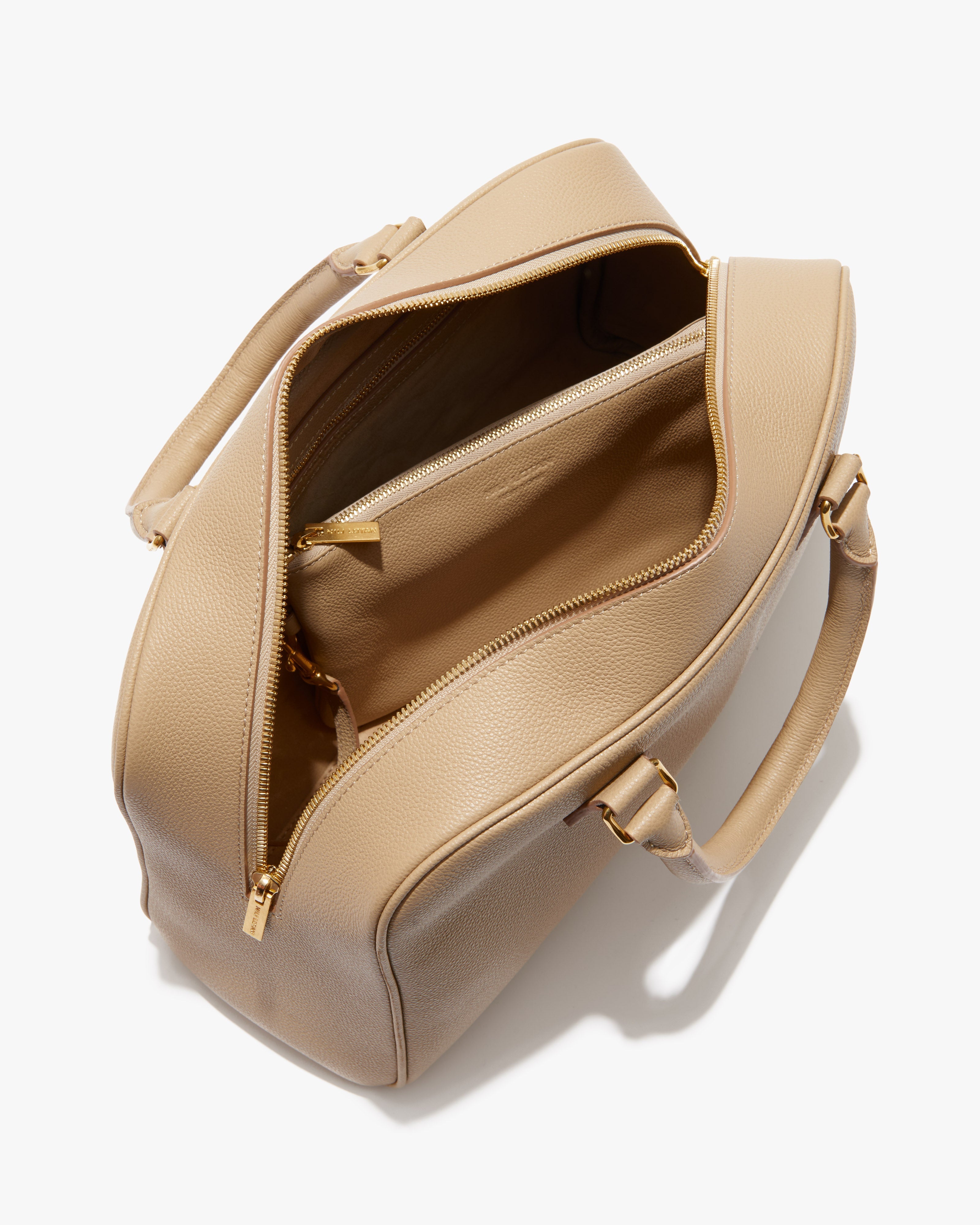 Top-handle bag in Italian grain leather with Italian suede lining. Semi-structured silhouette with a structured base and softly collapsible body over time. Removable interior pouch with zip closure. Interior back wall zip pocket. No exterior logo; interior debossed NILI LOTAN NEW YORK logo. Hardware includes logo zipper pullers, logo rectangle handle rings, D-ring and dog clip interior closure, and metal feet at base.