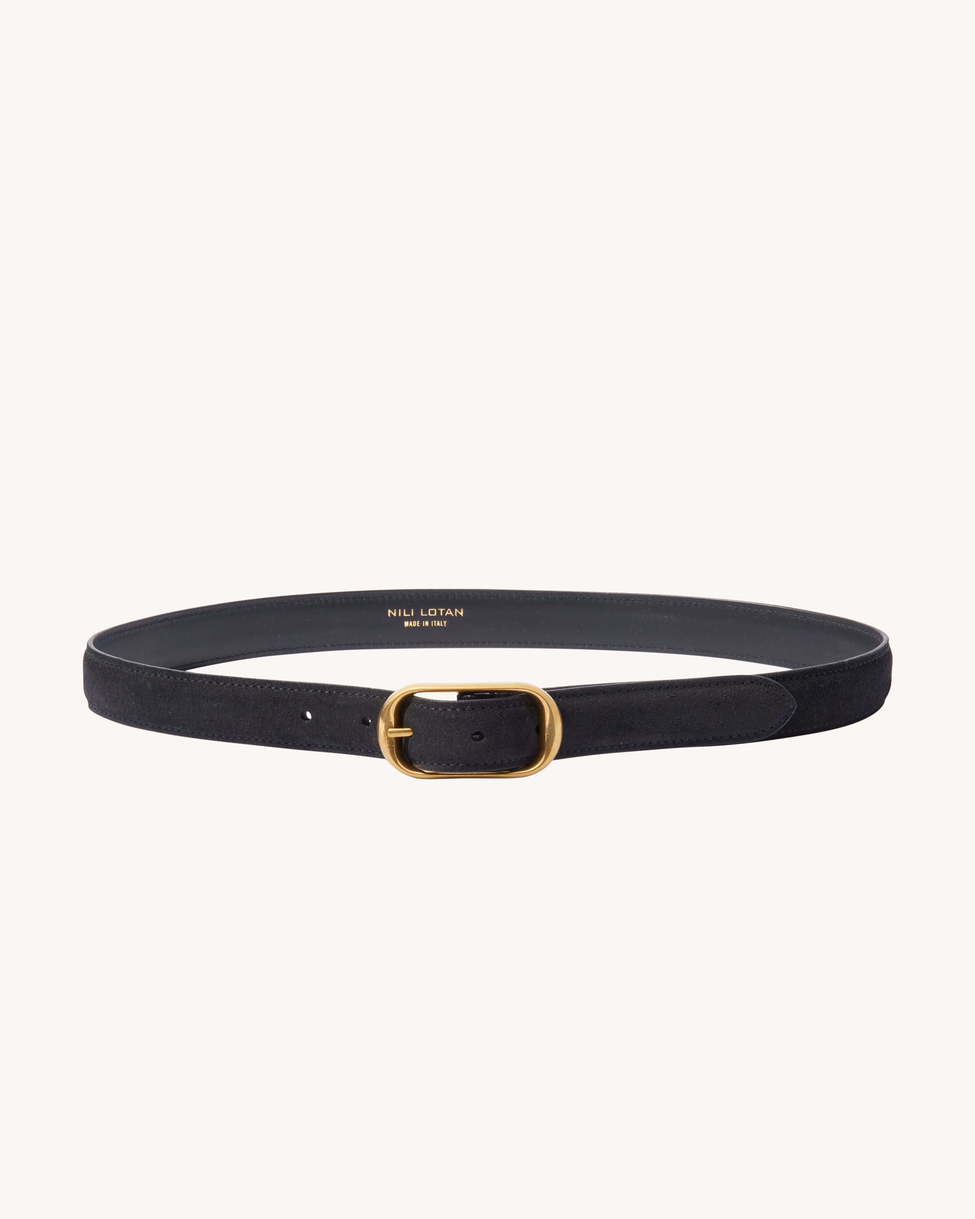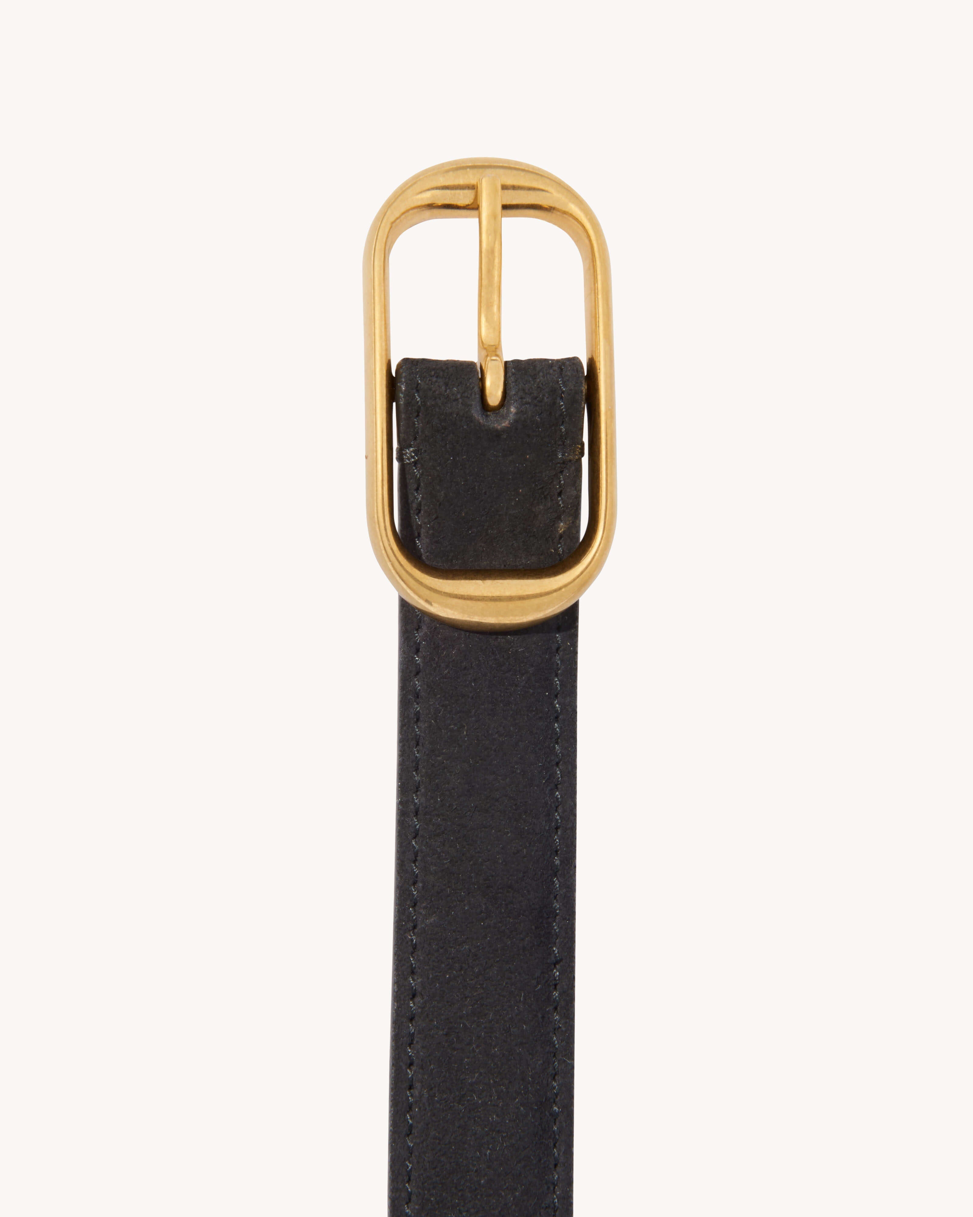 30mm belt with bombe finish crafted in suede with smooth leather combo, tonal to the suede. Finished with a custom antique brass buckle with micro engraving on the back.