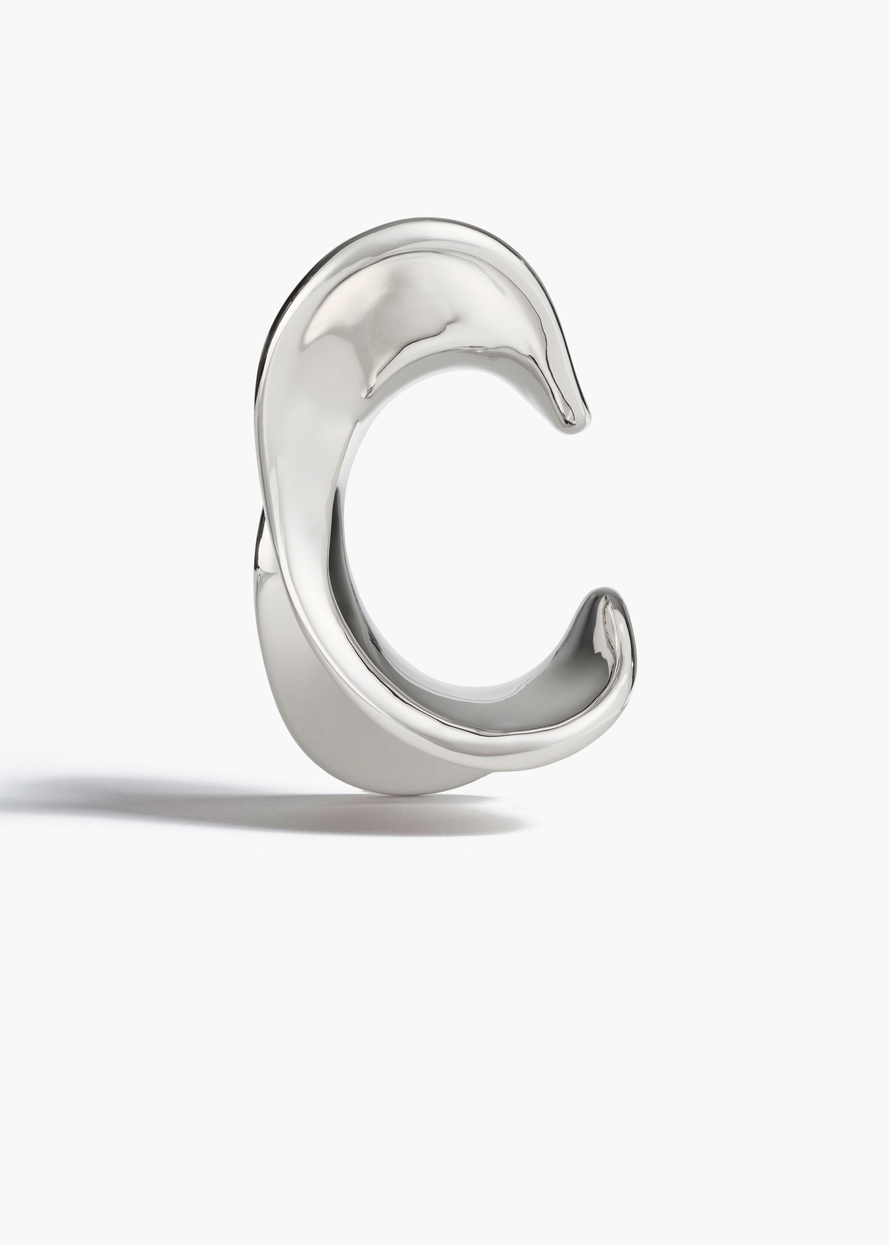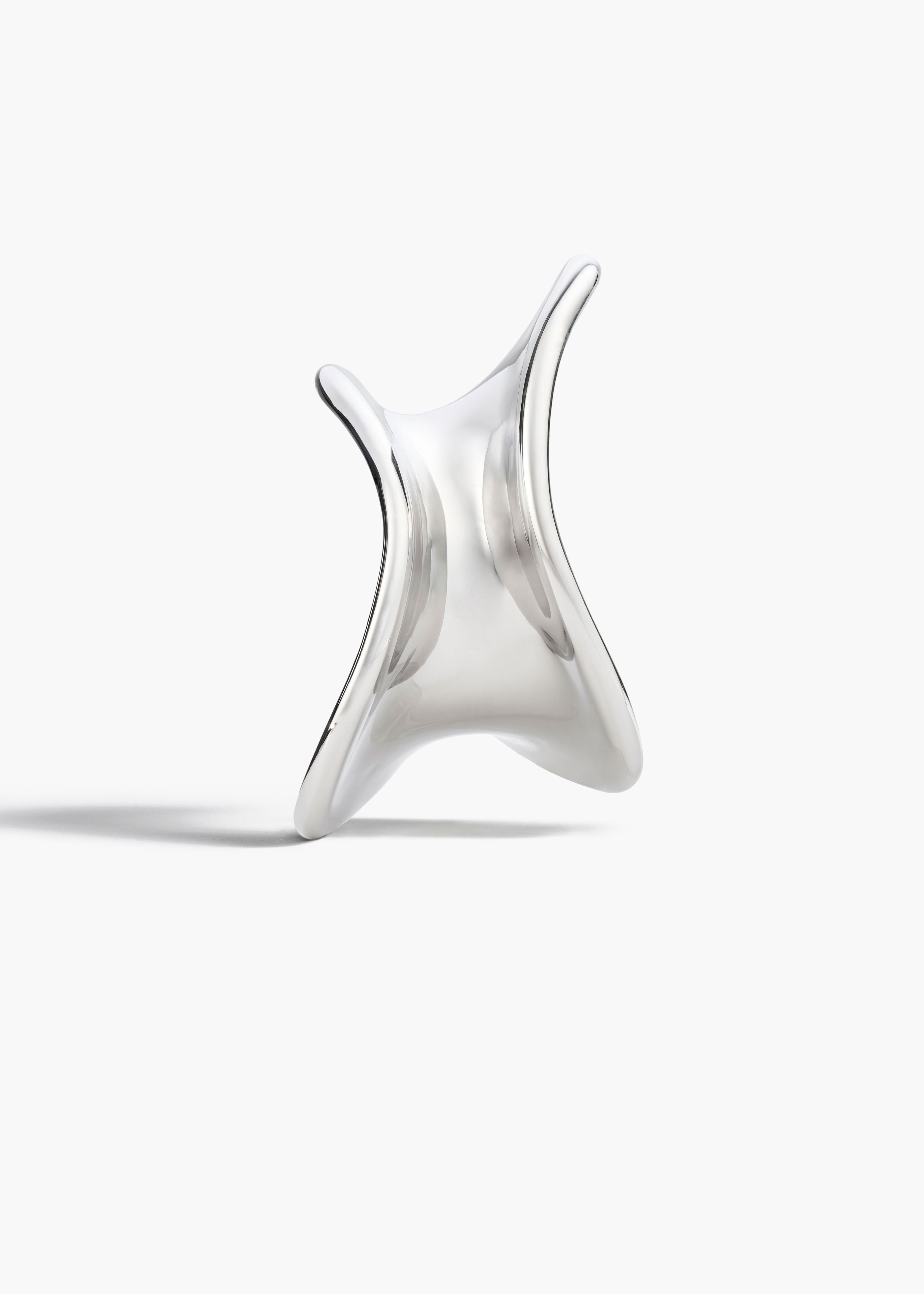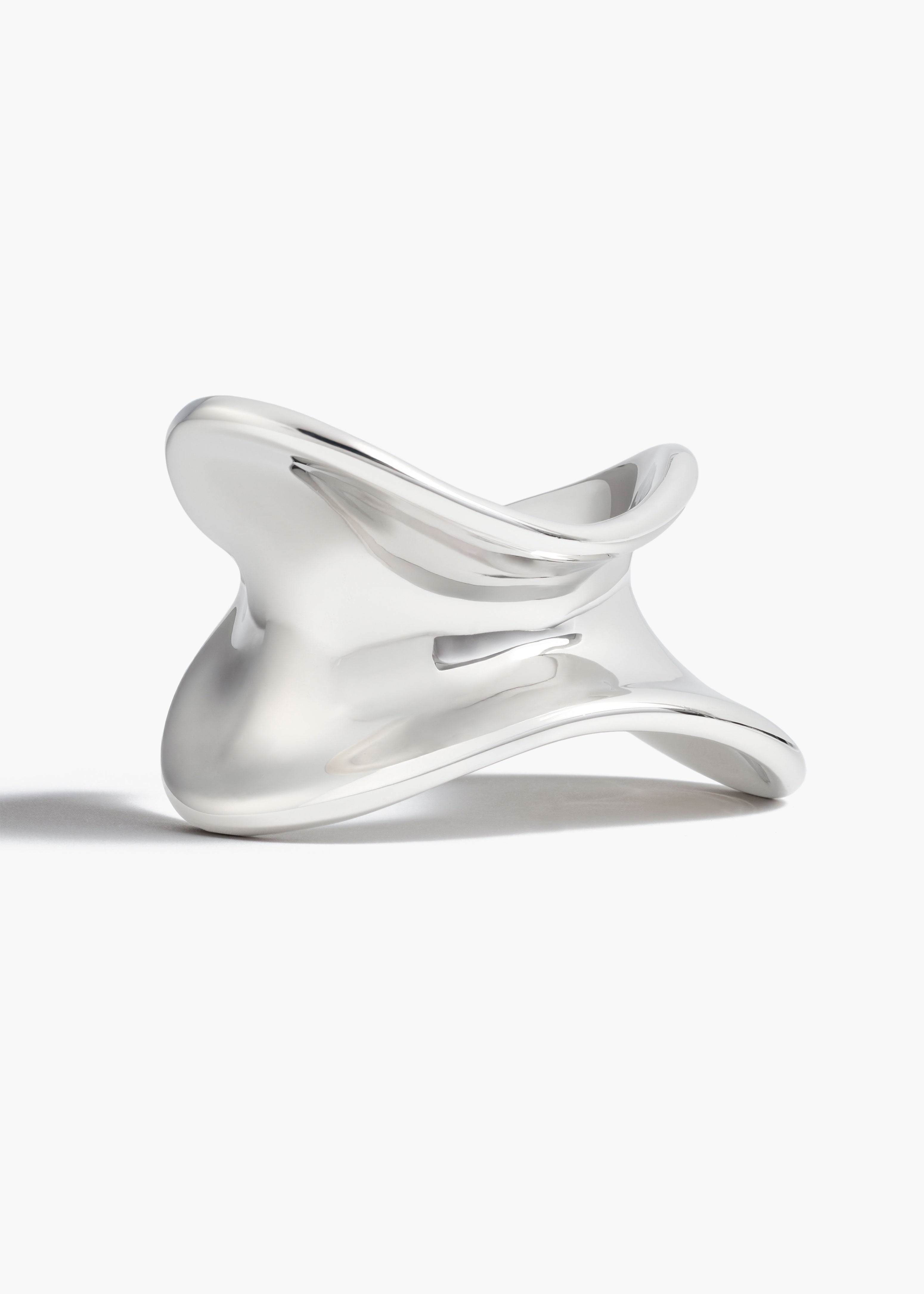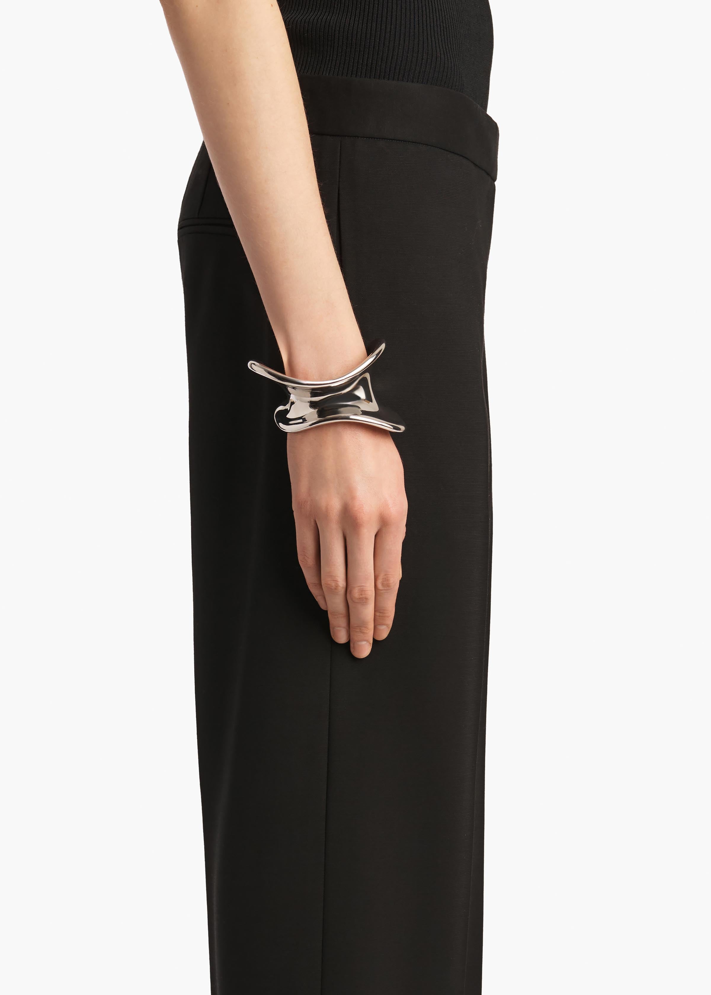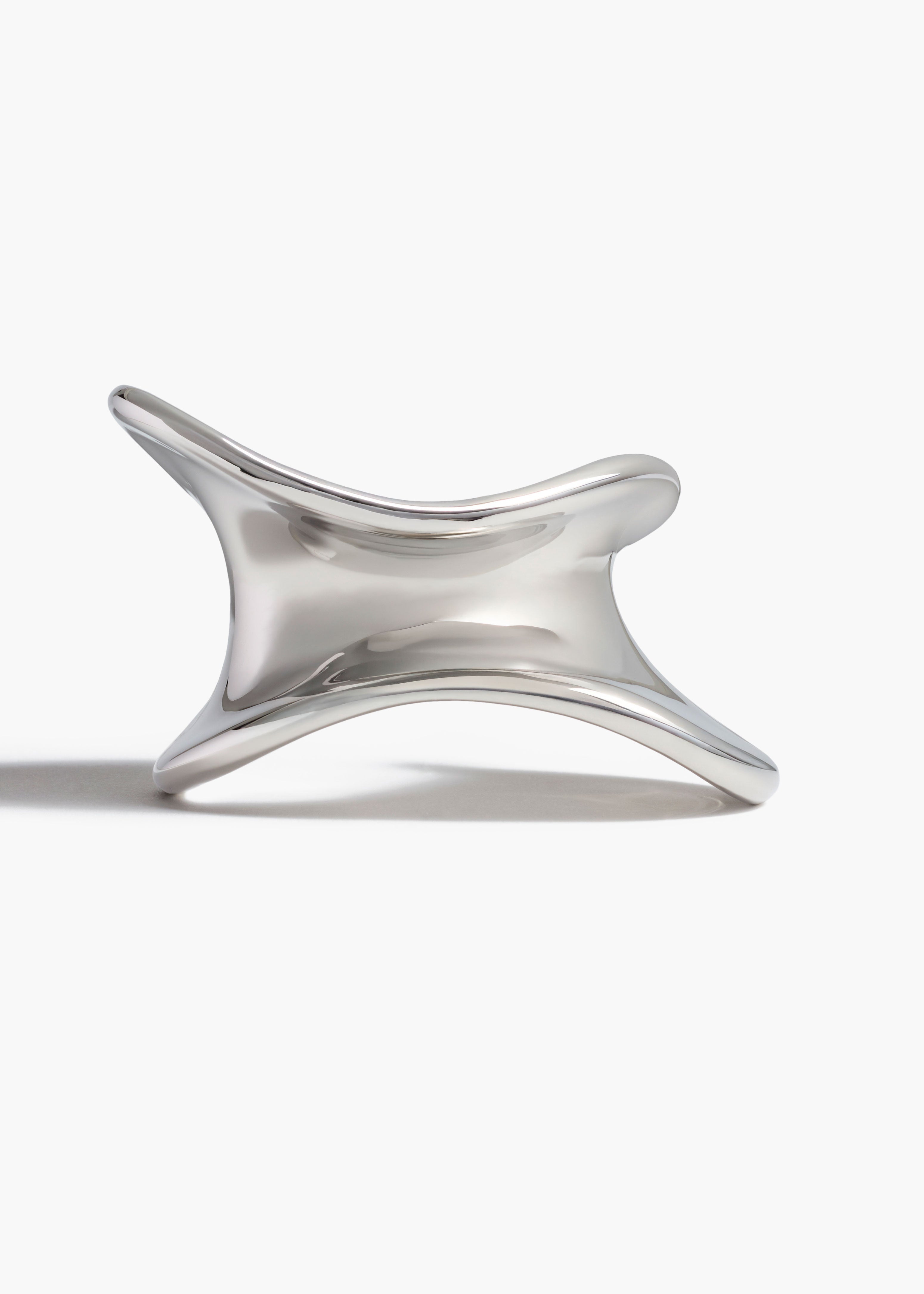 A sculptural cuff bracelet designed to hug the wrist with its dynamic, asymmetric form. Crafted in Italy of palladium-plated brass.