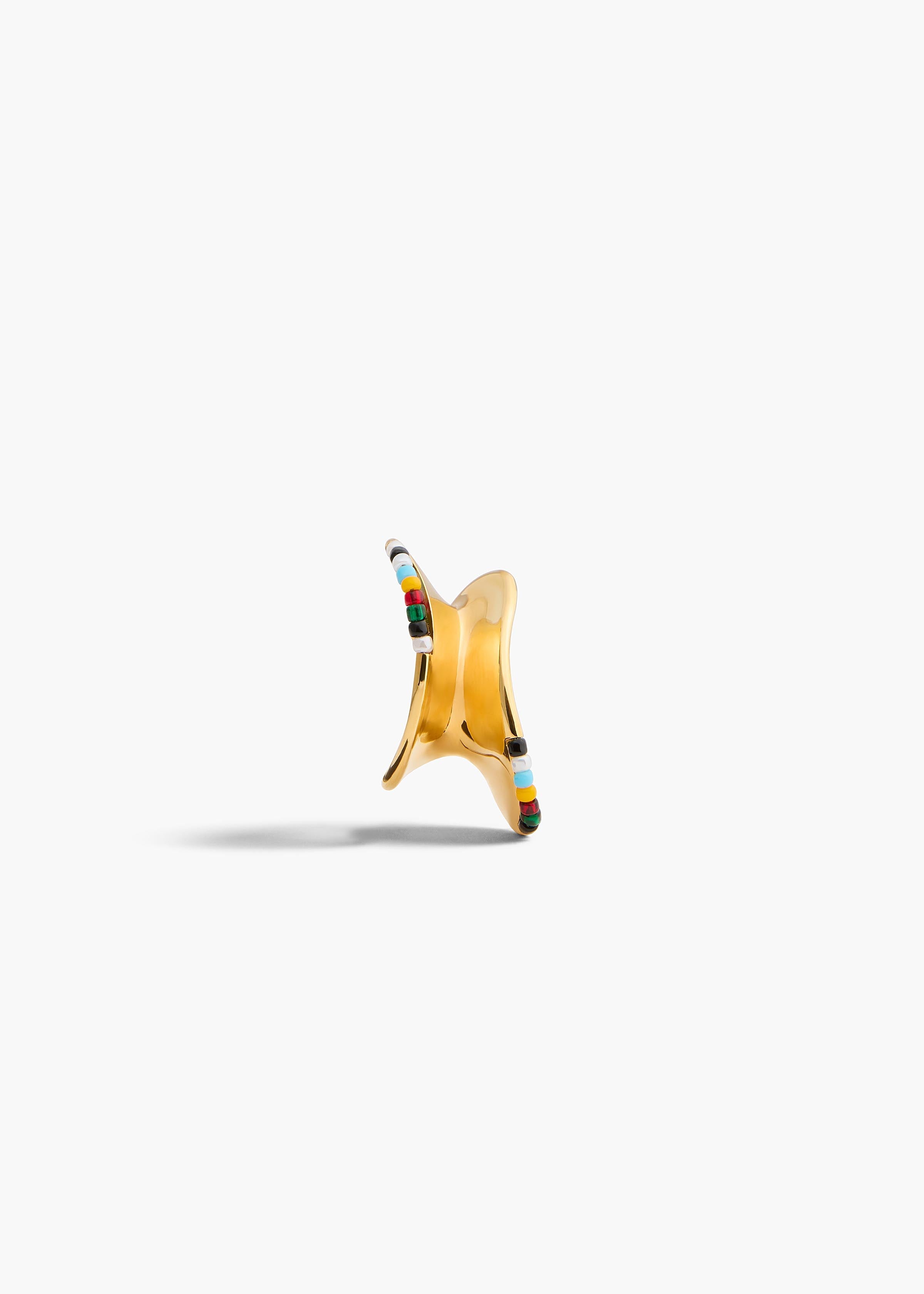 A sculptural ear cuff made in Italy of 18-karat-gold-plated brass accented by multicolored glass beads. Designed to hug the right earlobe, following its contours.