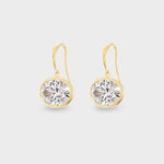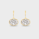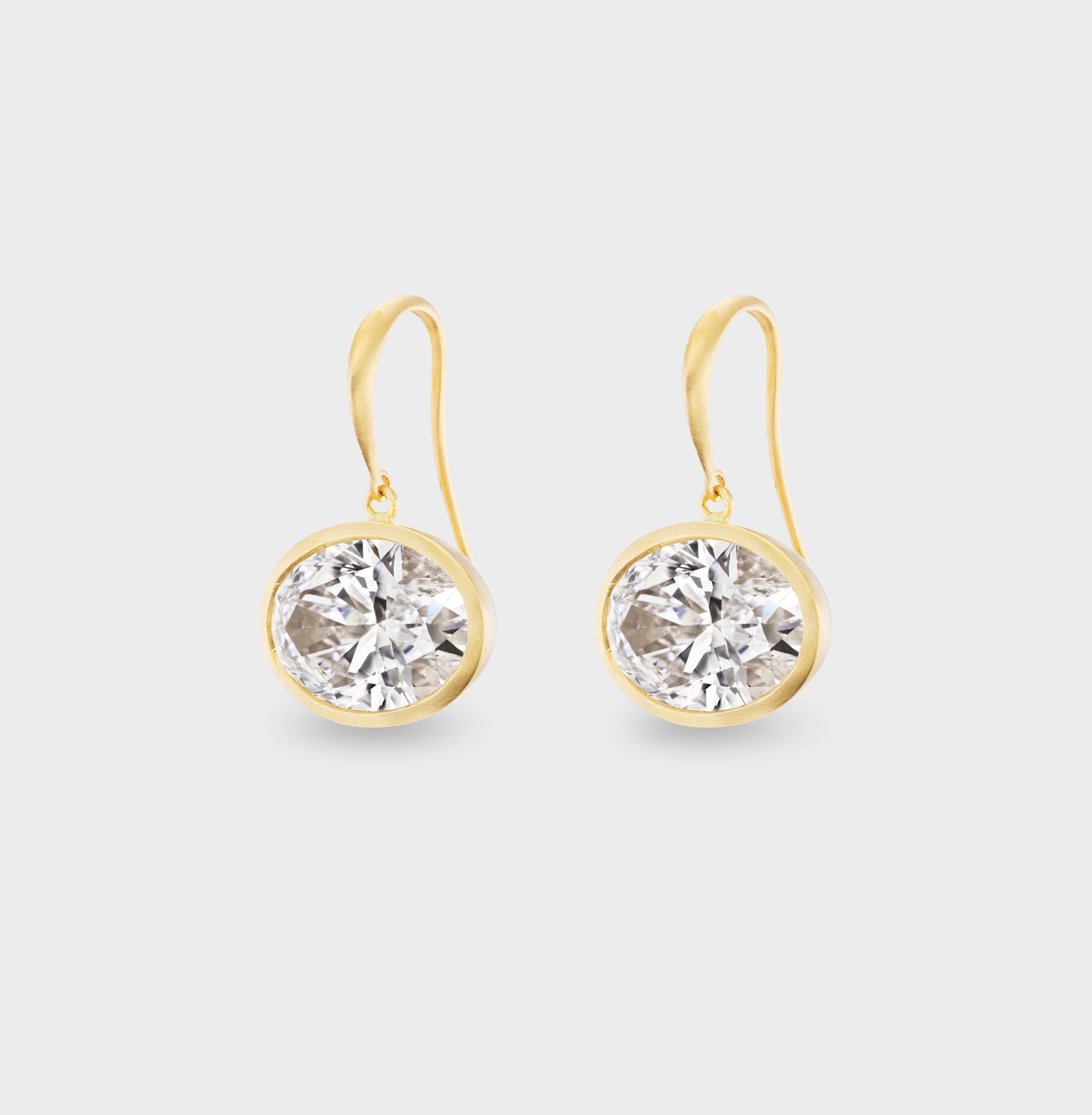 10 carats total of brilliant oval-cut lab-grown diamonds, set in 14k yellow gold. Suspended from refined fishhook wires, each 5 carat stone is held in a bezel setting that highlights the scale and sparkle. Best served with a canvas bucket hat. Good with wet hair and simple black sunglasses too. Available to purchase as a single earring, or as a traditional pair.