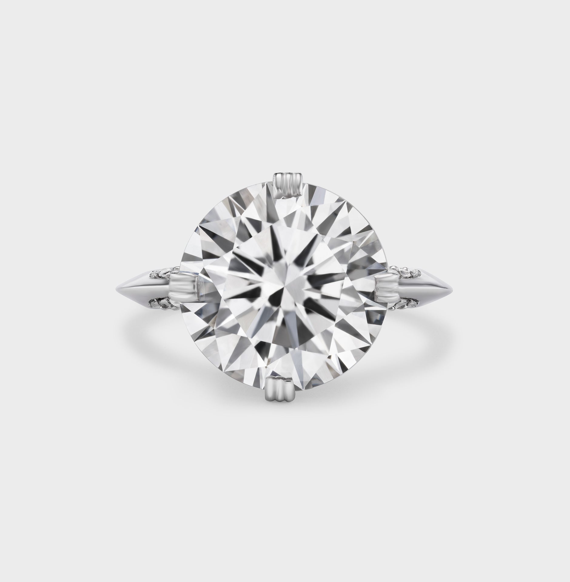 A 5 carat brilliant-cut round lab-grown diamond set in platinum, accented with 0.42ctw pavé stones along the basket and band. The setting features an engraved Greek key motif—an architectural detail that adds structure, symbolism, and depth to the piece. Best when worn on the pinky or middle finger. The vibe is won it at an auction.
