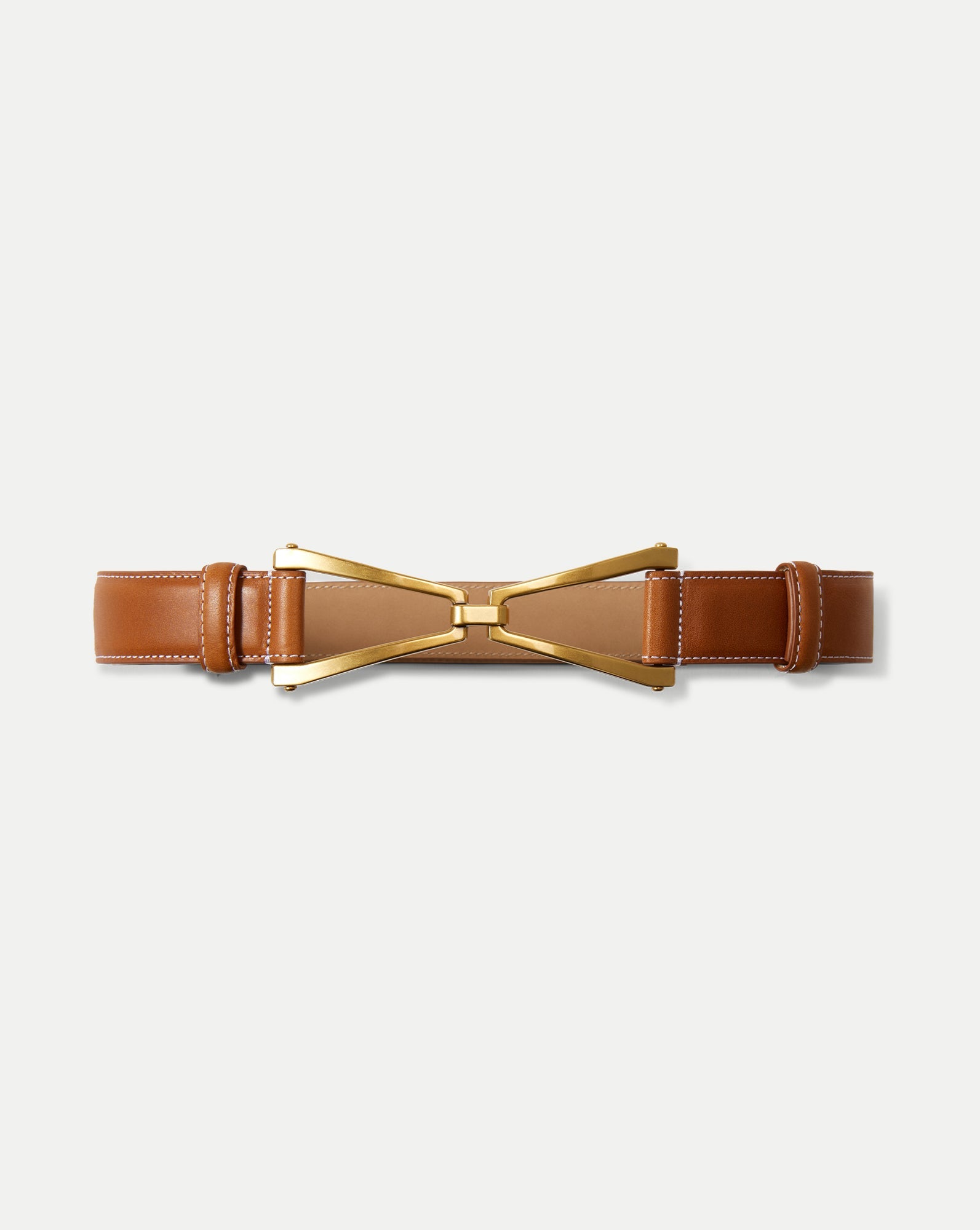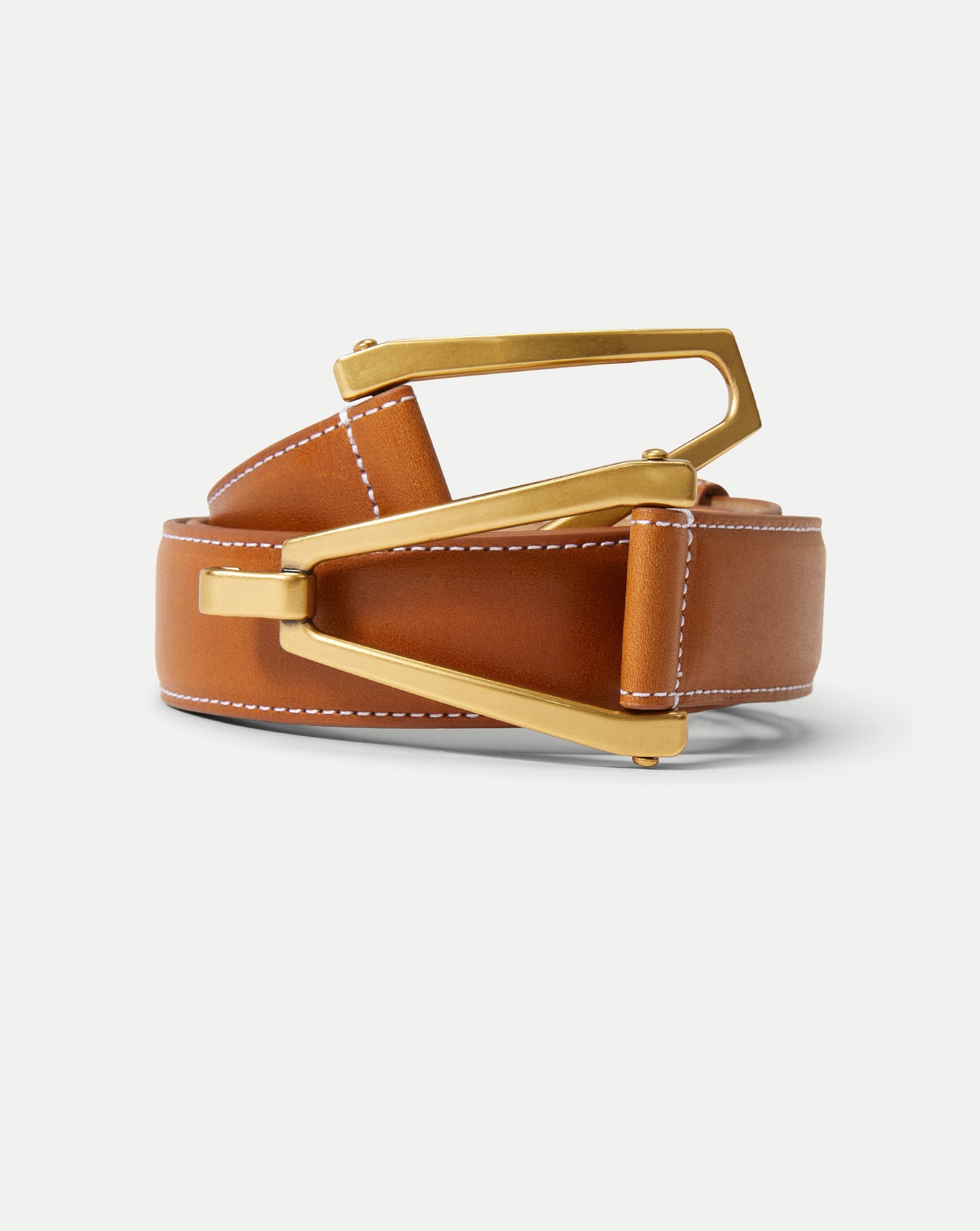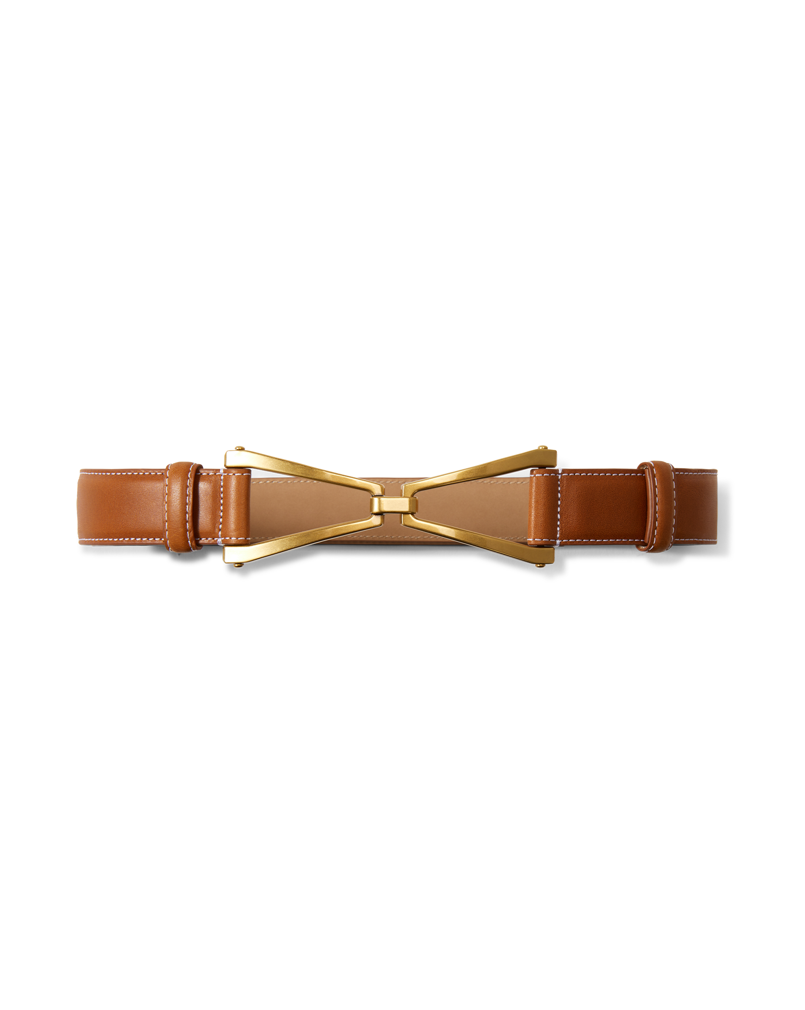 Form, meet function. Crafted from smooth vegetable-tanned leather, the V belt in tan features a geometric buckle in gold that nods to our logo. Finished with a hook-and-eye closure and adjustable keepers to hold the strap in place, it's as timeless as it is bold. Pair with both tailored and casual looks—or style over a sleek dress for a subtle hint of shine.