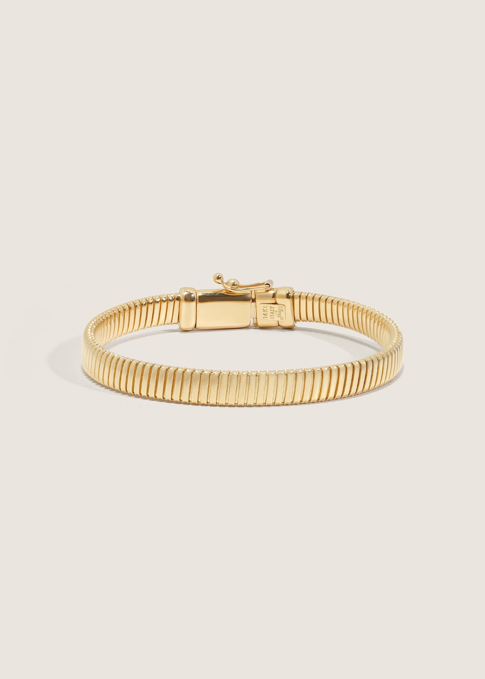 Smooth, sculptural, and endlessly refined. The Celina Flat Tubogas Bracelet wraps the wrist in fluid 14k gold—crafted with precision coils that reflect light with every movement. Its flat silhouette feels both vintage and modern, a quiet nod to Italian design from another era. Finished with a discreet butterfly clasp for a seamless fit that feels like second skin.