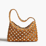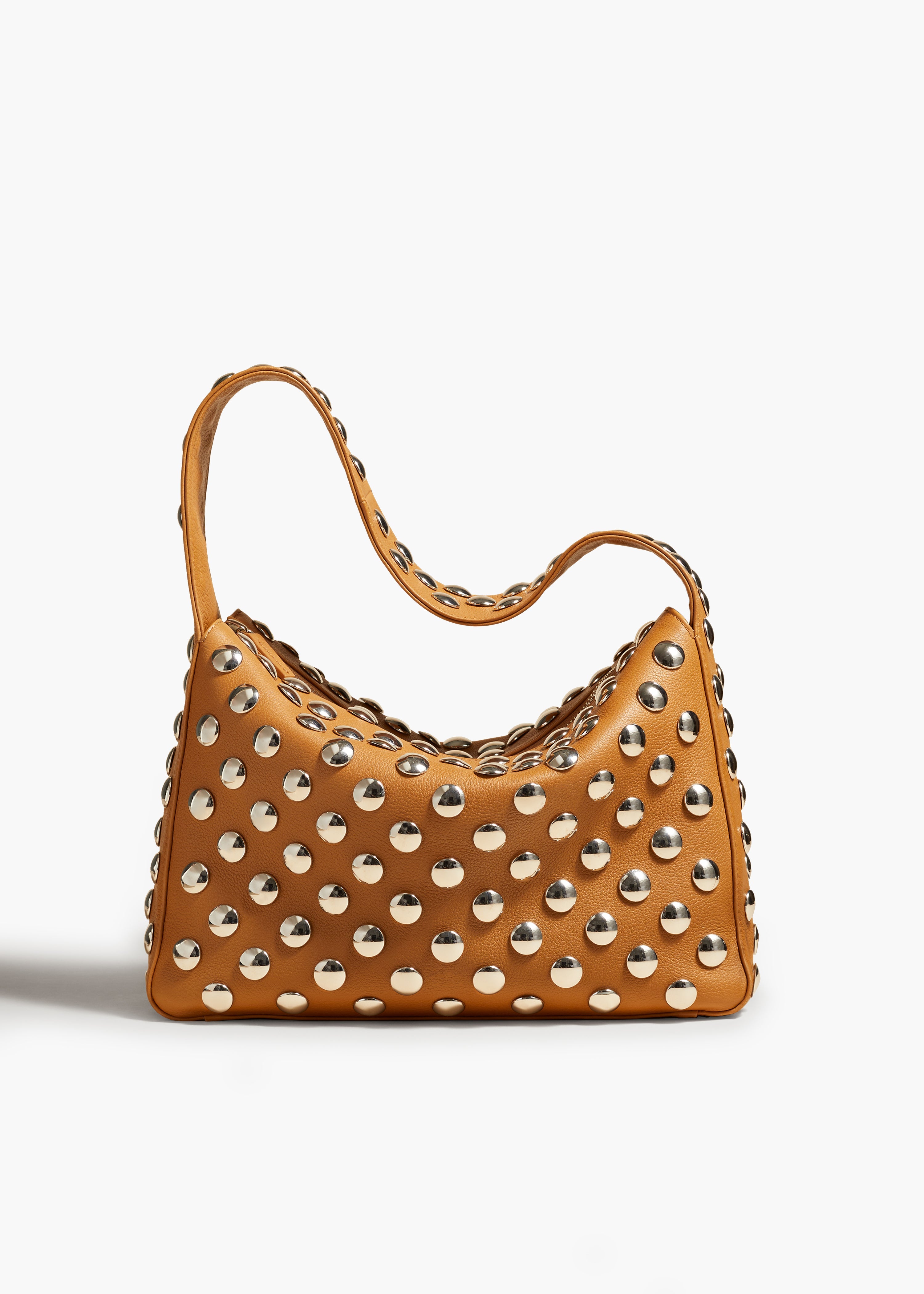 A sculptural interpretation of a classic box bag. The zip-top silhouette is studded in gleaming discs. Lined in nappa leather, with slip pocket.