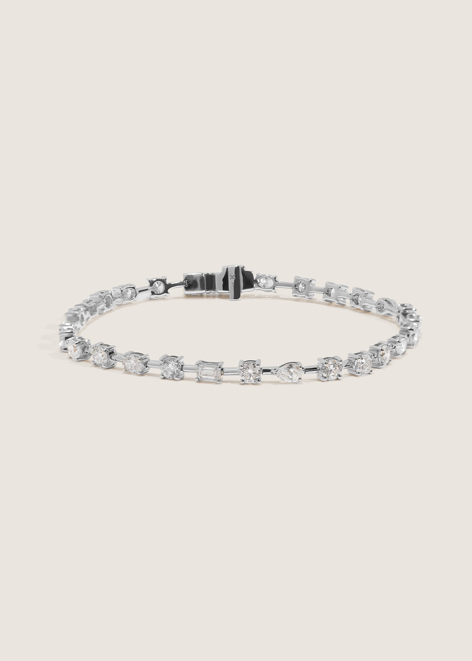 Elegant variation, endless brilliance. The Lydia Fancy Shape Tennis Bracelet features a curated sequence of mixed-cut diamonds—round, cushion, oval, emerald, and pear—set in 14k white gold. Each stone is hand-placed to create rhythm and movement, giving this classic silhouette a fresh, artful edge. With a total of 4 carats of diamonds, it’s refined yet full of personality.