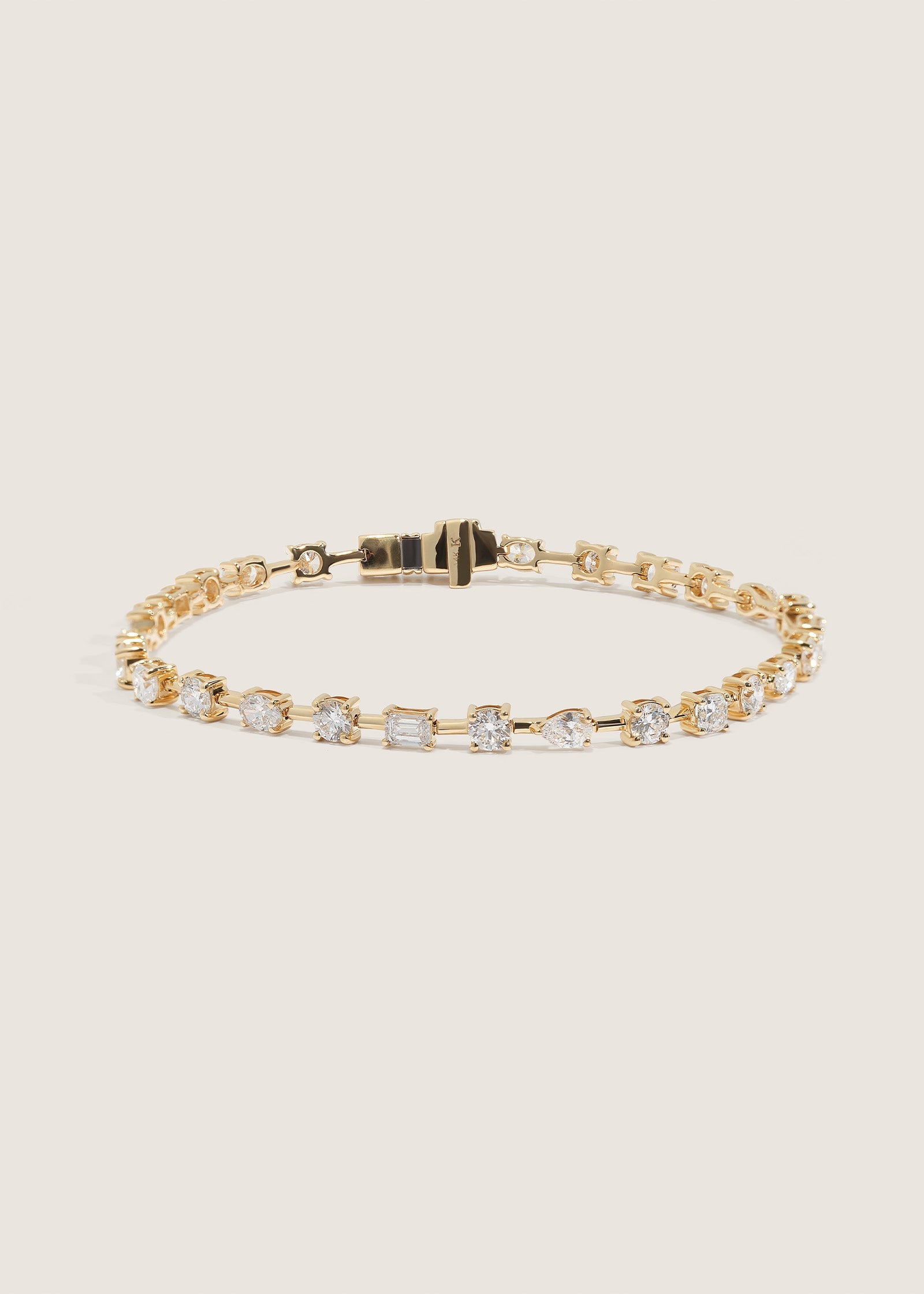 Elegant variation, endless brilliance. The Lydia Fancy Shape Tennis Bracelet features a curated sequence of mixed-cut diamonds—round, cushion, oval, emerald, and pear—set in 14k yellow gold. Each stone is hand-placed to create rhythm and movement, giving this classic silhouette a fresh, artful edge. With a total of 4 carats of diamonds, it’s refined yet full of personality.