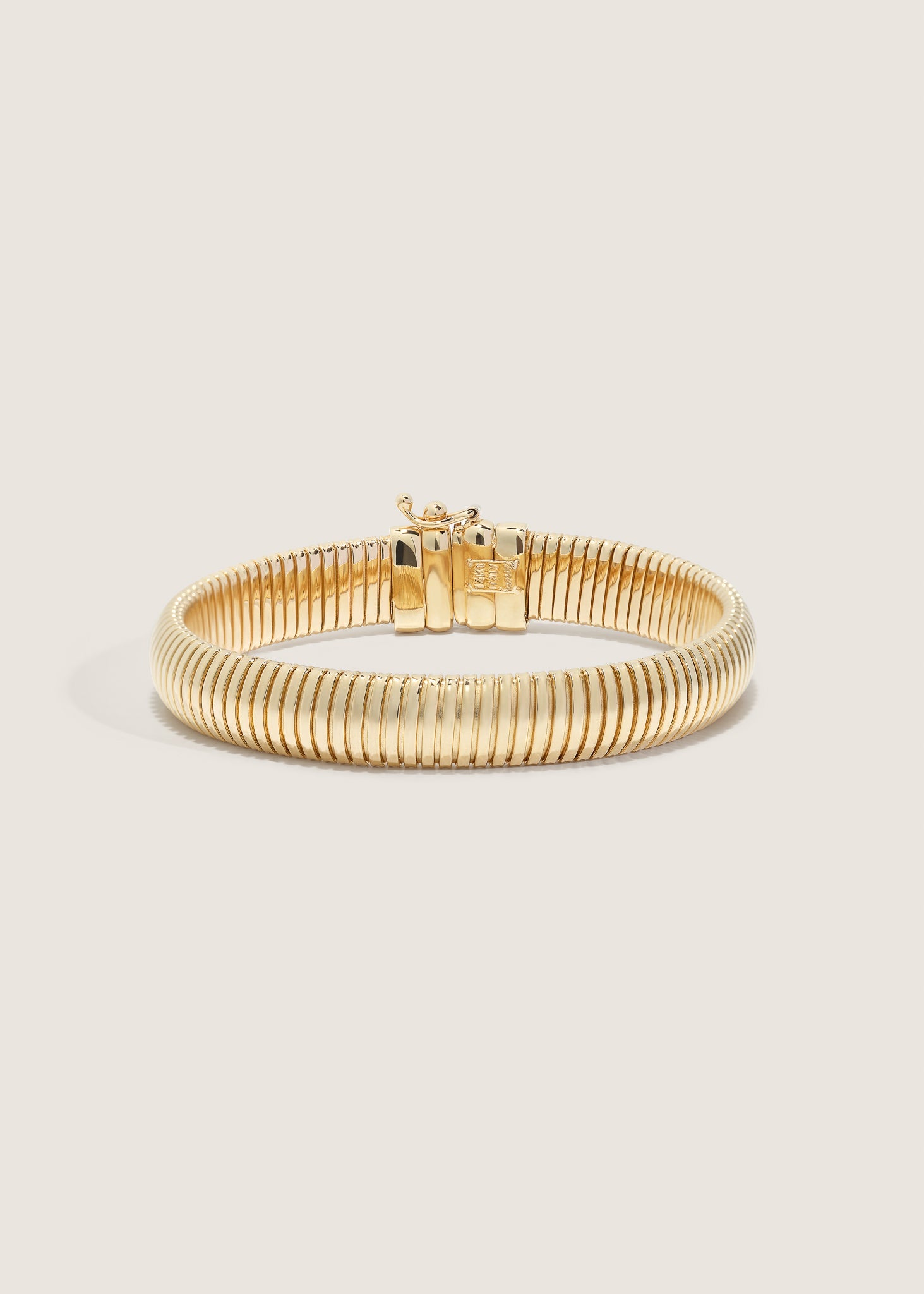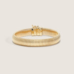 Striking yet timeless, the Nina Bold Tubogas Bracelet embodies confidence in form. Crafted from rounded coils of solid 14k gold, its domed silhouette adds sculptural depth and presence to the wrist. Inspired by vintage Italian goldwork, this bold interpretation of our signature Tubogas design is finished with a hidden butterfly clasp for a smooth, continuous line.