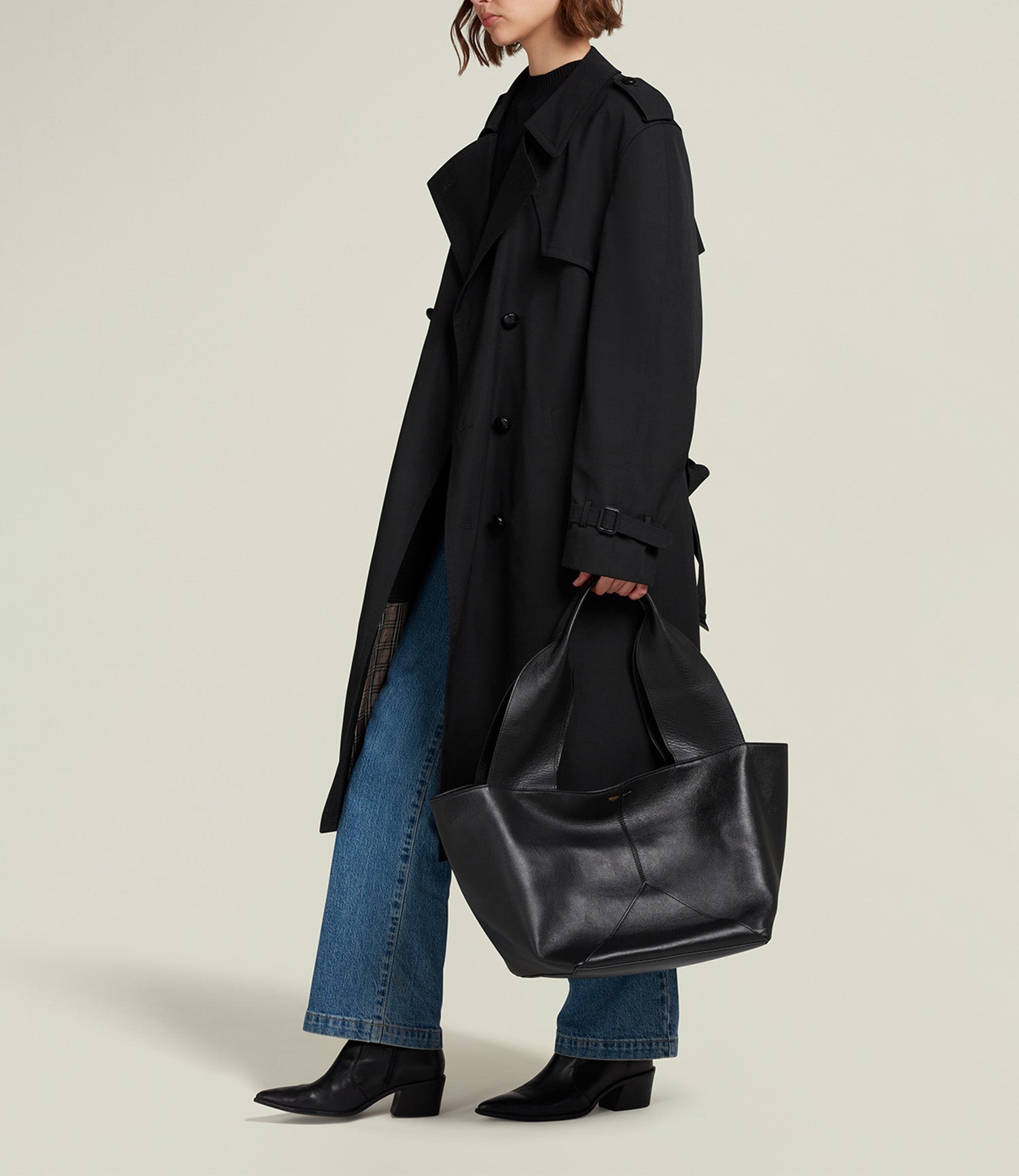 This Métier tote bag is quite literally a twist on a classic. Its base has been twisted and tailored to rest lightly against your body, while the wide and supple handles, attached from the corner points, engineer the perfect slouch and allow you to carry it with ease.