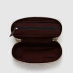 Our One Day Toiletry Bag elegantly holds your daily necessities. With a waterproof cloth interior, it also features a water-resistant exterior and a zippered compartment under its lid to separate smaller items.