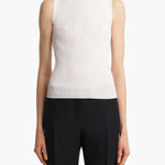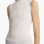 A sleeveless, stand-collar top in finely ribbed viscose selected for its sleek, smooth character and high shine, which imparts an almost iridescent quality.