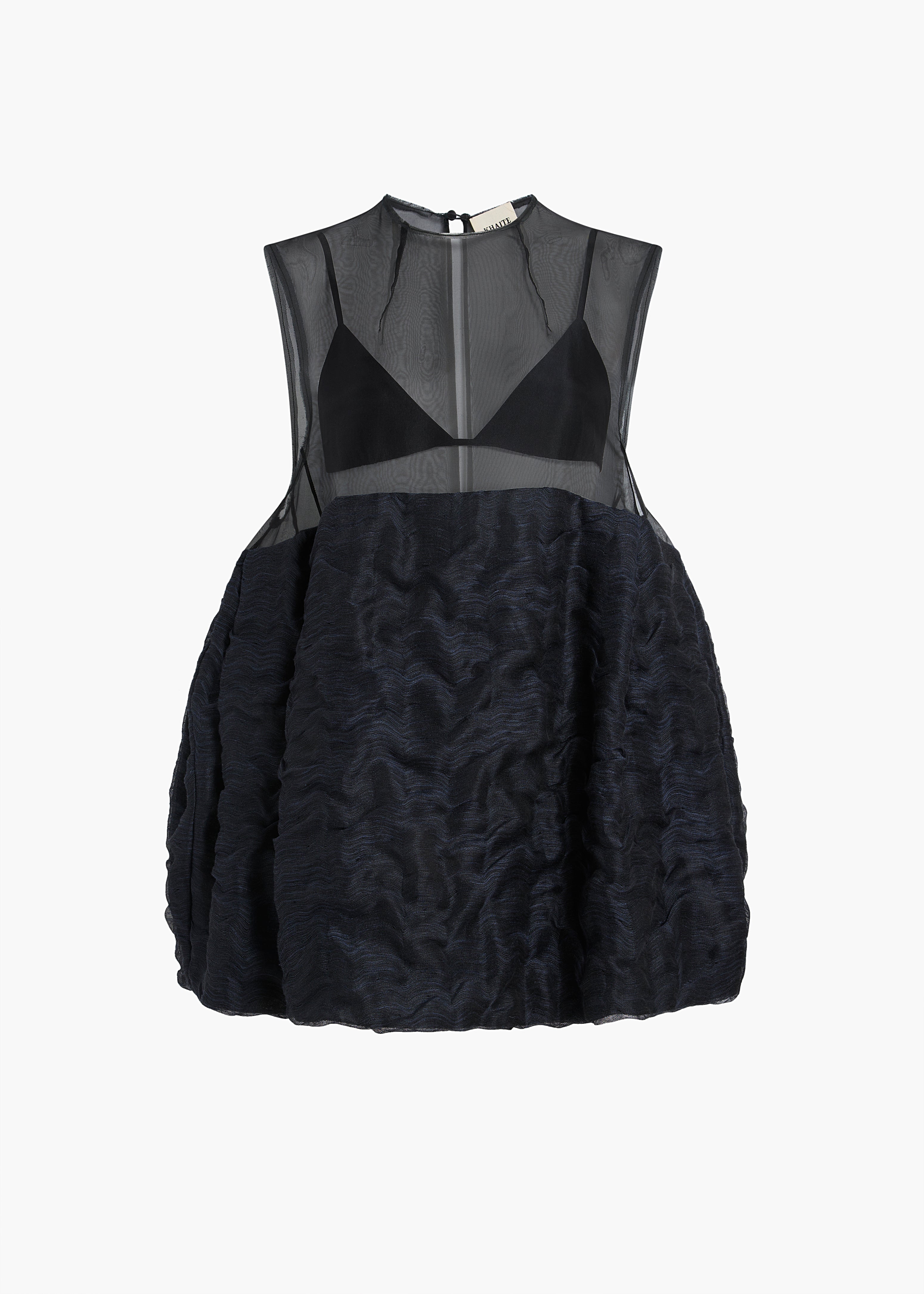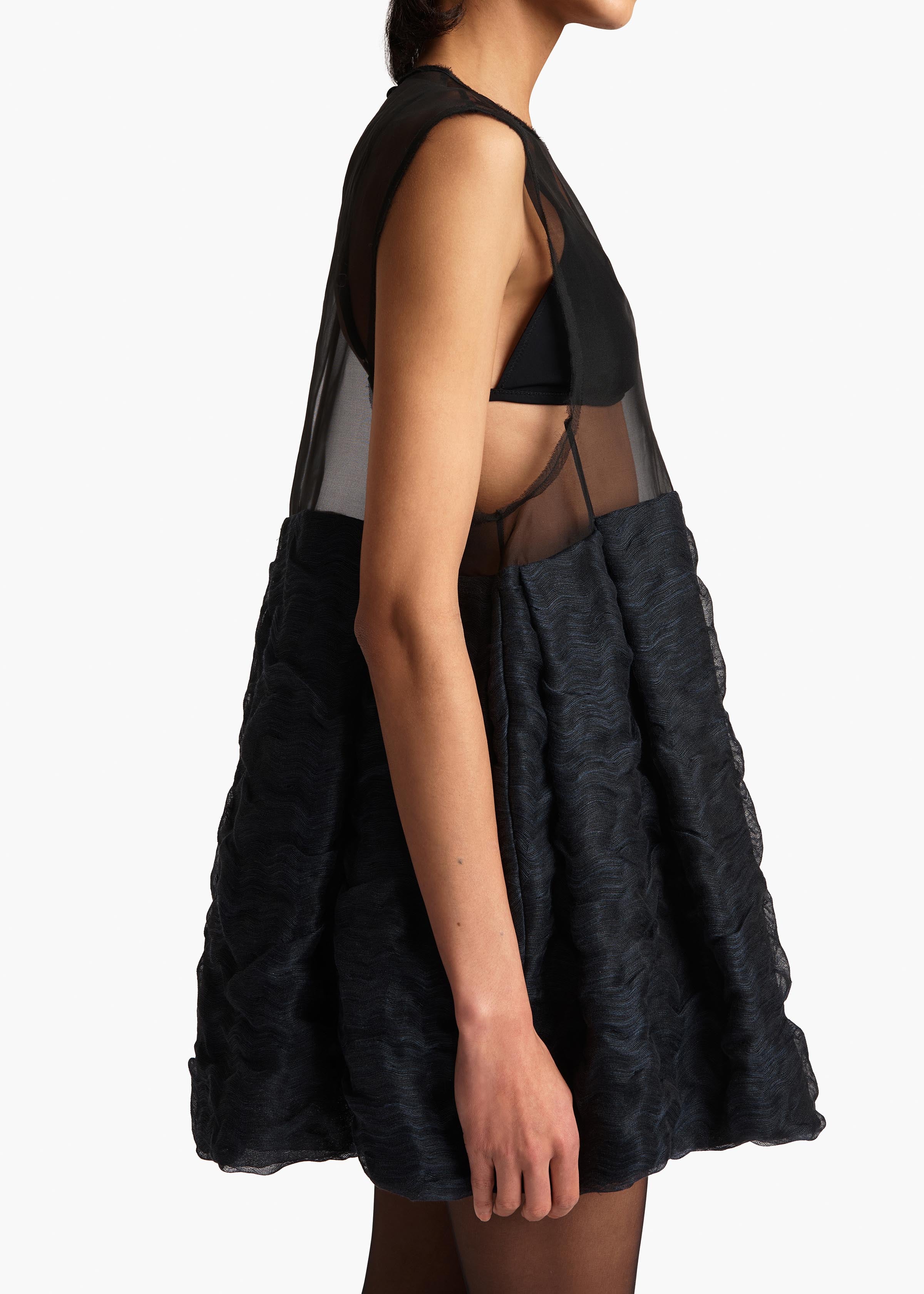 A high-contrast minidress that pairs a sheer, raw-edged bodice with a skirt of lushly textured, undulating linen gauze. Swing silhouette. Button at slit back.