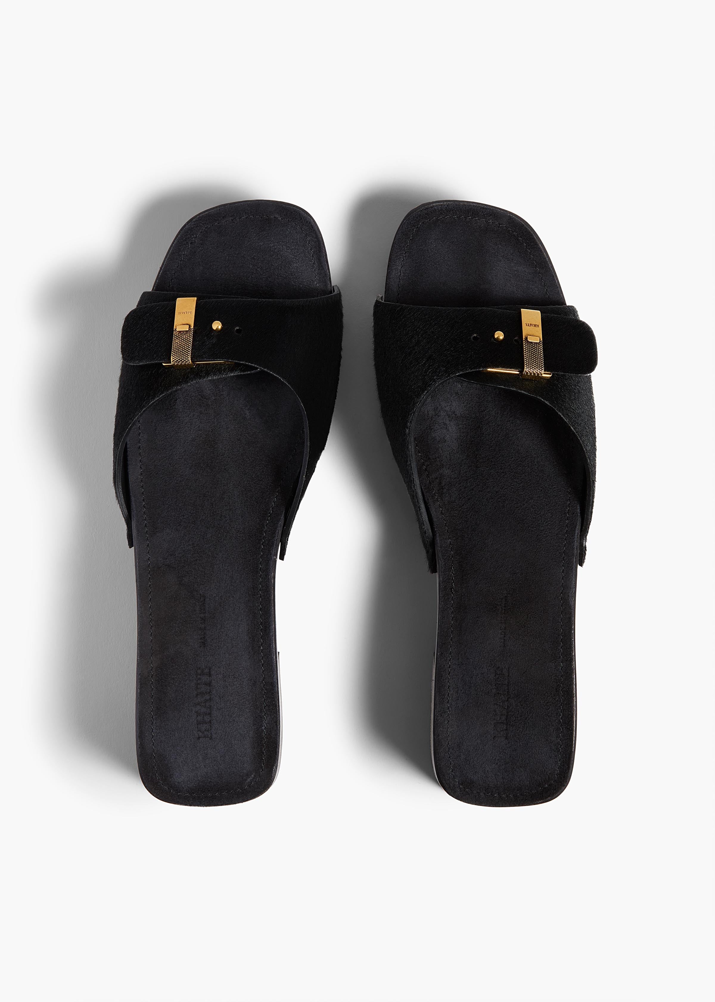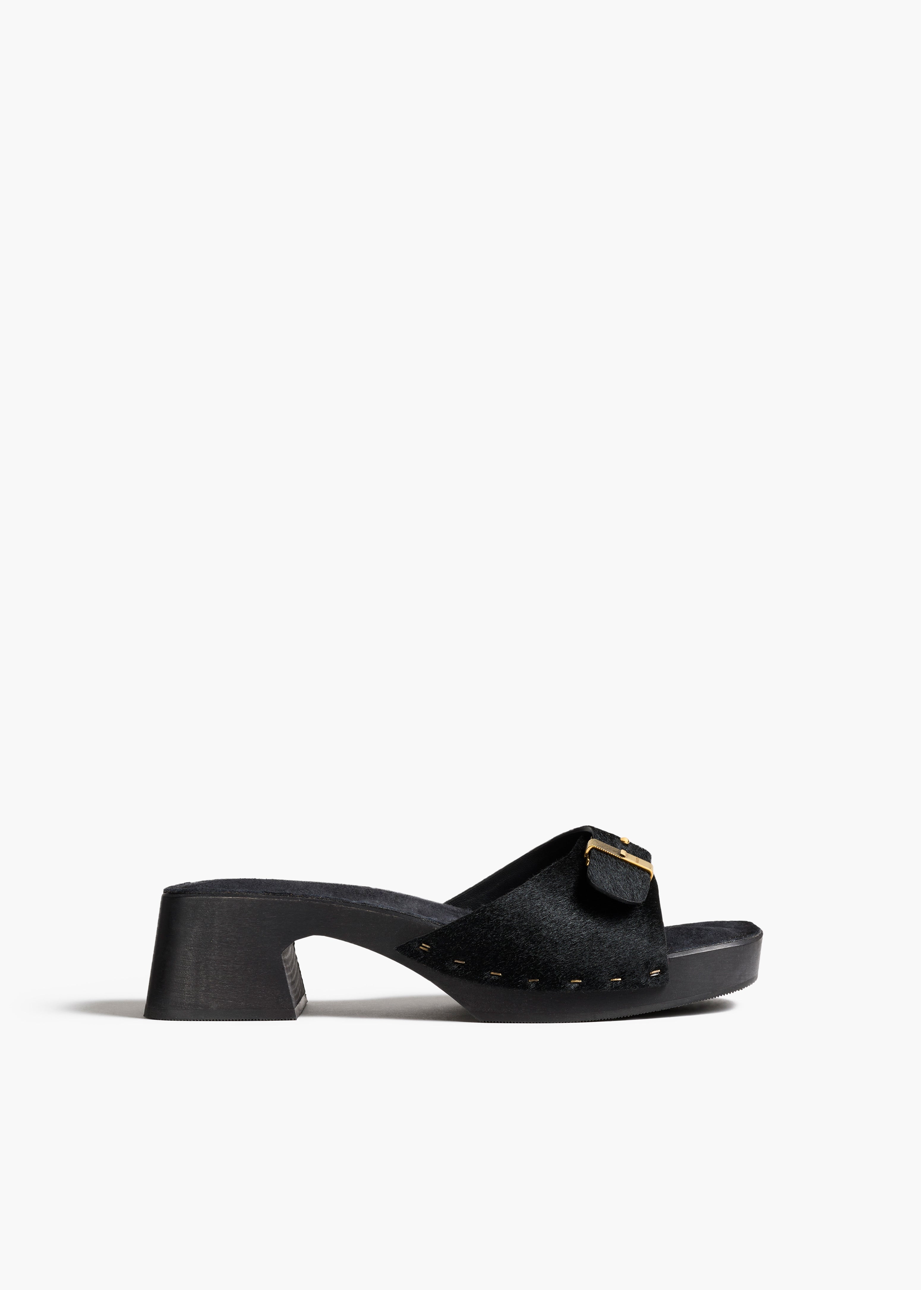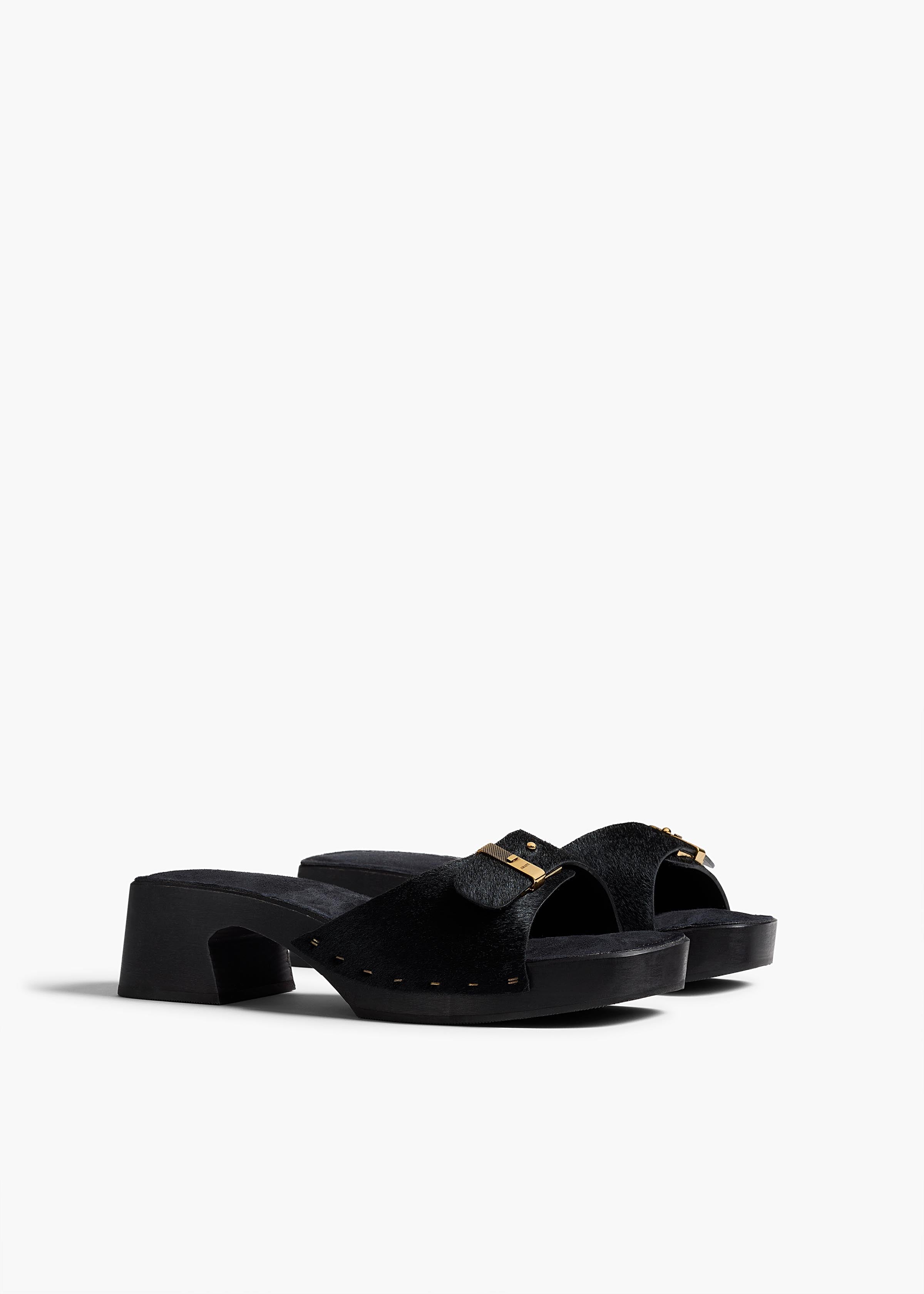 A classic slip-on clog sandal elevated by exquisite materials and Italian craftsmanship. Haircalf upper is accented by gold-toned studs and signature Elio hardware, which aligns smooth and textured surfaces within a press-stud closure. With padded suede insole and rubber grip at outsole.