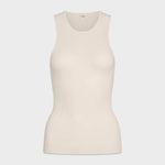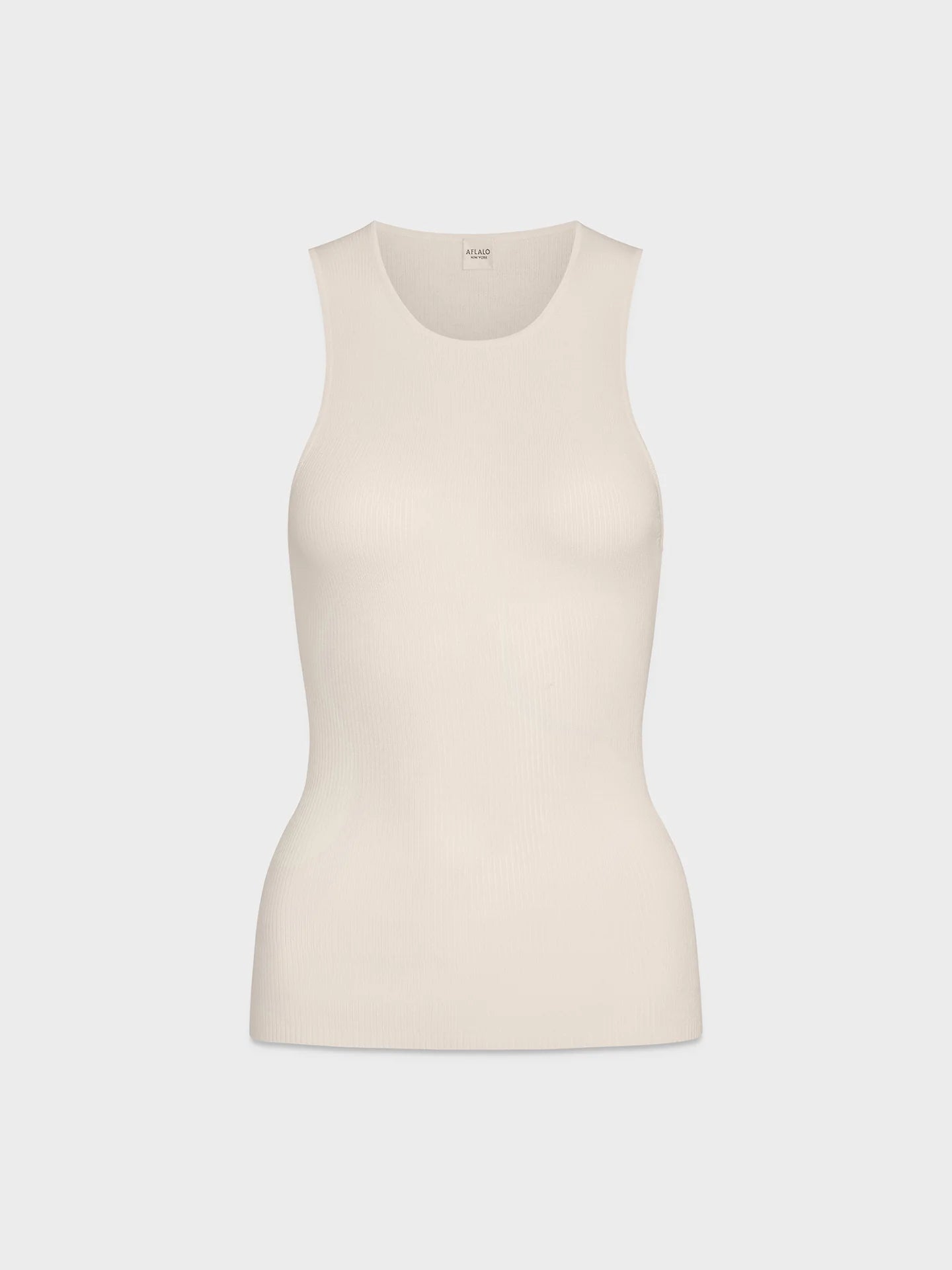 A fitted, full-length tank top with a crew neckline and subtle contouring at the chest and back for a refined, classic silhouette. Knit from semi-sheer and light-weight ribbed merino wool.