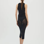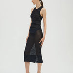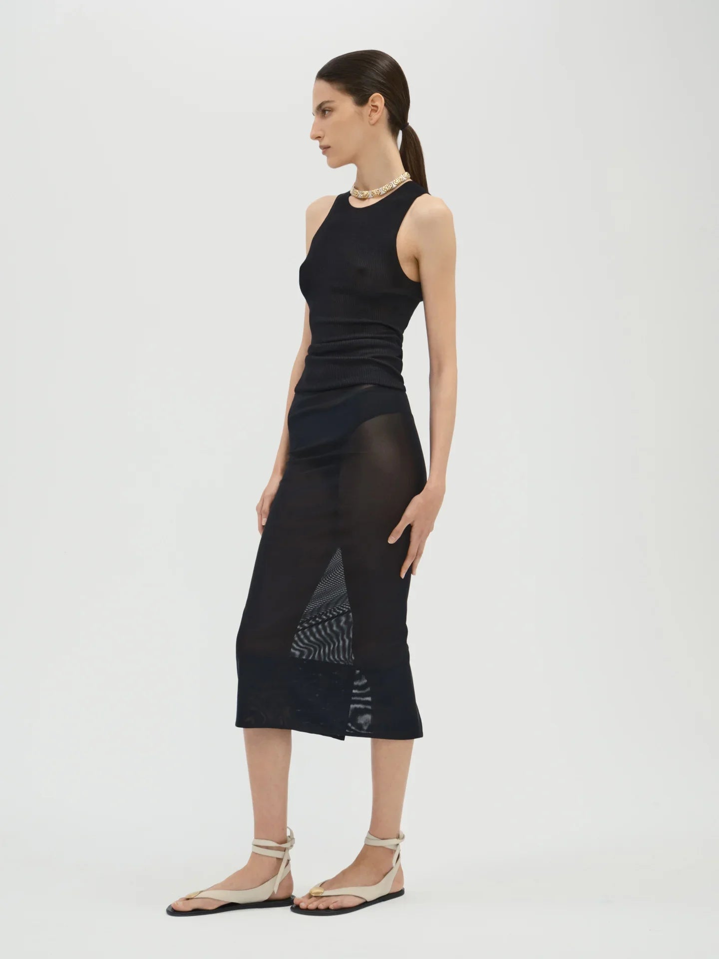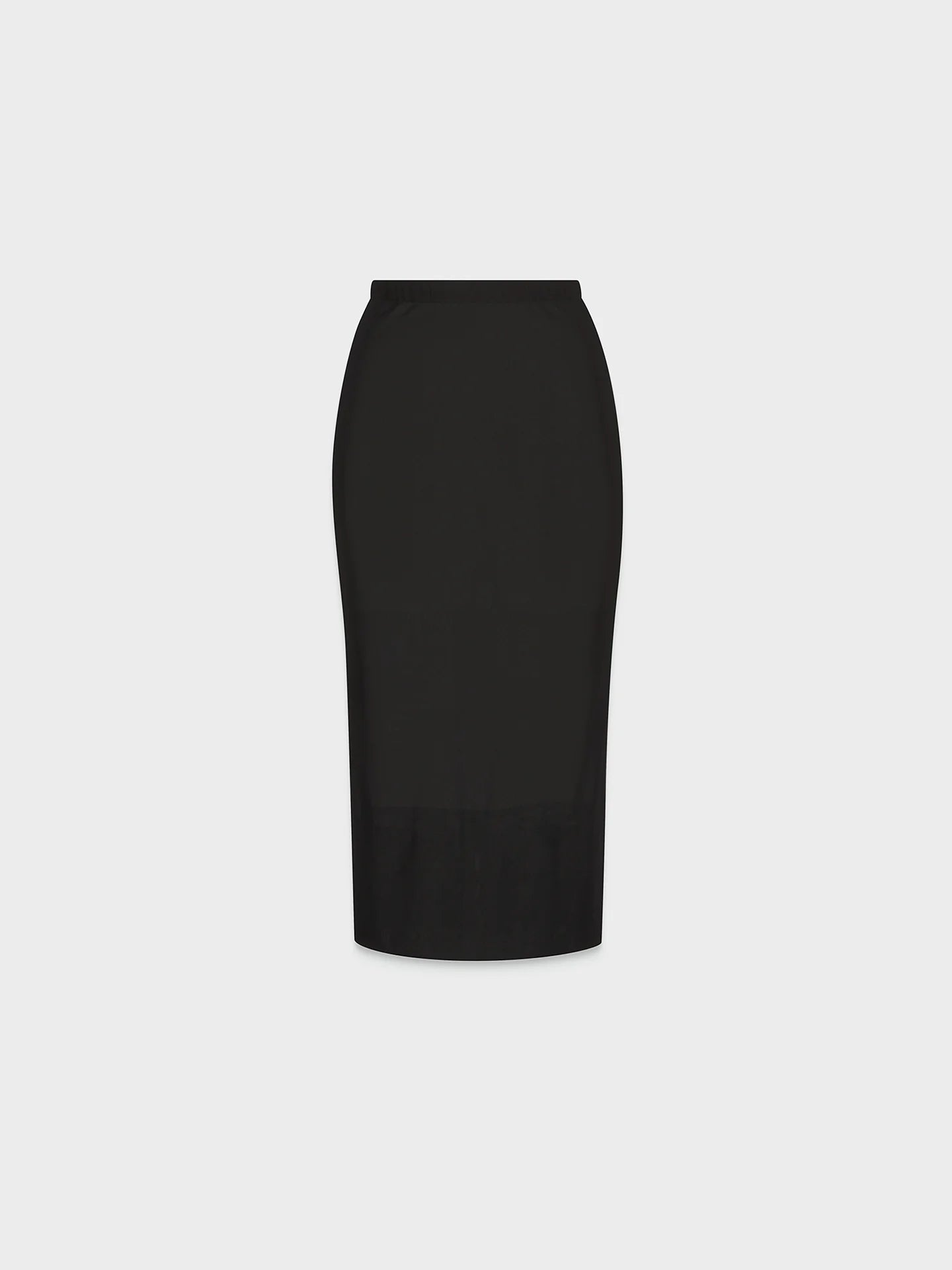 A sheer, figure-sculpting pencil skirt featuring a high-waist, center back slit detail, and exaggerated hem. Refined Italian power mesh provides comfortable stretch and a cool, textured handfeel to the classic silhouette.