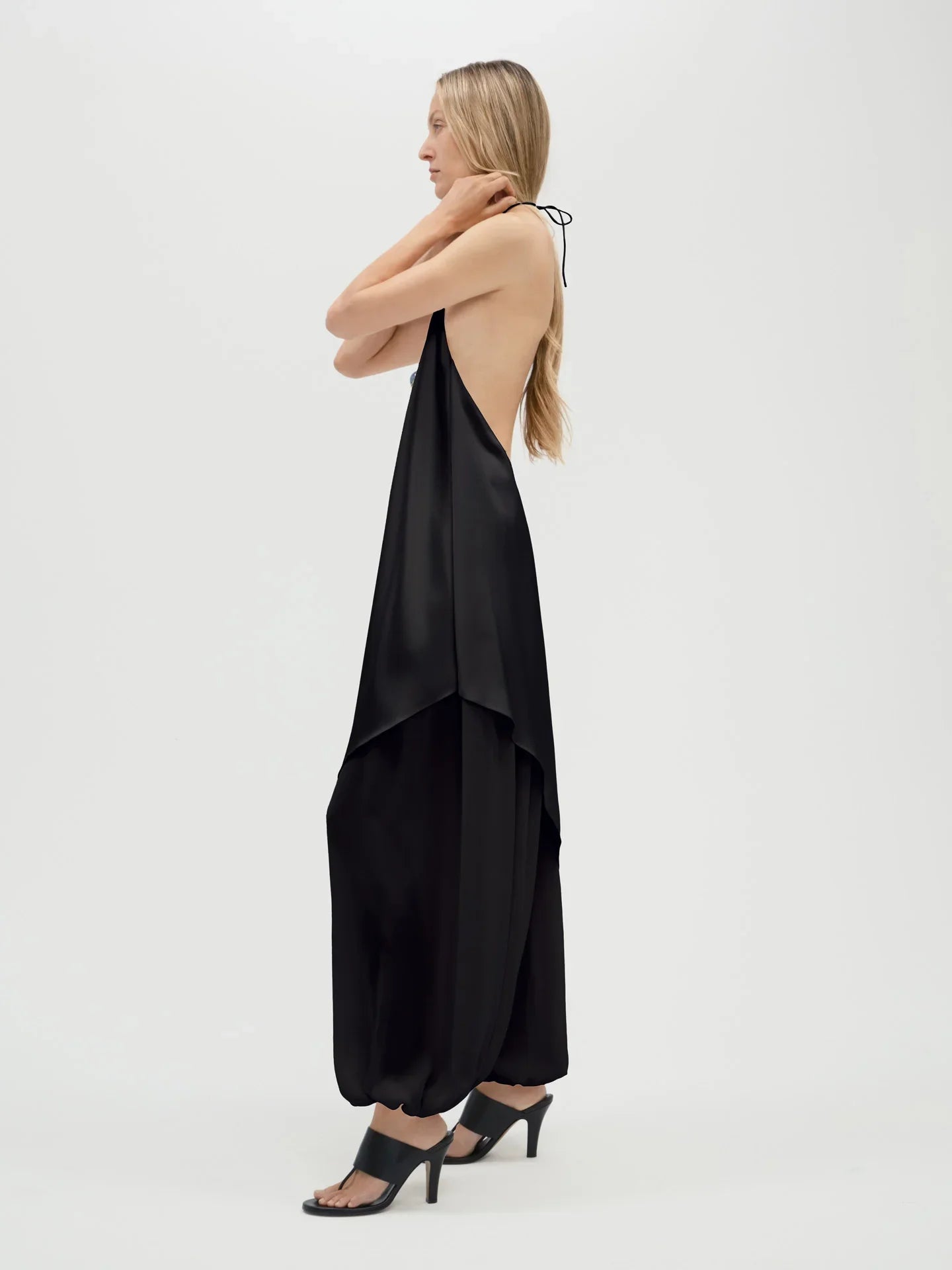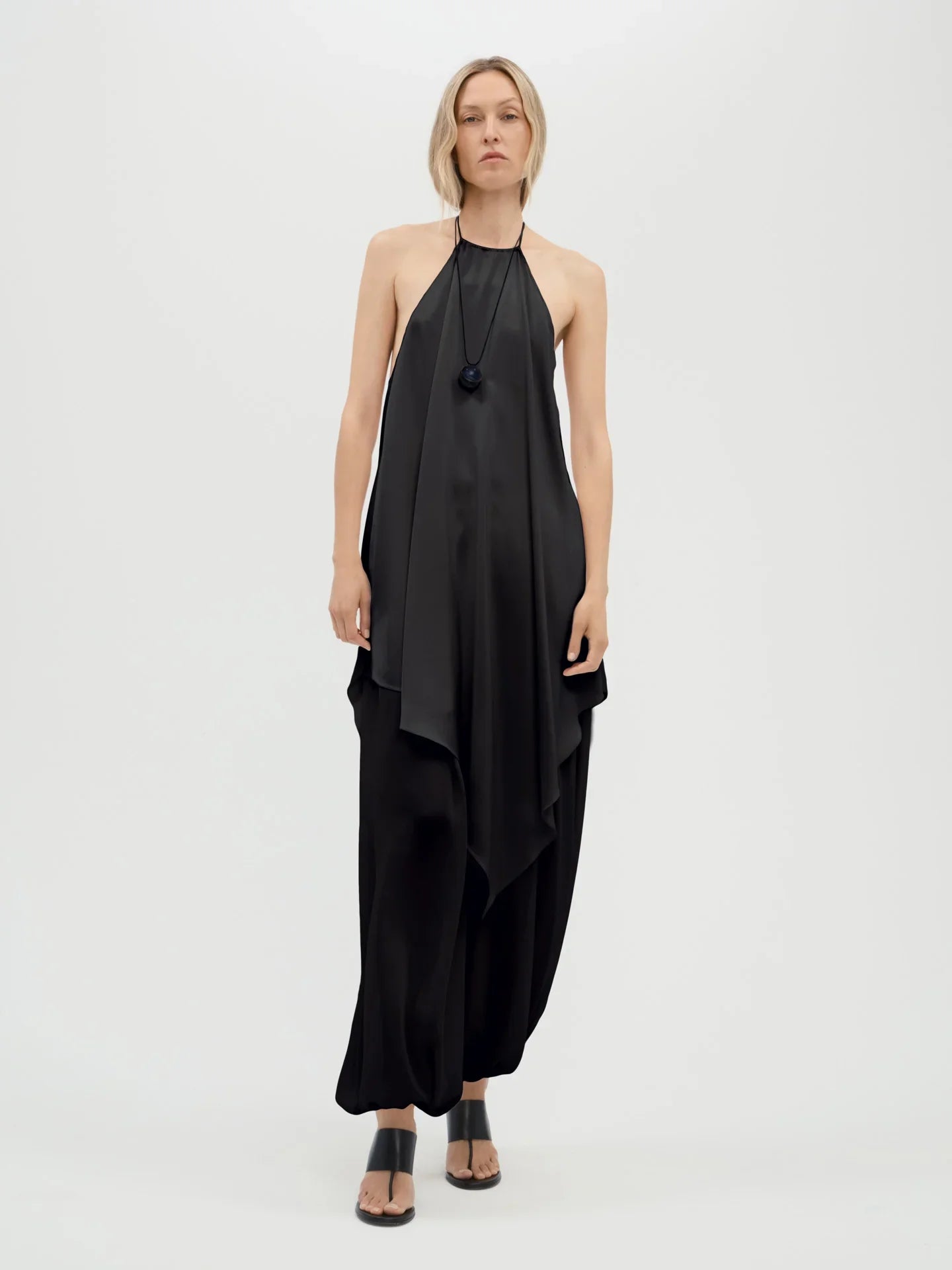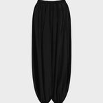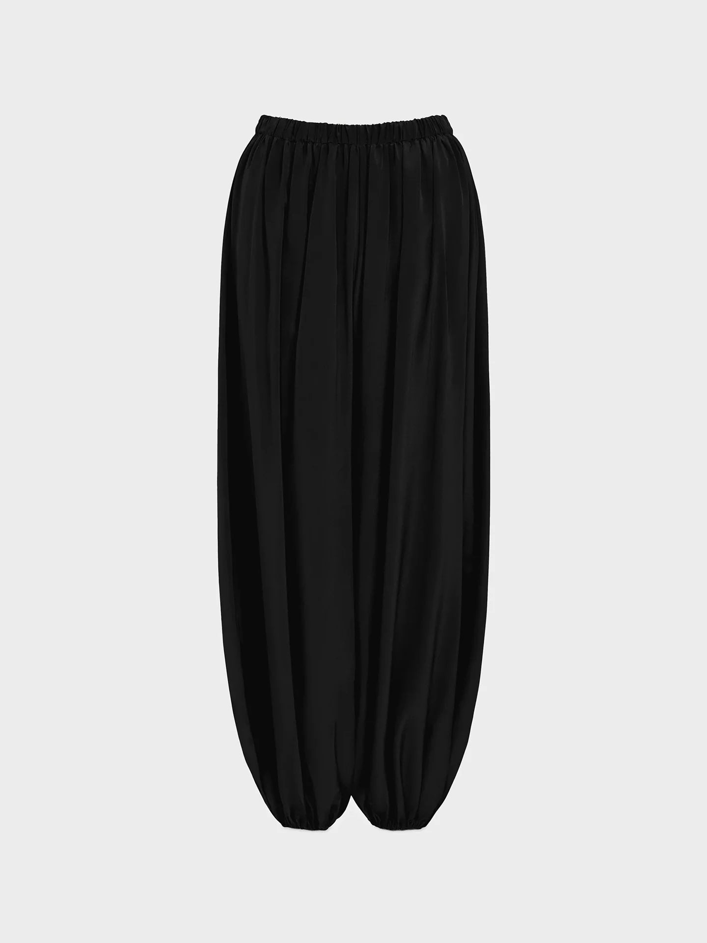 Voluminous and subtly sheer pleated leg pants that gather and taper at the ankle. Cut from lightweight silk crepe de chine with a fluid drape, dry texture, and dry handfeel. The pants are complete with a mini-short lining and elastic waistband and leg openings for ease of wear.
