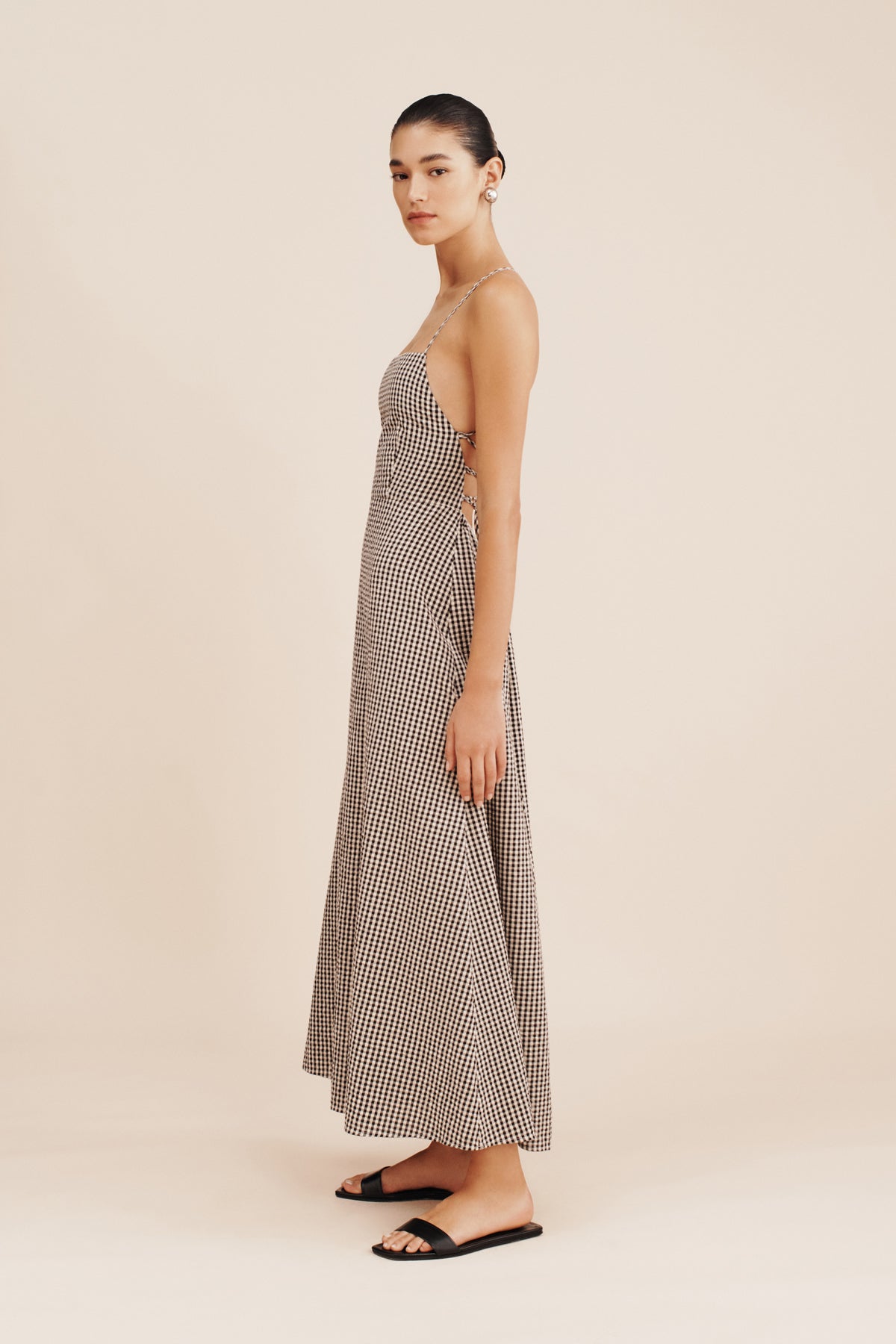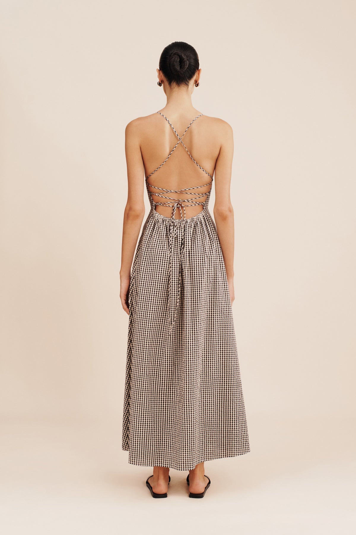 Patterned with nostalgic gingham, The Lori Dress is a statement piece perfect for both day and evening wear. It features a flattering square neckline, elasticated back and free-flowing maxi skirt. It turns to reveal a stunning open back with an adjustable tie feature.