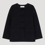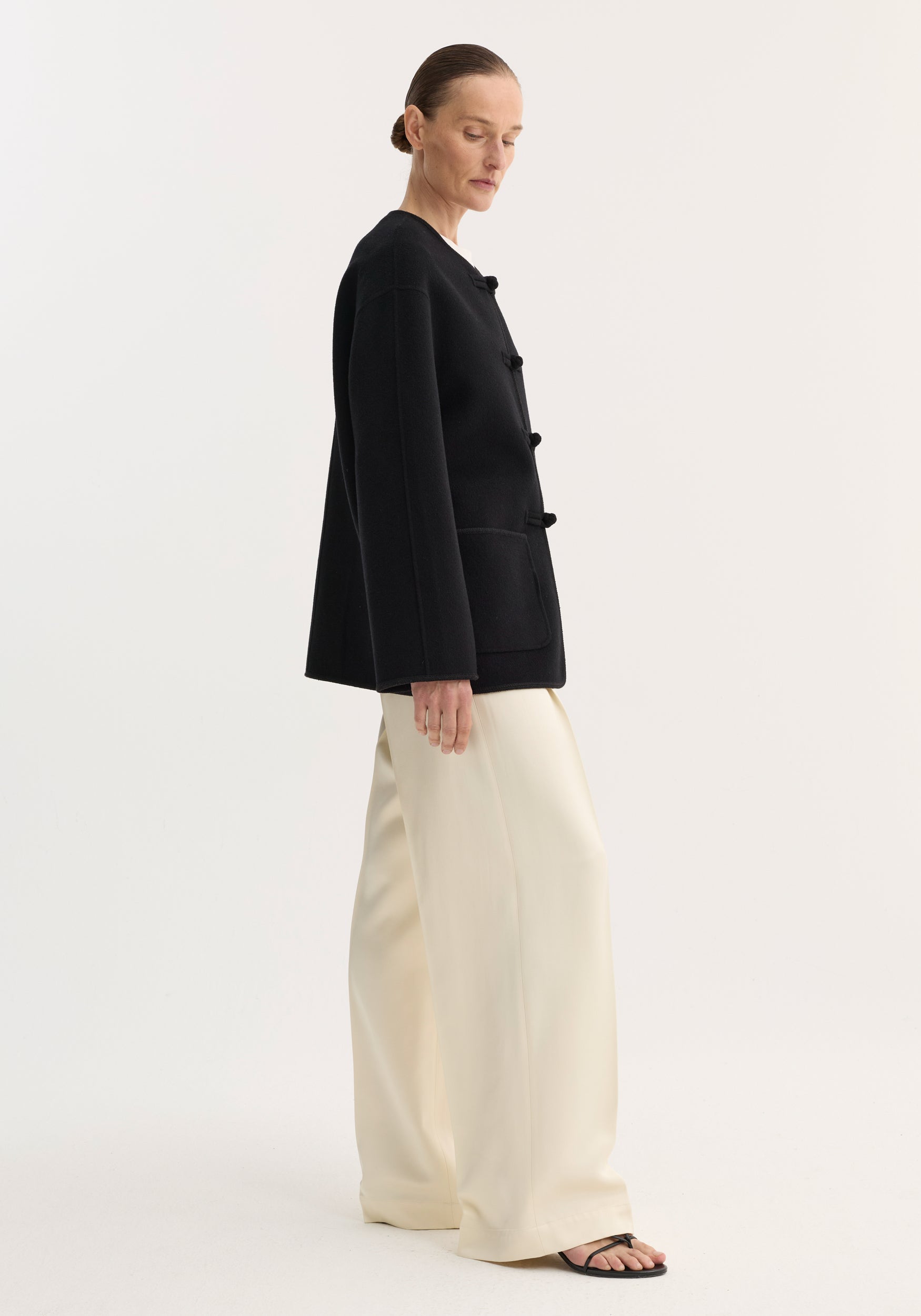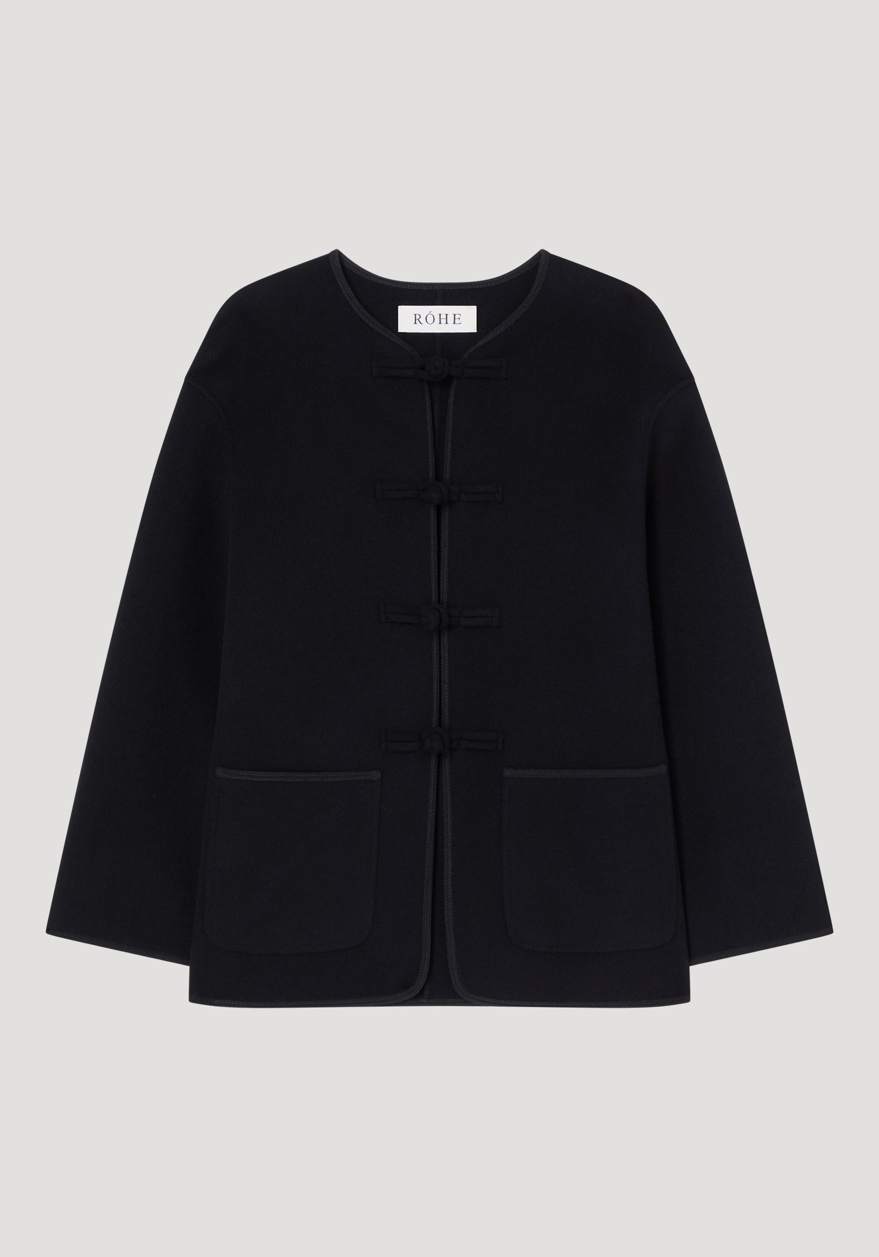 This double-faced wool jacket features pankou knot closures, a traditional fastening technique rooted in Chinese garment construction. Embroidered edges and patch pockets add artisanal detail, creating a striking silhouette for any occasion.