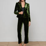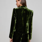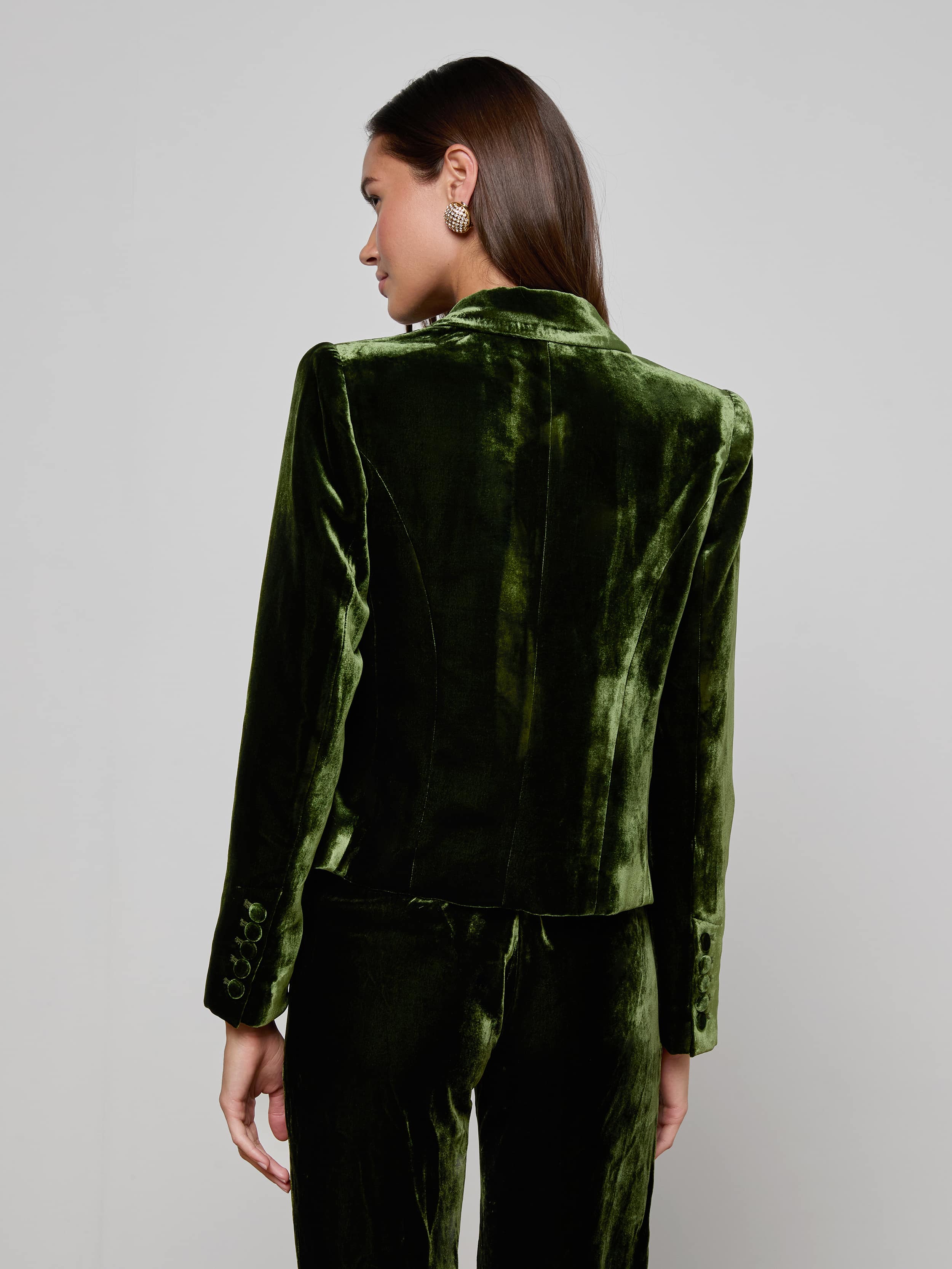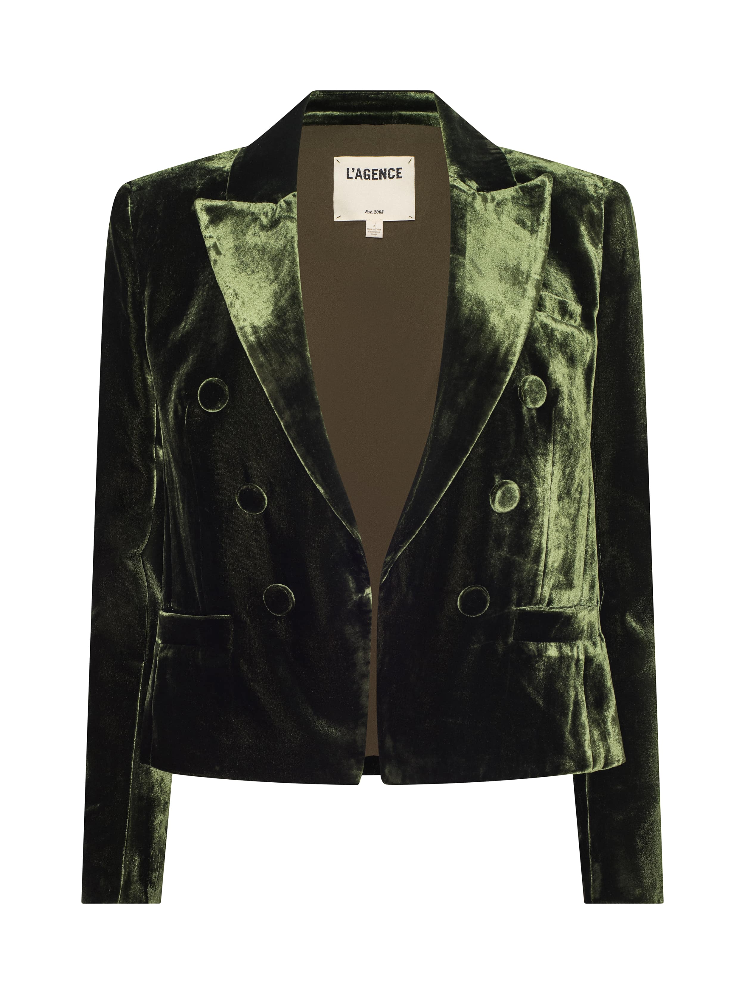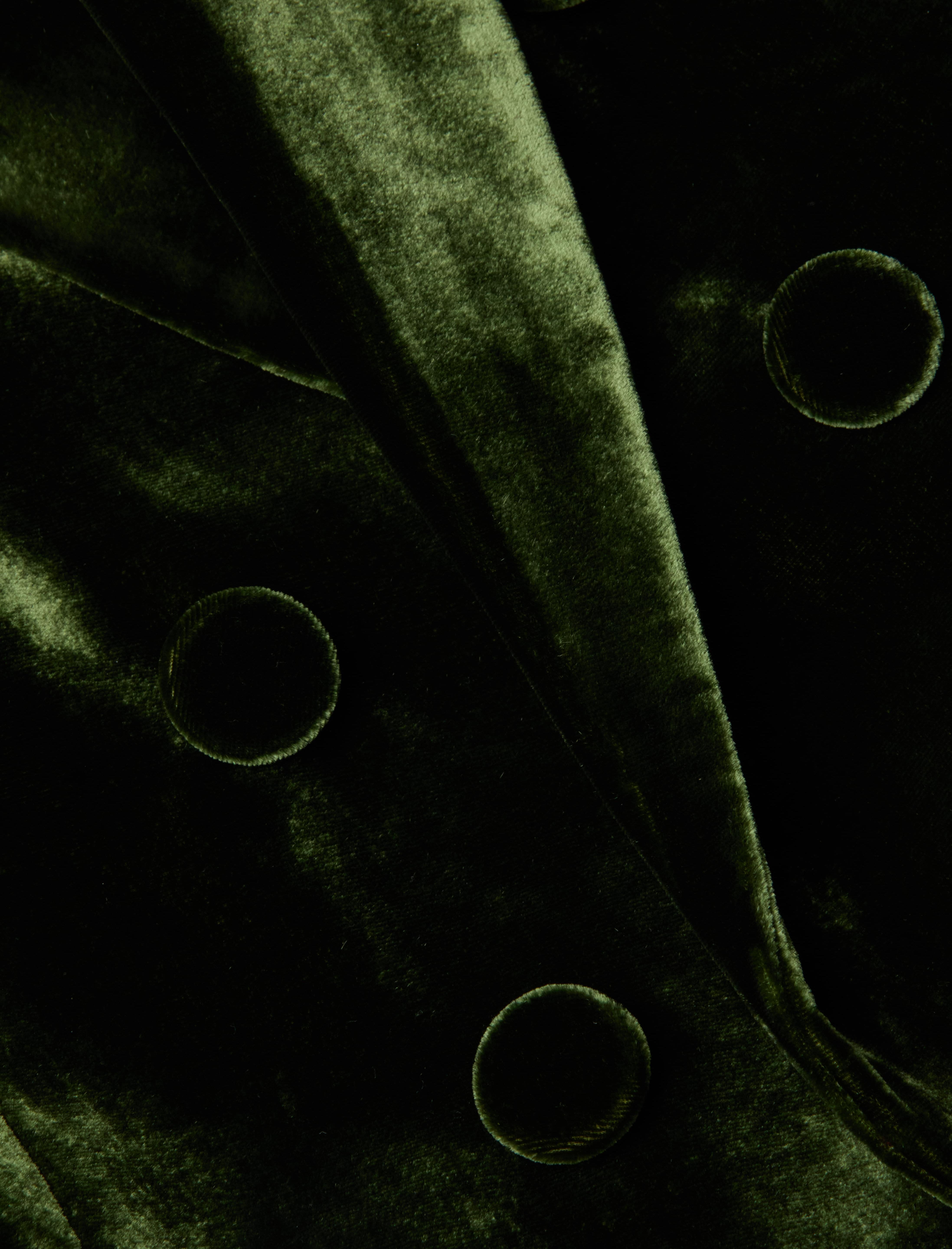 Our bestselling open-front Brooke features a flattering, tapered fit. This sharp, double-breasted blazer is now back in plush olive velvet blended with silk for a subtle, liquid sheen. Pair with its matching trousers or style with jeans for downtown cool.