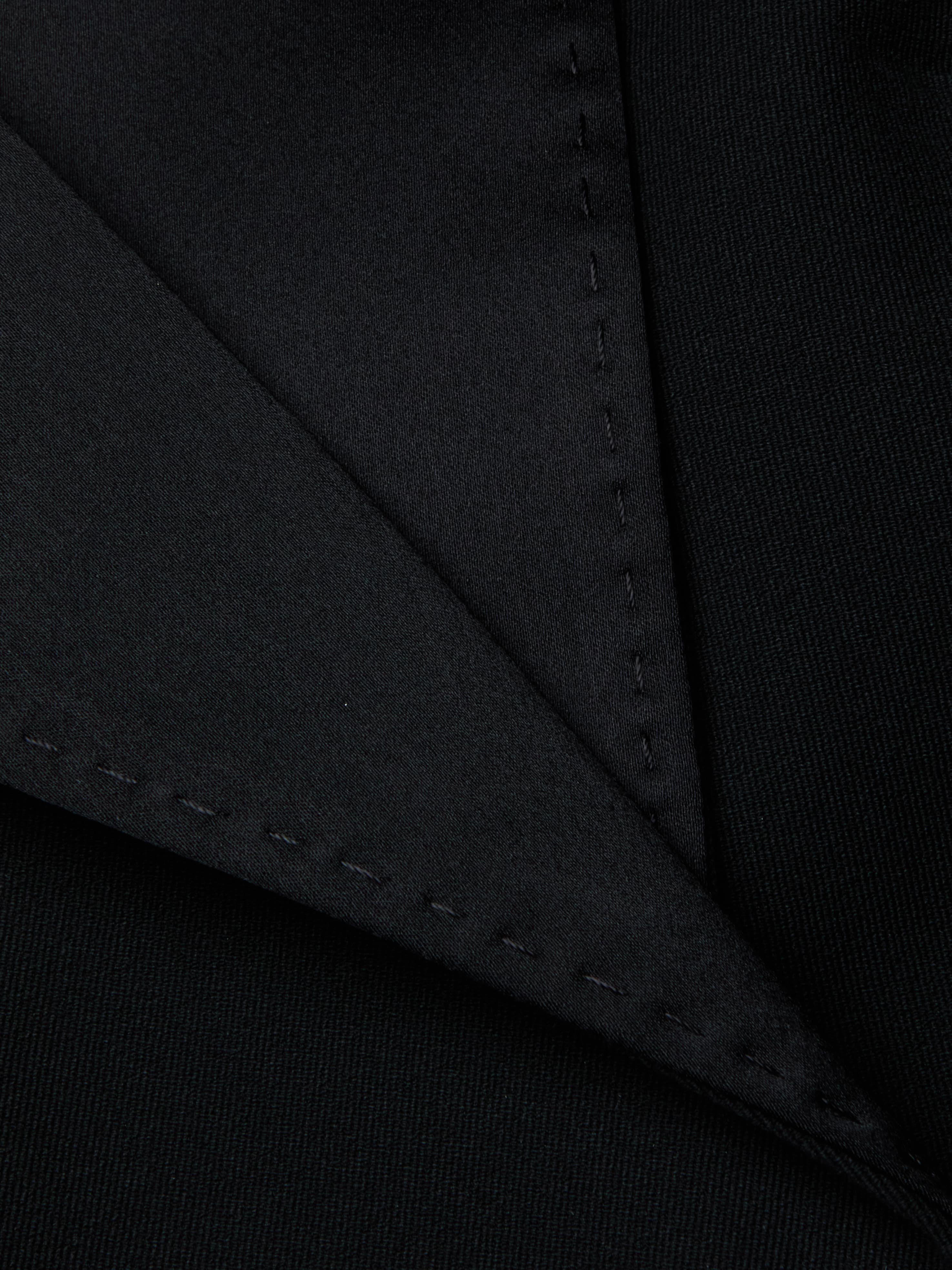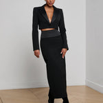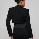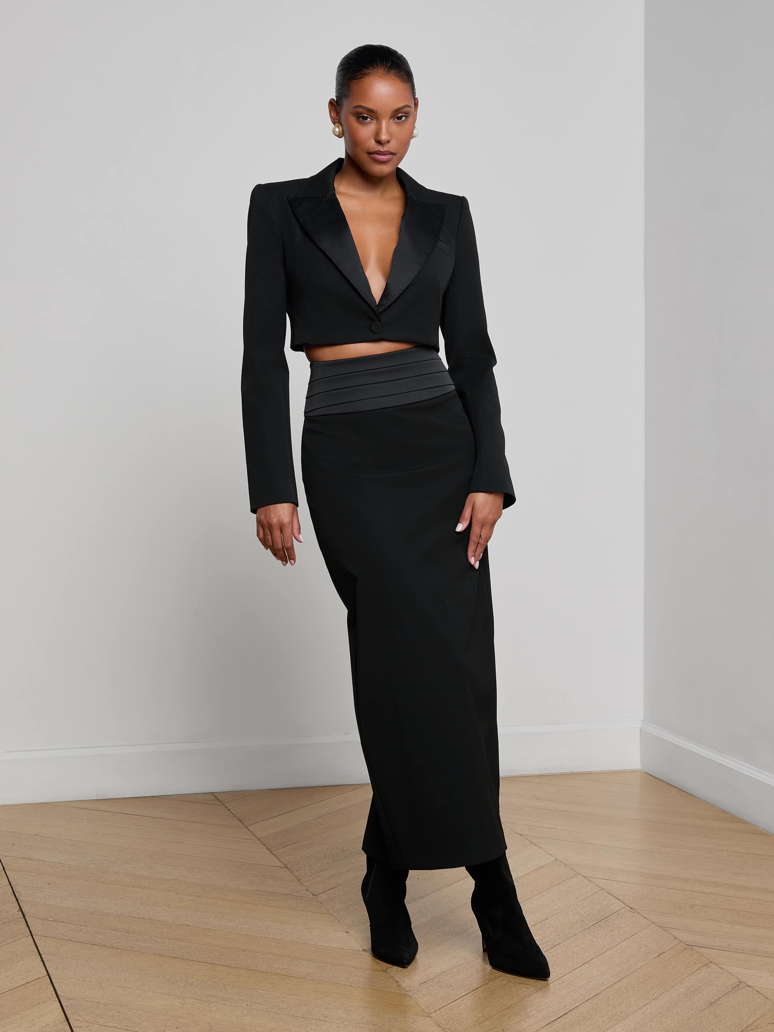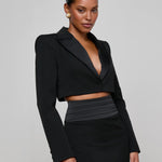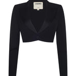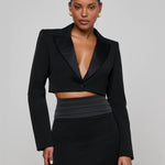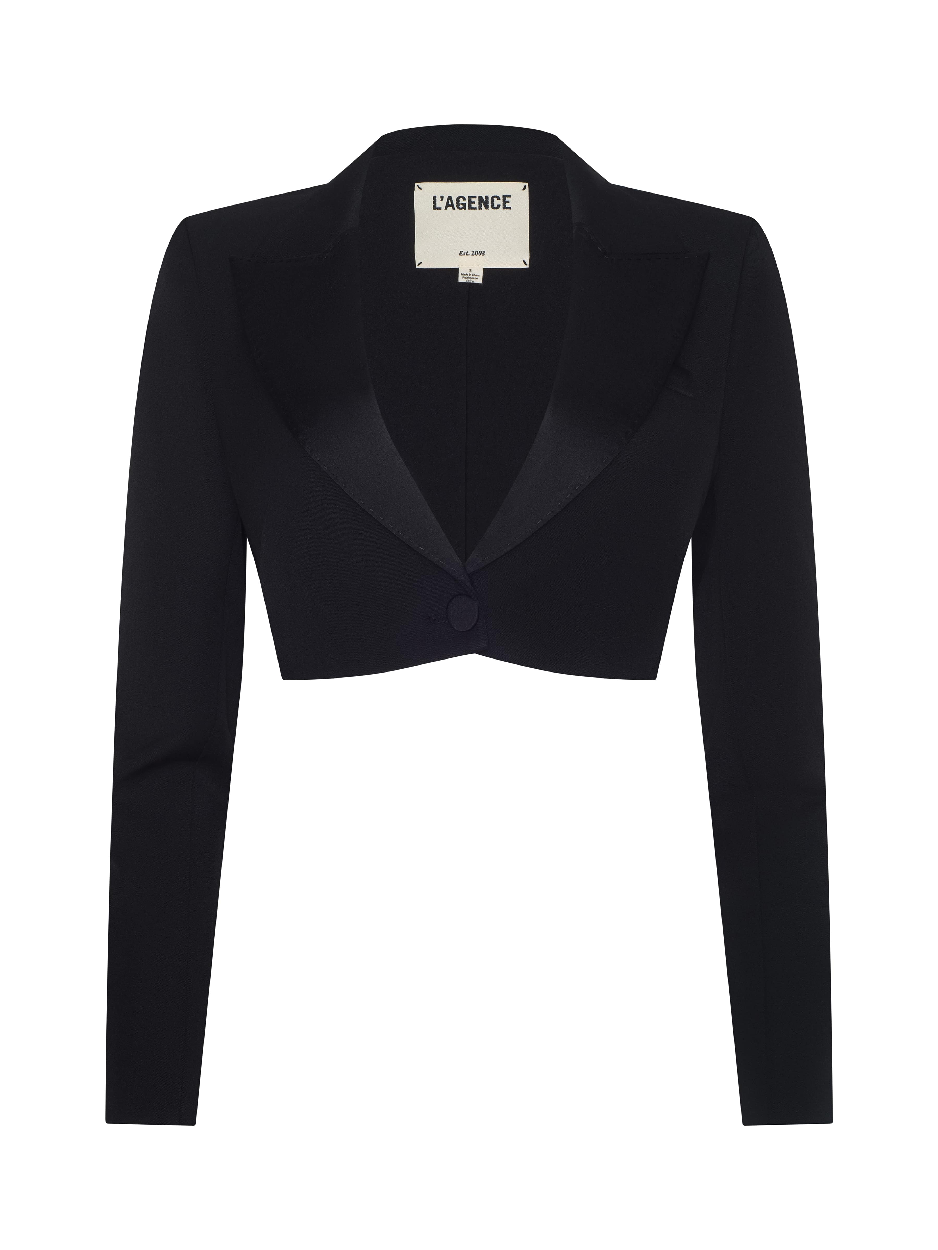 Eveningwear redefined, the Daxton blazer stuns with a sharp cropped cut and glossy satin lapels. Anchored by a single button, it’s the perfect partner to high-waisted pants for a look that’s modern and magnetic at once.