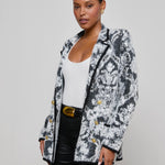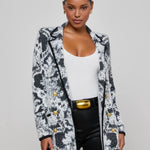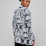 A jacquard knit blazer that fuses plush texture with sharp tailoring, finished with gold buttons for a luxe edge. The oversized boyfriend fit and knit fabrication keep the Eileen easy to wear. Pair it with leather trousers for after-dark polish, denim for daytime chic, or layer over a slip dress for a high-fashion finish.