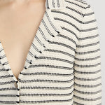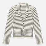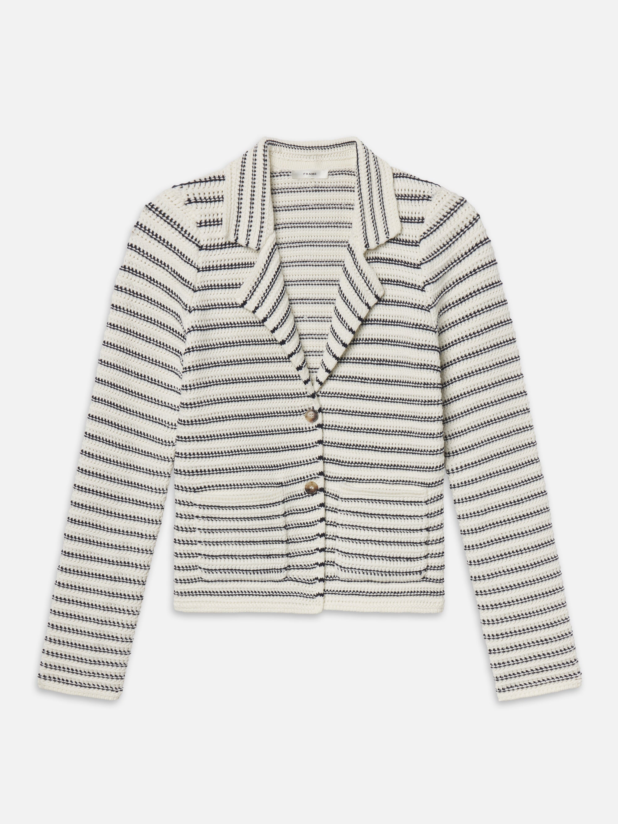 The Crochet Blazer is crafted from 100% cotton with a textured open-knit construction, reimagined in a new seasonal stripe for fresh dimension. Tailored with a relaxed structure, it delivers an effortless balance of polish and ease.
