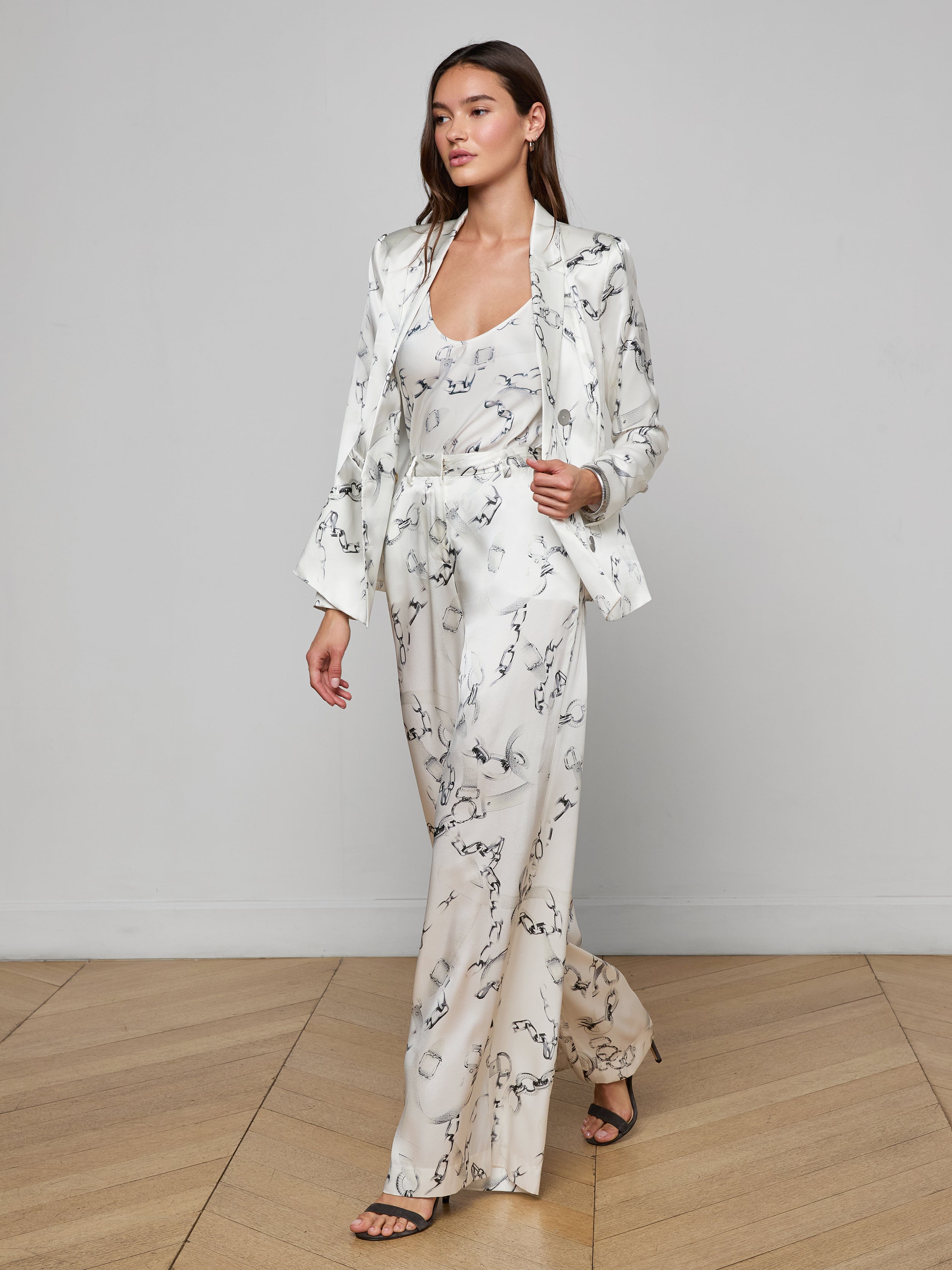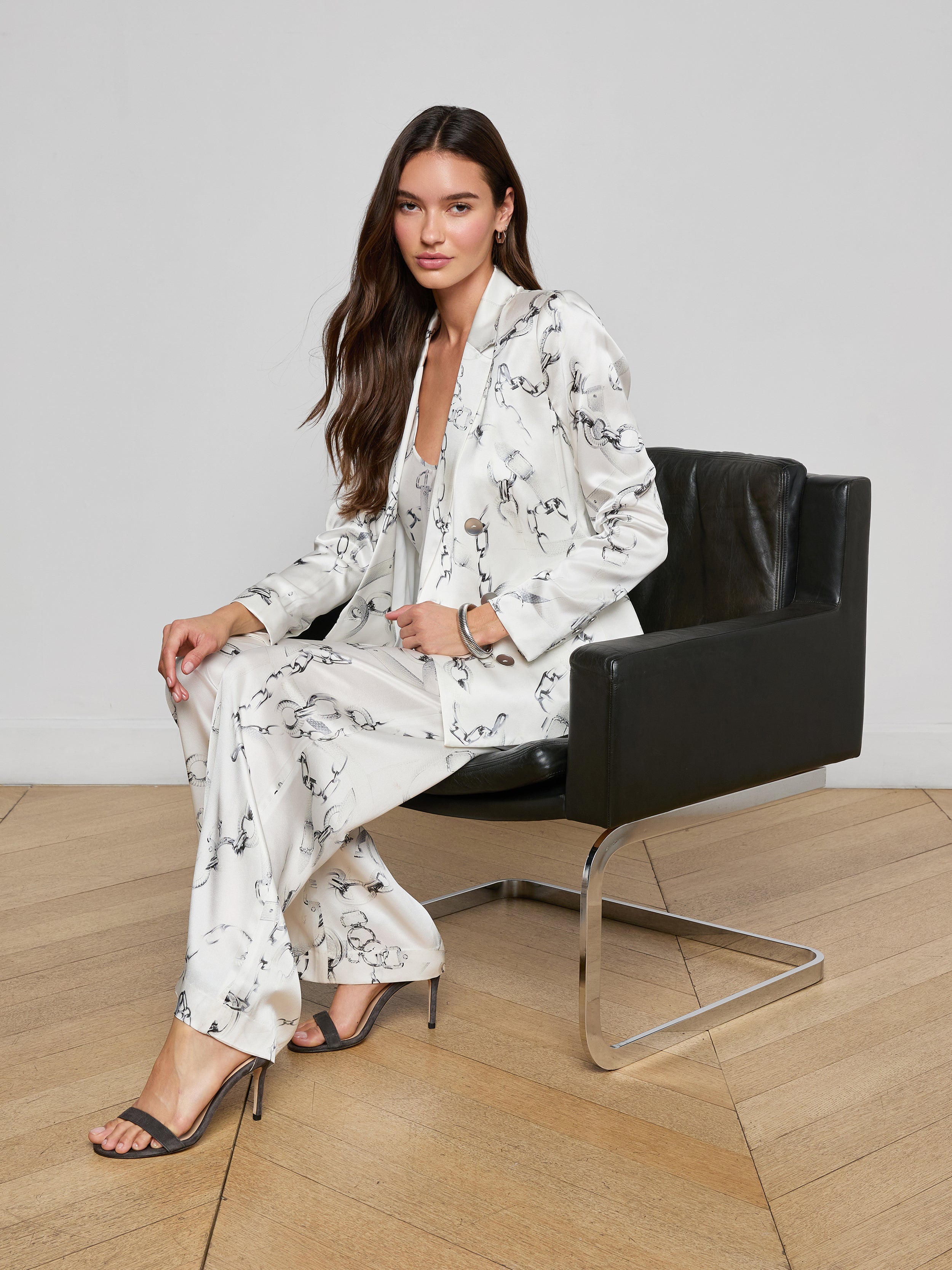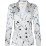 Subtle feminine shaping balances the crisp tailored details of the timeless Colin blazer. Double-breasted with gold buttons, it’s a tailored piece designed to go from desk-to-drinks in style. Now back in ivory with a chain print.