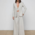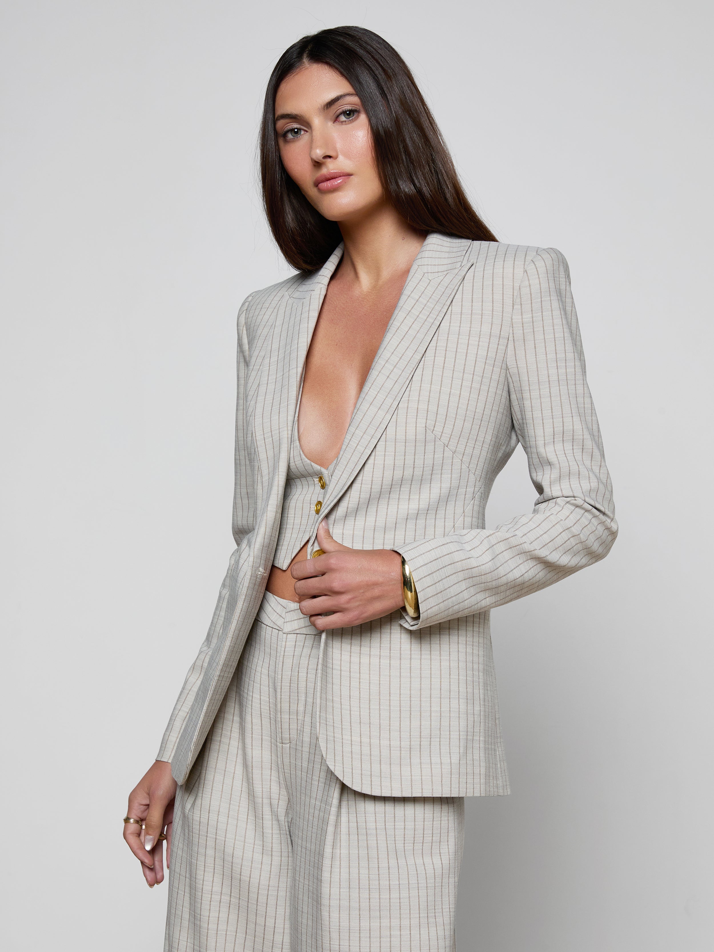The Sheila single-breasted blazer is back in gray with a sleek tan pinstripe. The long lines of this silhouette are designed to hit below the hip for a streamlined look.