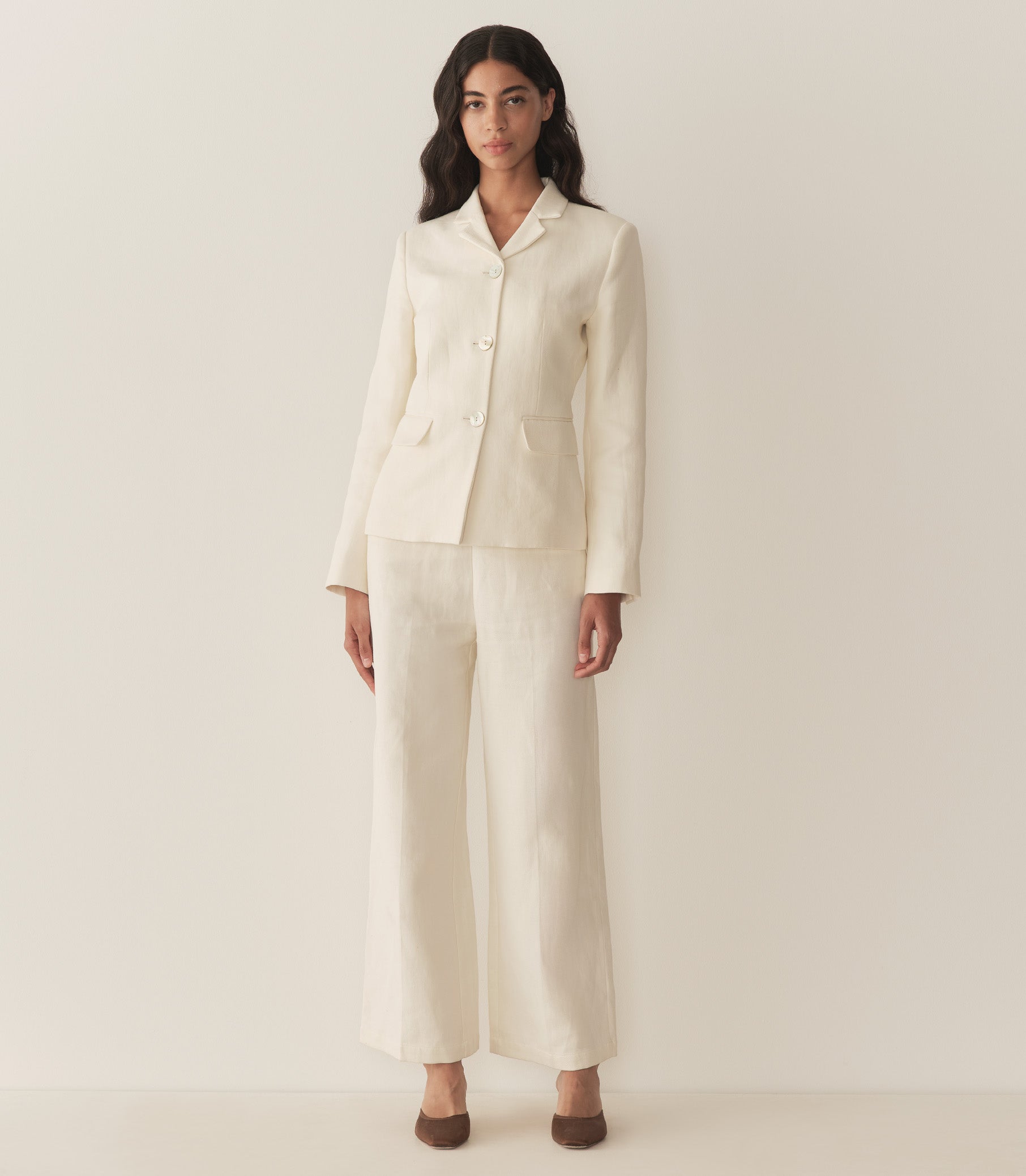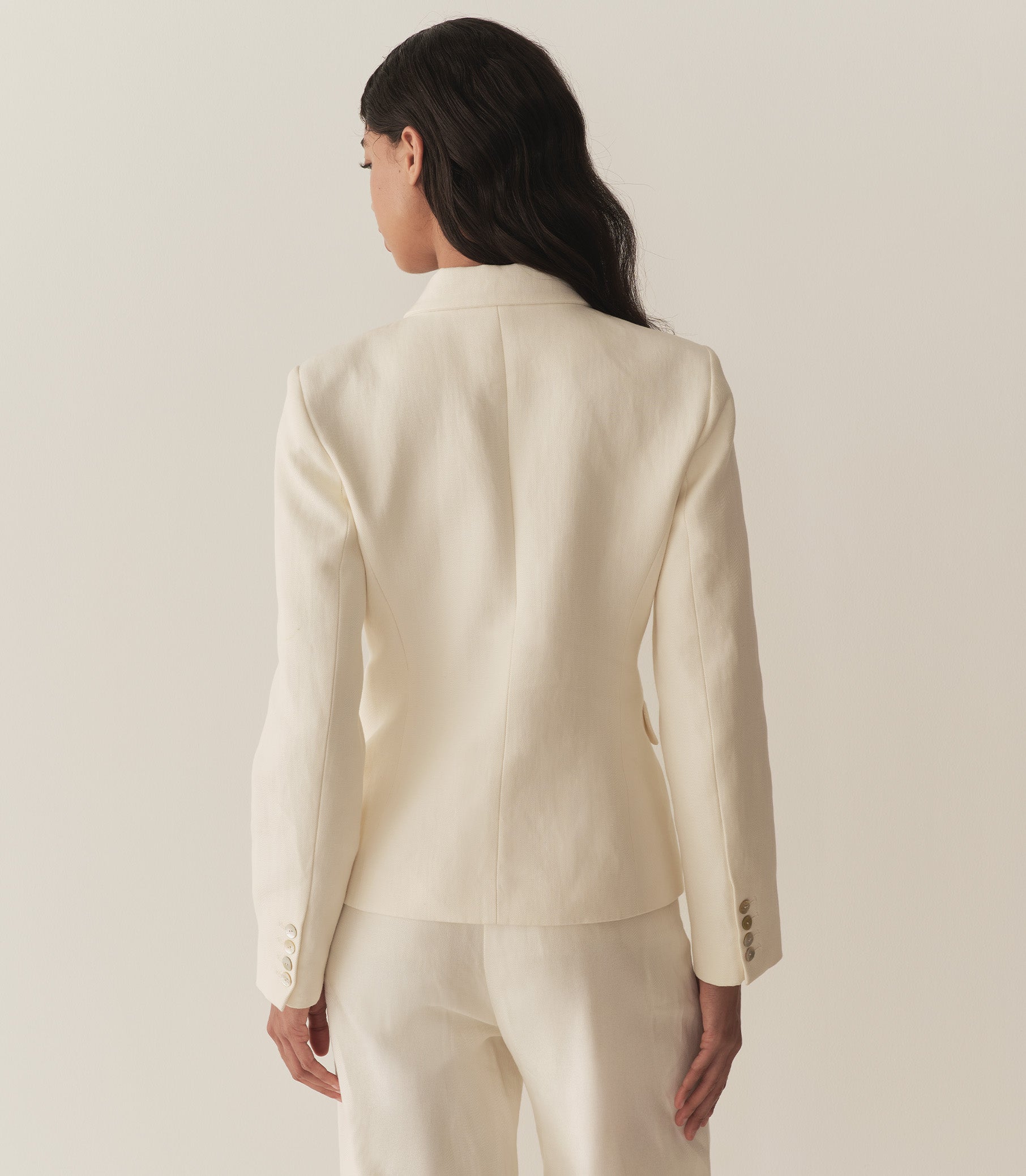 Tailored in a lightweight, organic cotton-linen blend twill, the ‘60s-inspired DÔEN Heirloom Lennon Blazer features a slim, single-breasted cut, a collar with a notched lapel, full-length sleeves, faux welt pockets, and shell buttons.