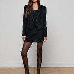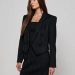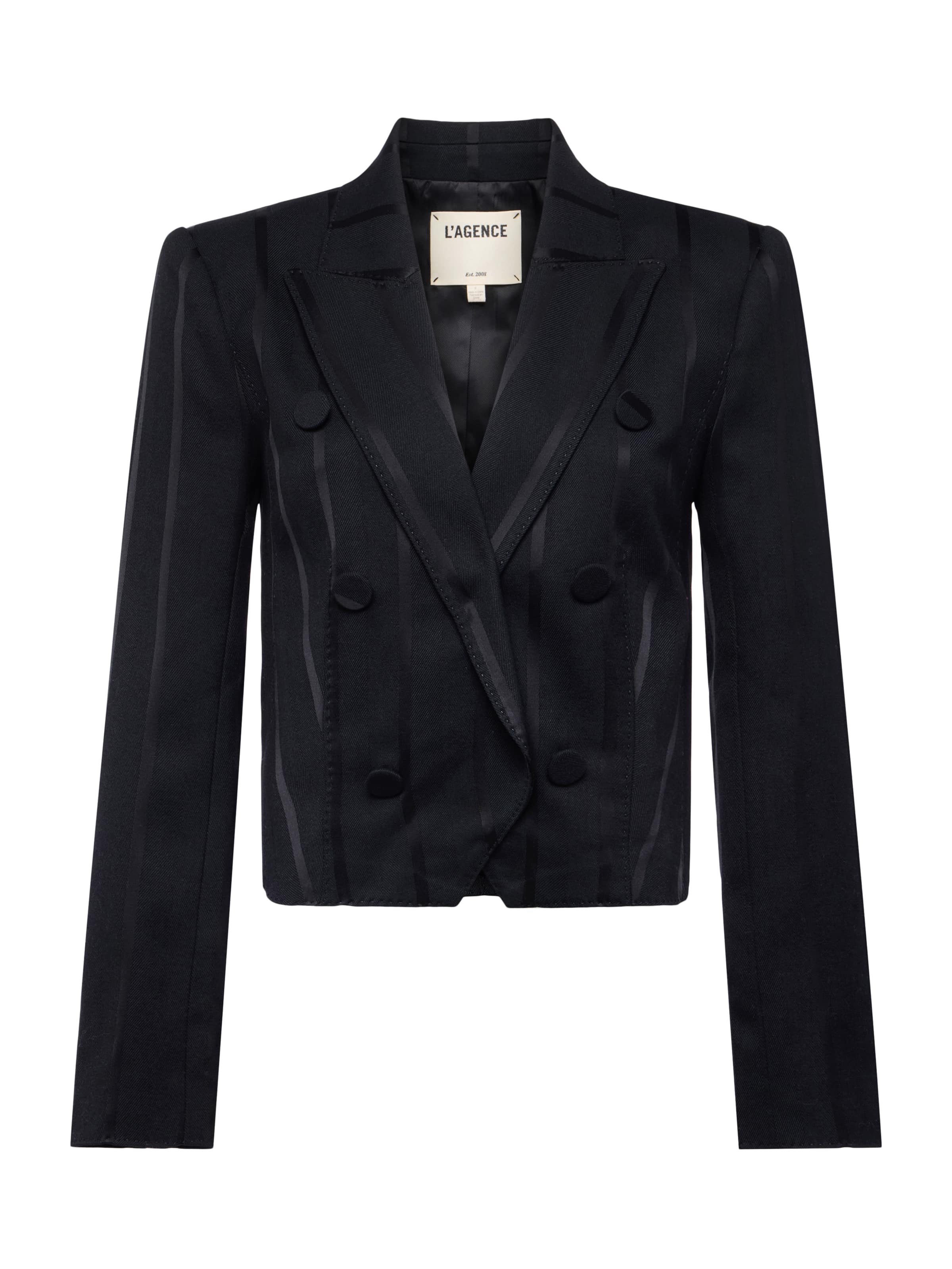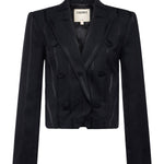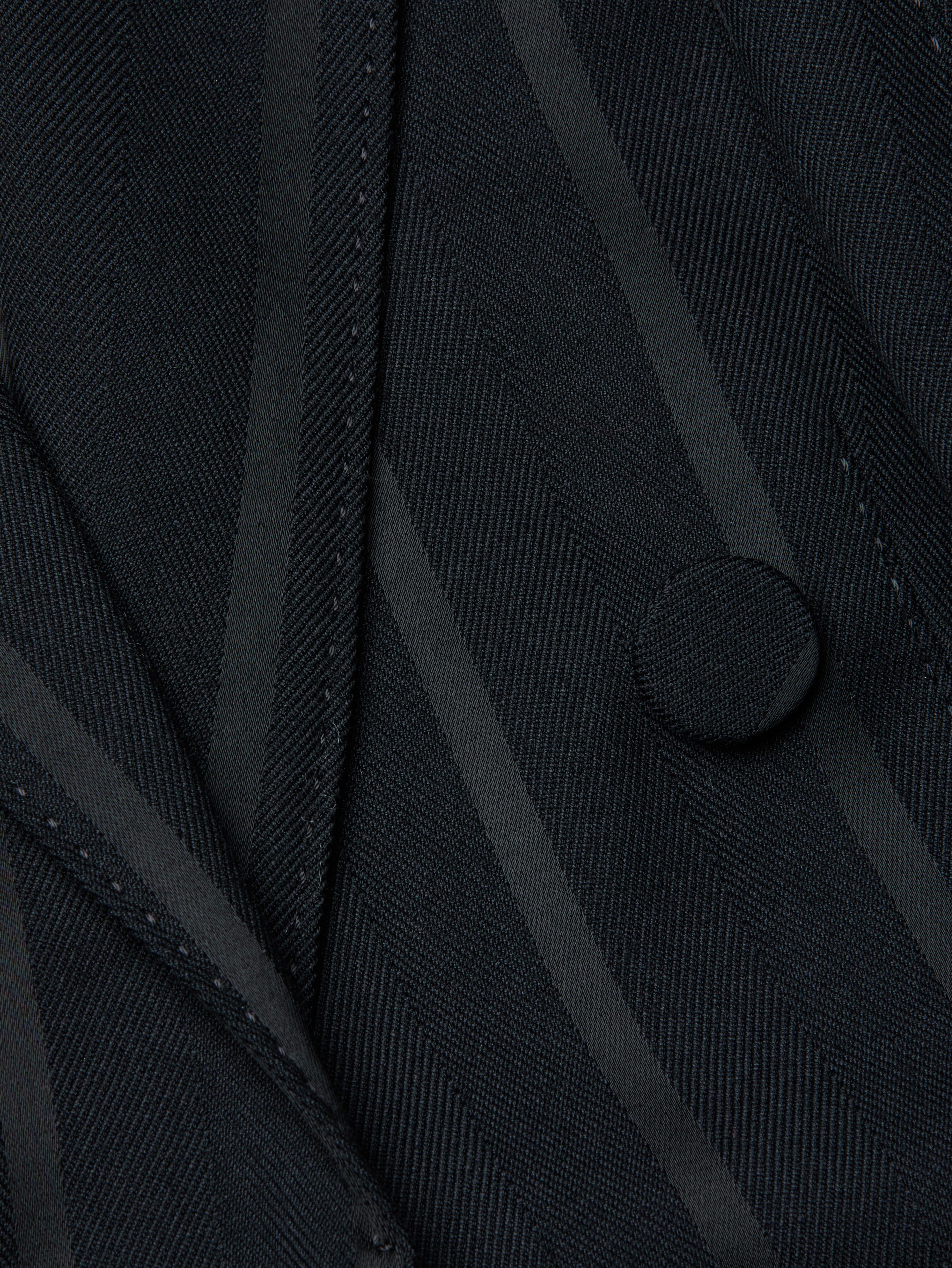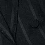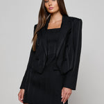 This style was featured in our Fall ‘25 NYFW presentation. This cropped and boxy blazer offers a fresh take on evening dressing. Crafted in a lustrous black fabric with tonal vertical stripes, it plays with texture for a subtle yet striking effect. The sharp shoulders and double-breasted front create clean lines, while the shorter cut adds a bold twist. Perfect over a slip dress, tailored trousers, or high-waisted denim.