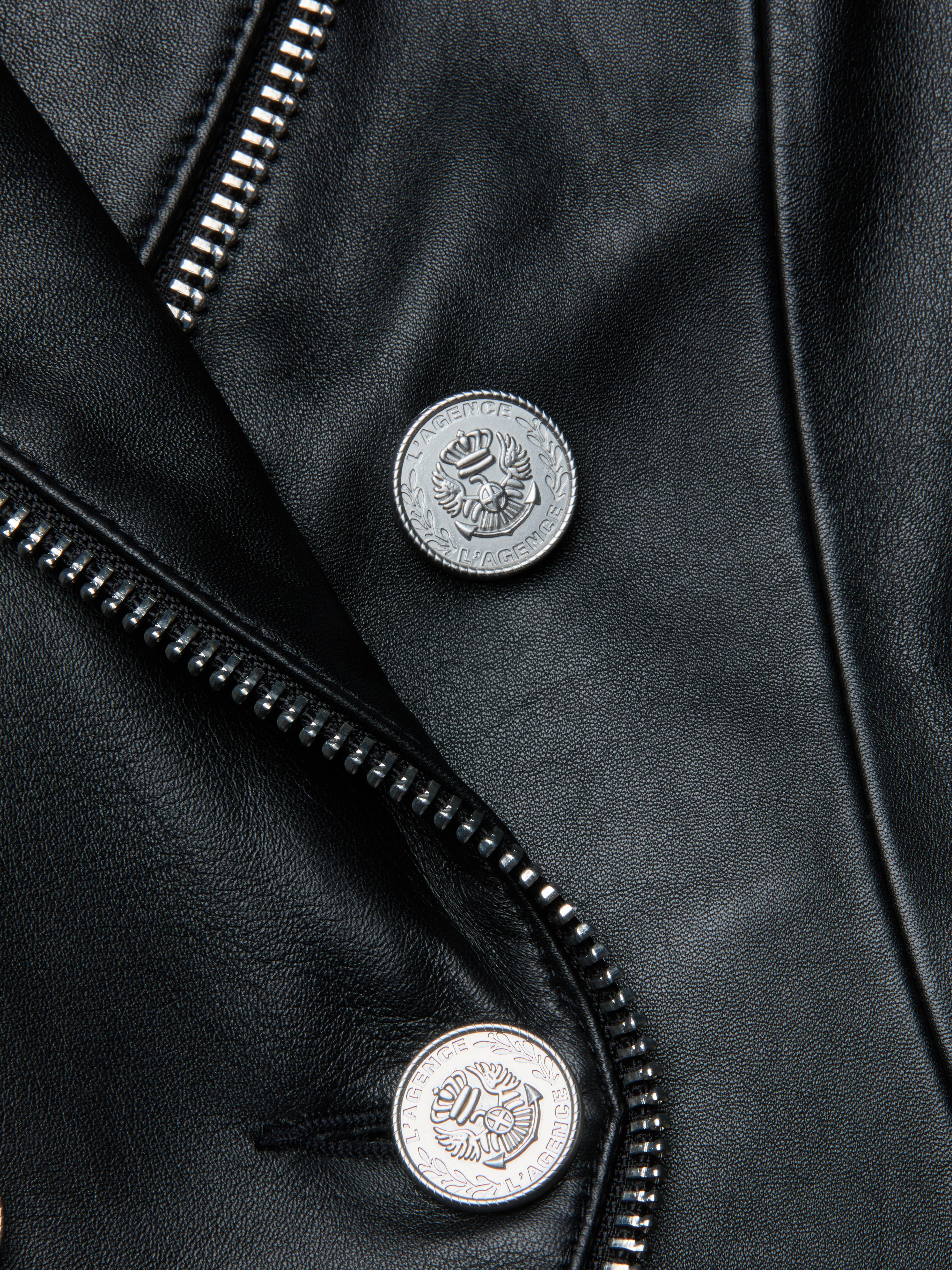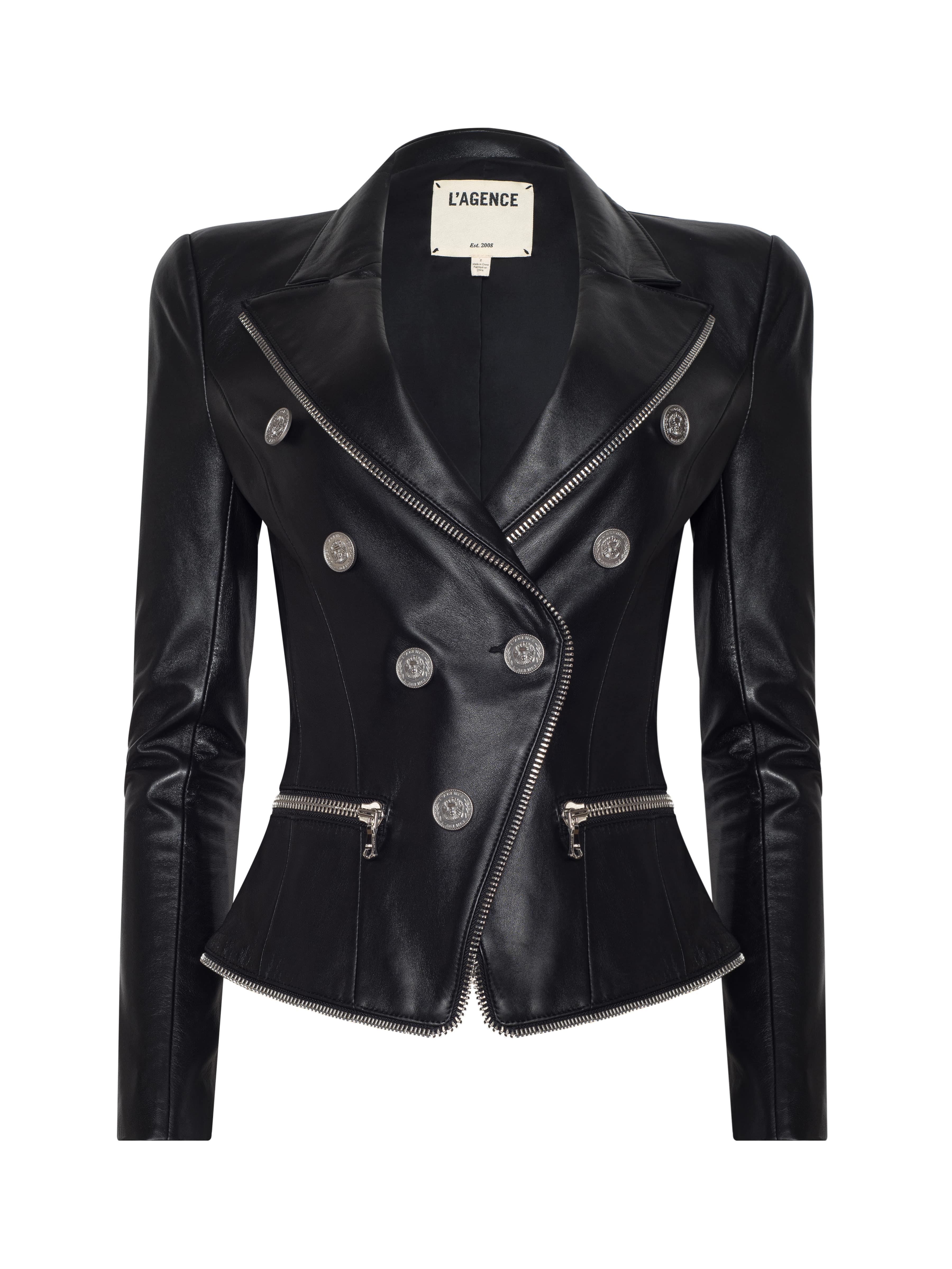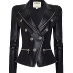 Sculpted and striking, the Ottilie leather blazer in black is the definition of power dressing. Matte buttons and exposed zips infuse it with edge, while precision tailoring contours the waist for a sharp, hourglass silhouette. It's part statement, part armor, and it’s made to turn heads.