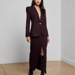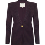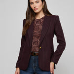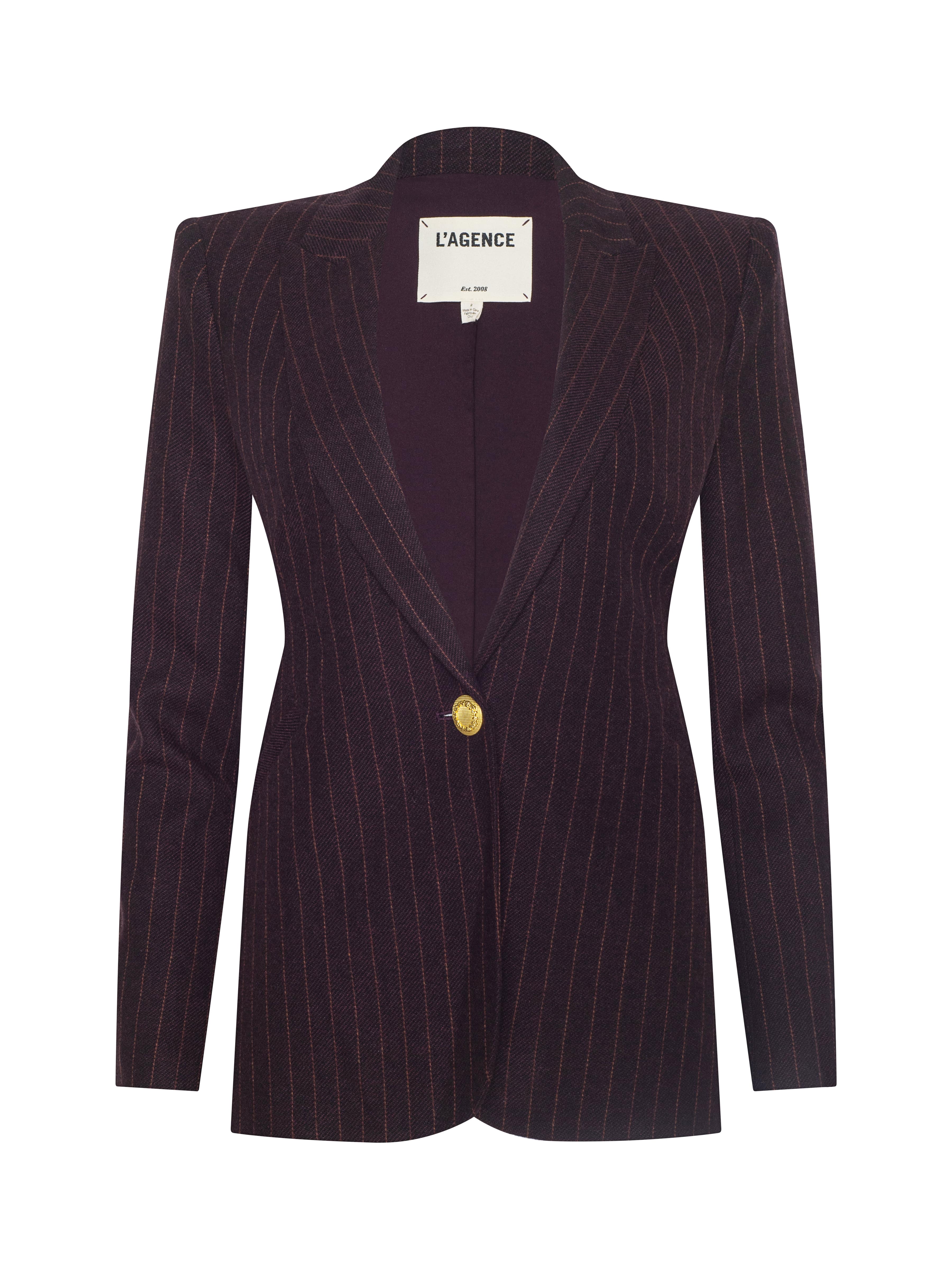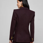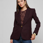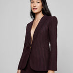 The Sheila single-breasted blazer is back in a sleek burgundy pinstripe. The long lines of this silhouette are designed to hit below the hip for a streamlined look.