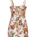 • Bustier mini dress in vintage floral designed for a fitted look at bodice with a slightly a-line skirt