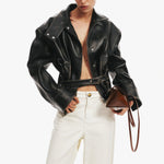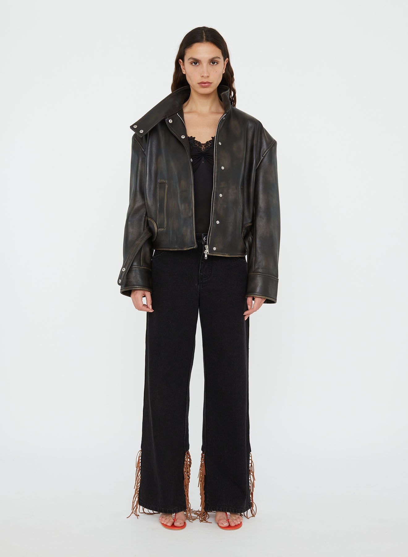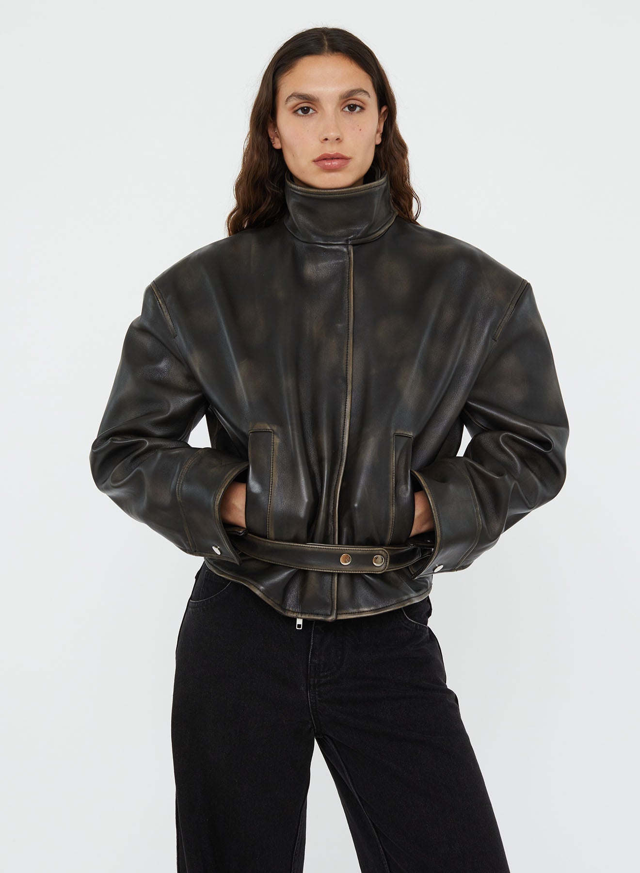 A sculptural outer layer crafted in distressed-effect Italian leather. Voluminous shoulders meet a high funnel neck and curved sleeve, cinched at the waist with a structured belt. Exaggerated in form yet refined in finish, the silhouette balances edge with elegance. Style with slouched denim and minimal heels.
