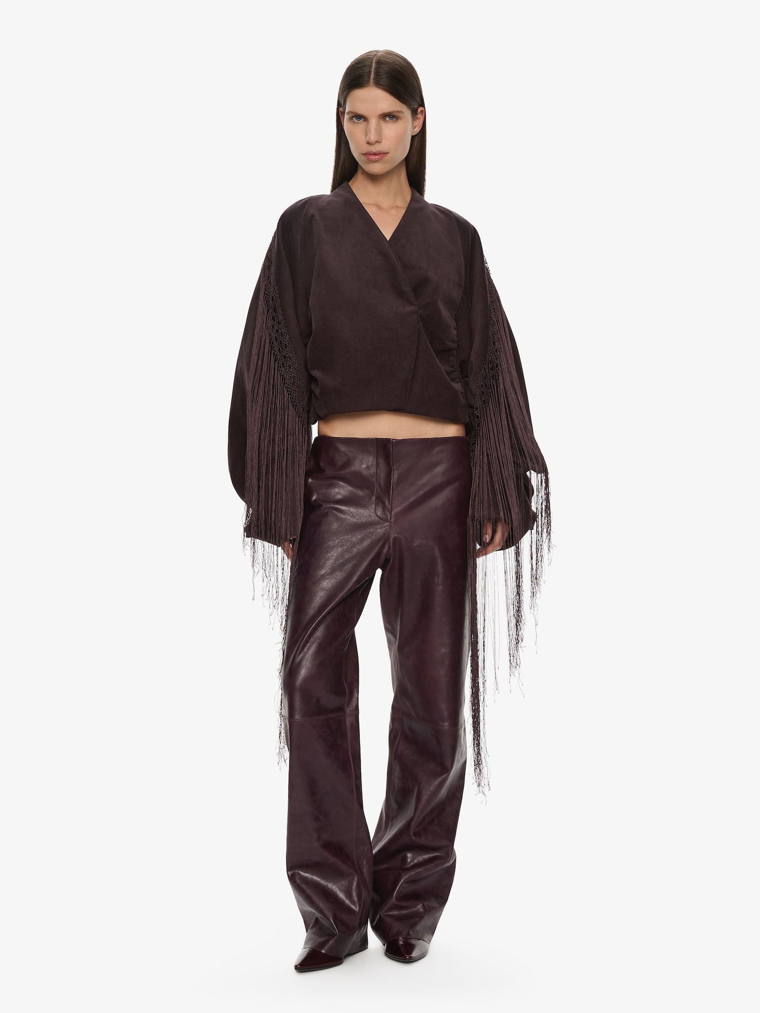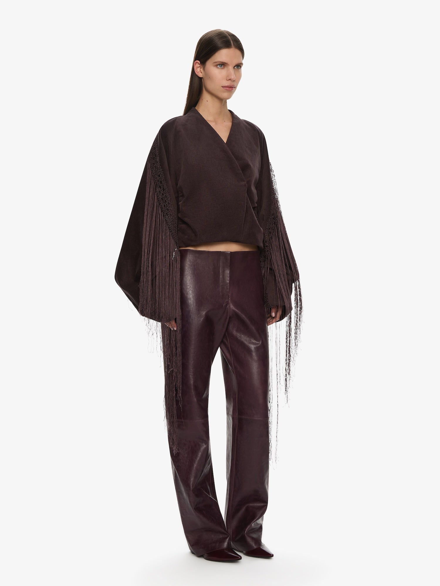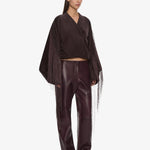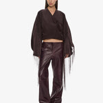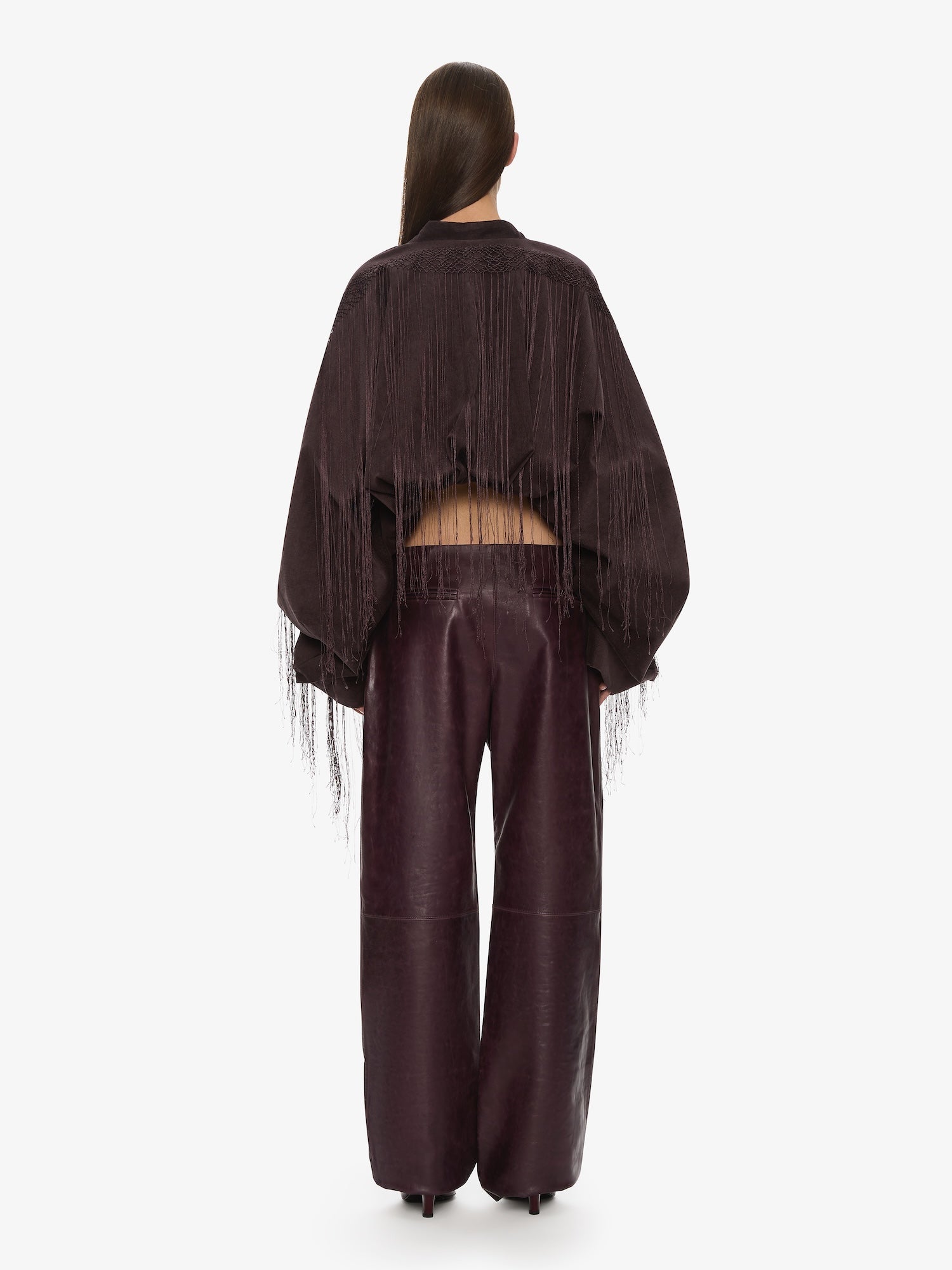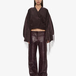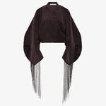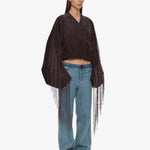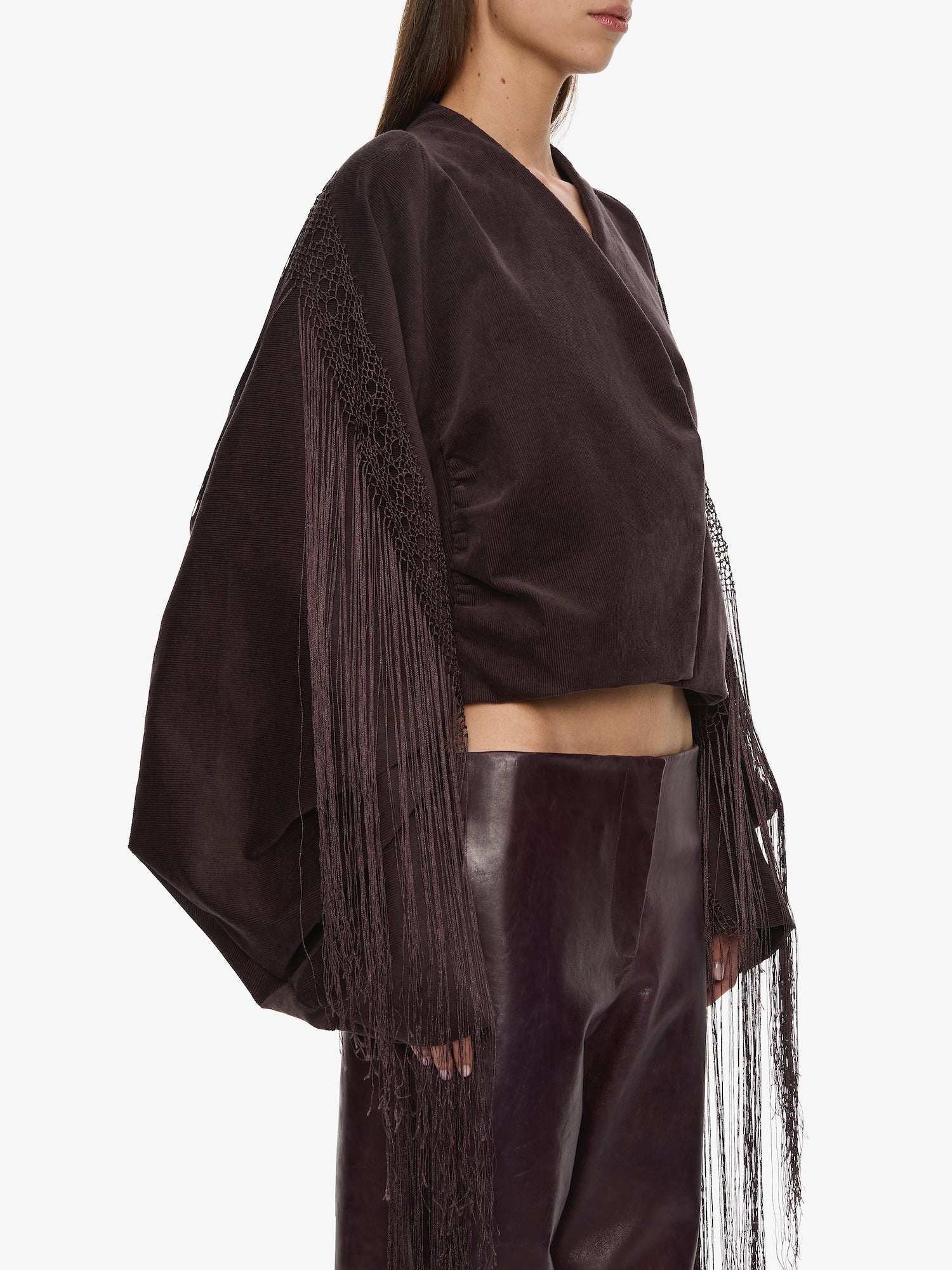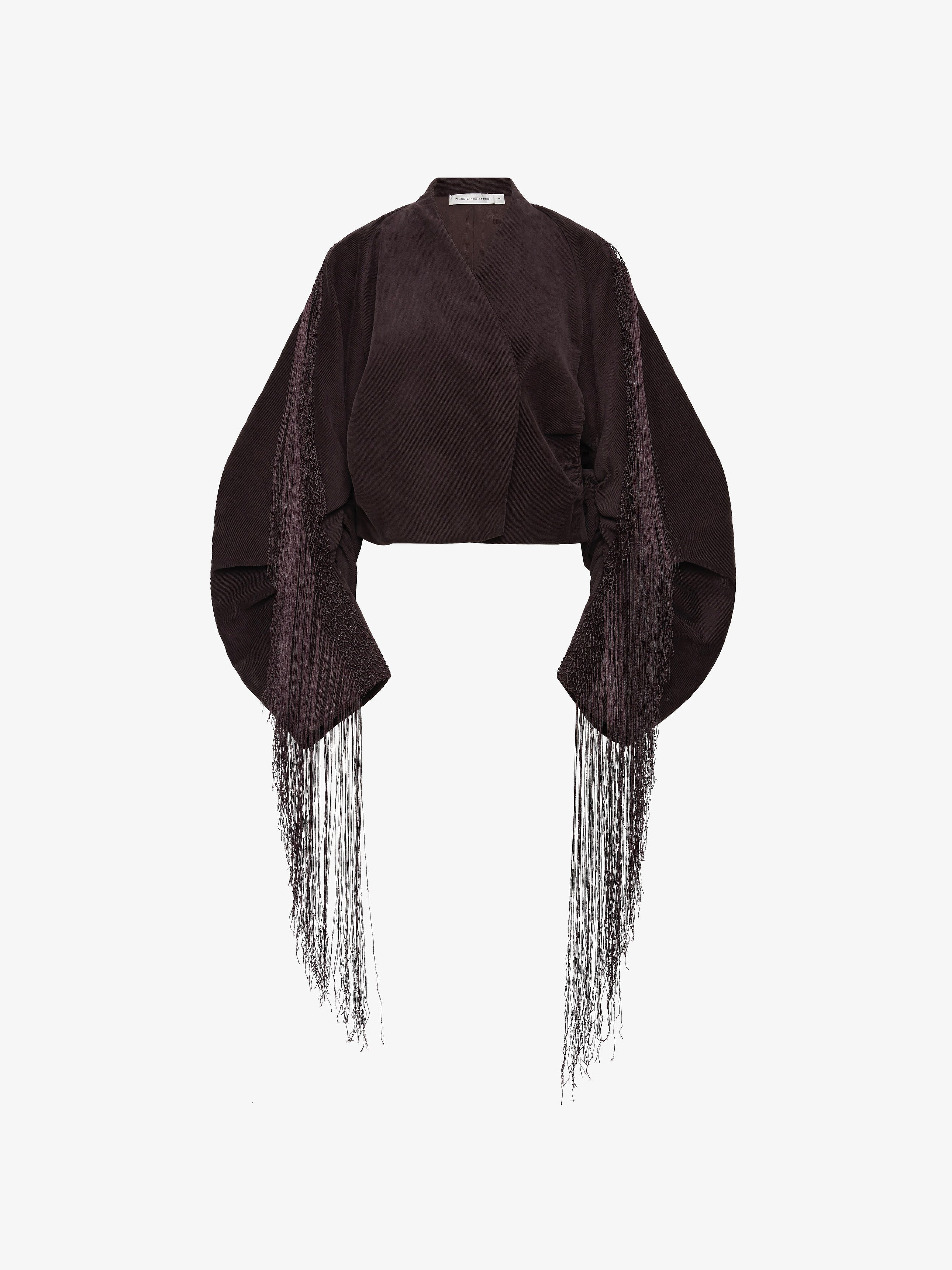 A cocoon-shaped jacket cut in corduroy, contrasted with precision pleating and long fringe that extends from the sleeves. Sculptural volume meets movement, balancing structure with fluid embellishment.