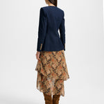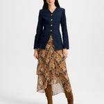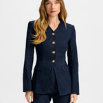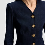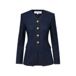 A refined take on the denim jacket. Expertly crafted from a premium stretch-denim blend, Cynthia is a single-breasted blazer featuring a darted bodice and angled hem that define the waist. A collarless V-neckline, front-flap pockets, and buttoned sleeves complete the look. Edgy yet polished, style it with a slim pant and heels for a sleek finish.