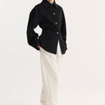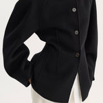 An architectural spring jacket crafted from double-faced wool, defined by a cinched waist and oversized sculptural sleeves. Finished with four button closures, side-seam welt pockets, and subtle front and back darts for a tailored, sculpted silhouette.