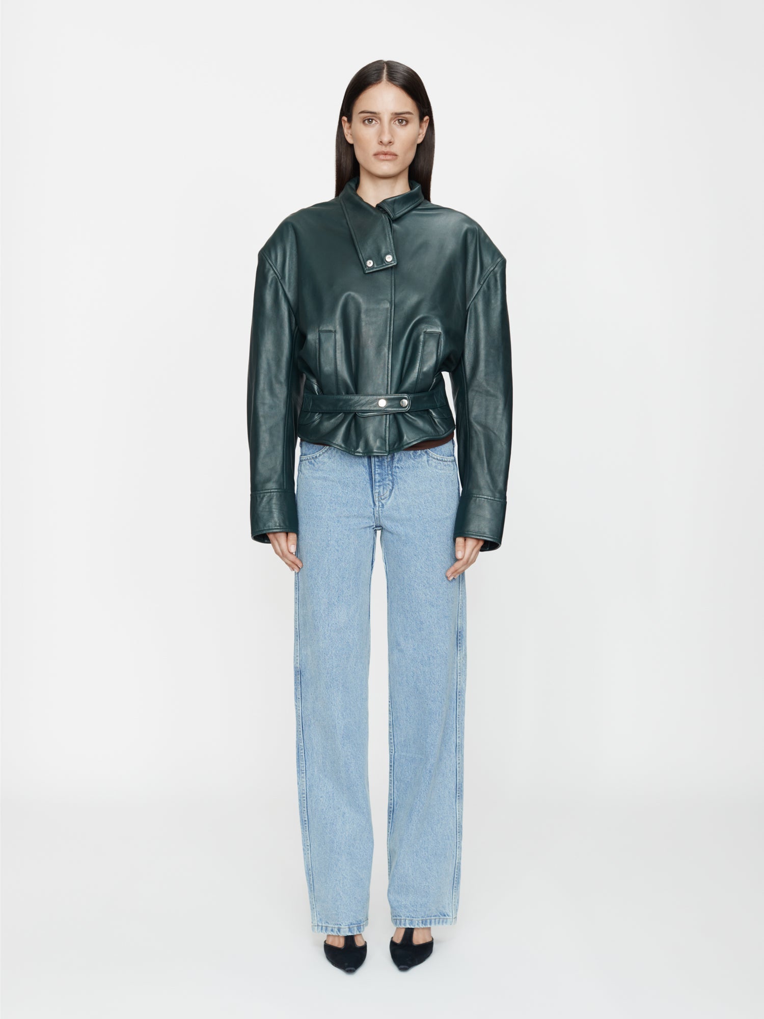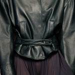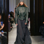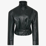 A sculptural outer layer crafted in premium Italian leather. Voluminous shoulders meet a high funnel neck and curved sleeve, cinched at the waist with a structured belt. Exaggerated in form yet refined in finish, the silhouette balances edge with elegance. Style with slouched denim and minimal heels.